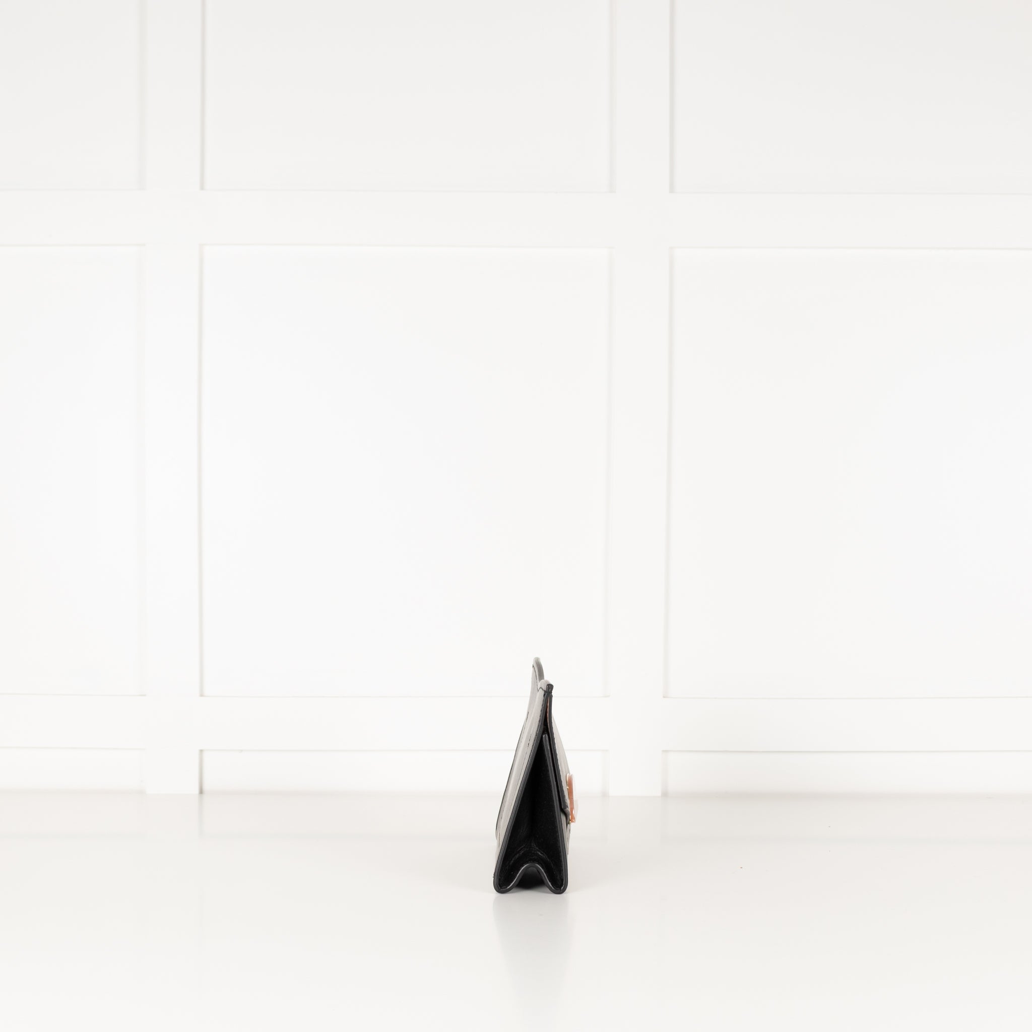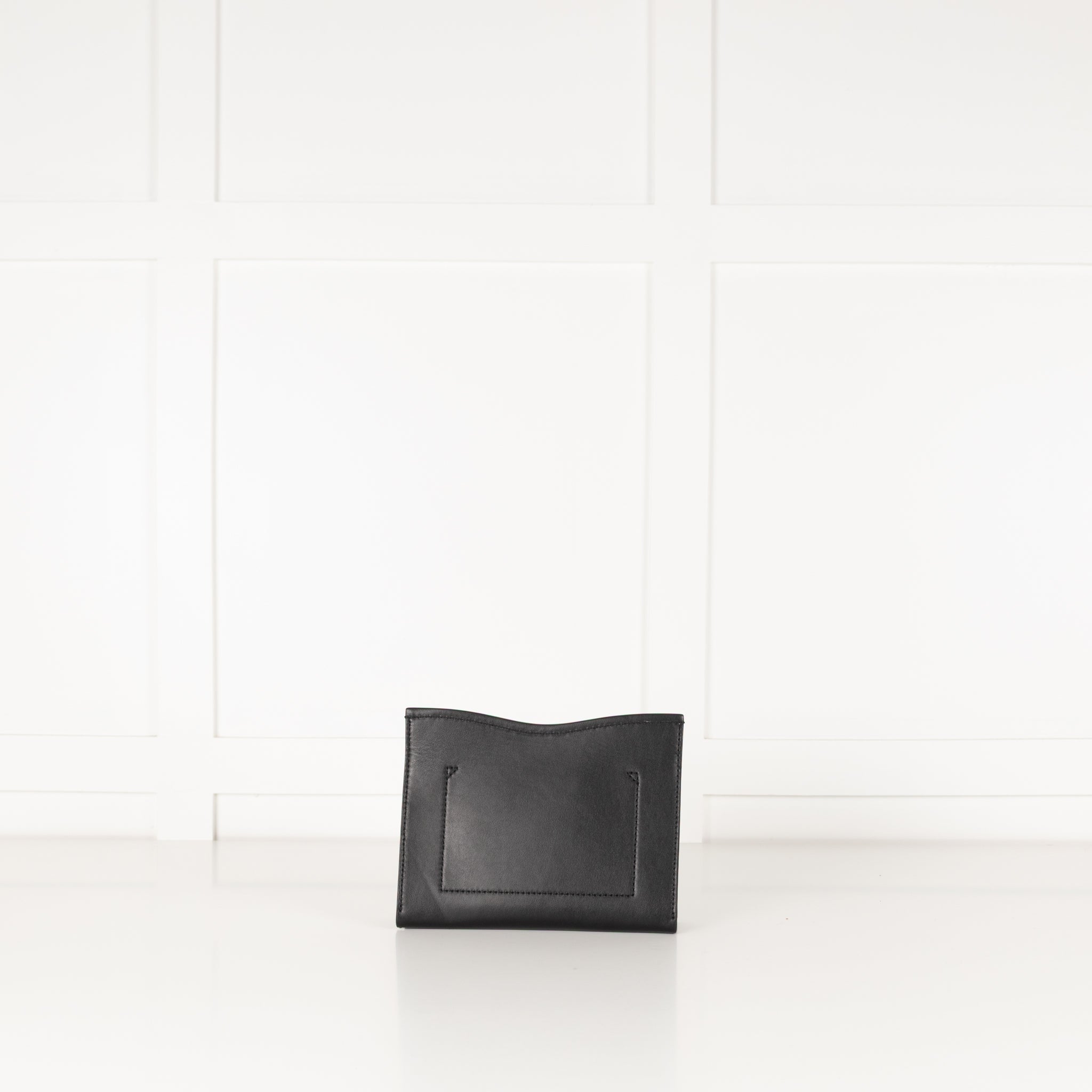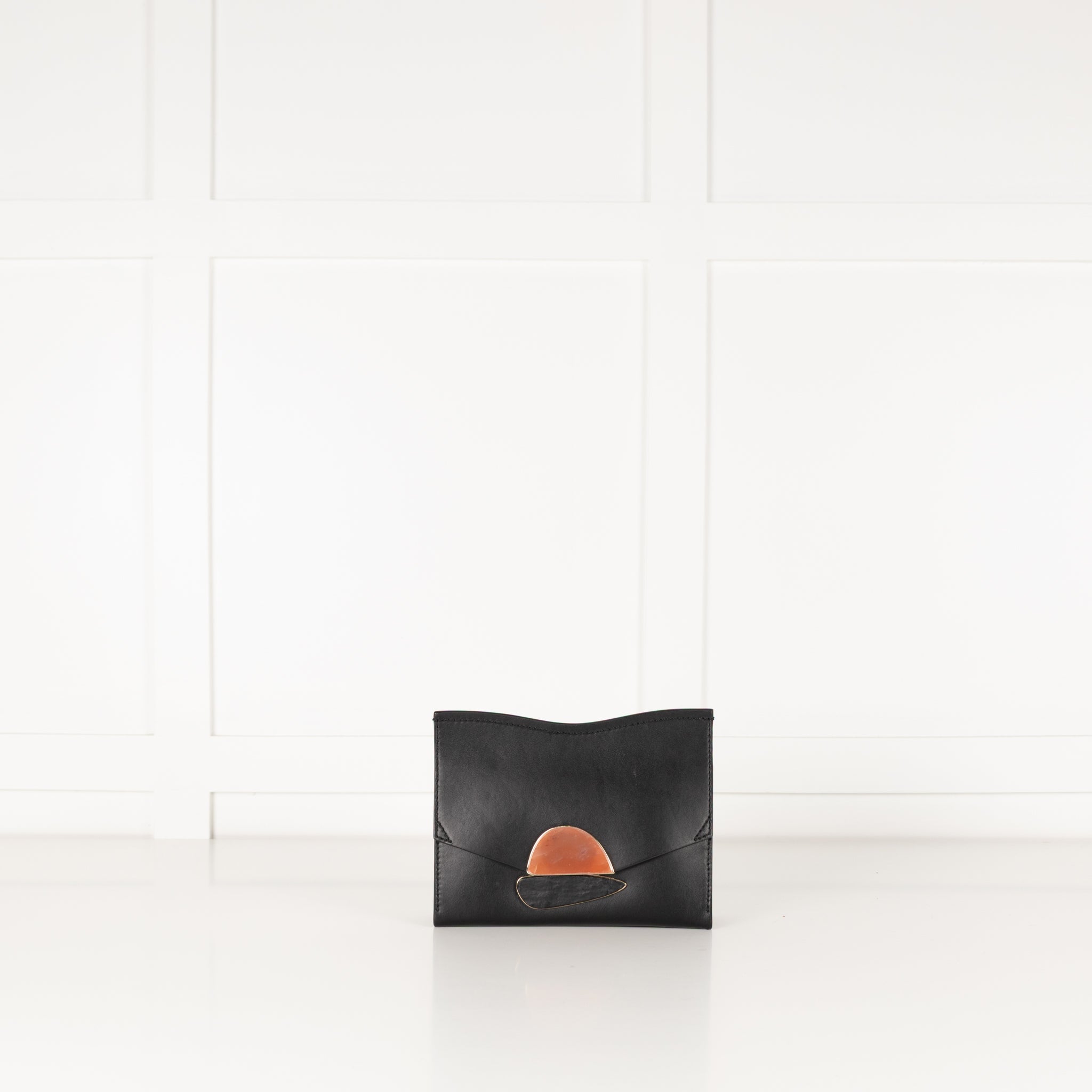 Proenza Schouler black leather curl clutch bag, featuring two stone pendants on the front metal clasp, one in black and one in orange for an elegant touch. It opens up to two departments, including a large section with a soft pink interior and a smaller side compartment. This stunning clutch bag is accompanied with the original dust bag.