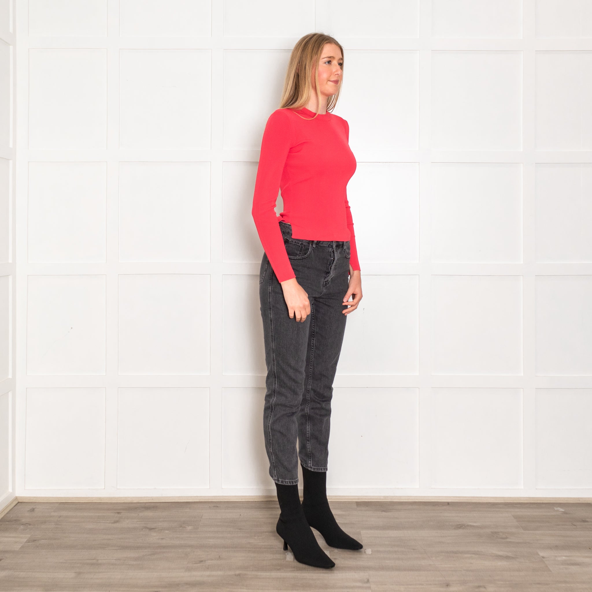 Rag & Bone red long-sleeve top, featuring a stunning coral ribbed design, with a rounded neckline and small splits at the hemline, for an elegant, fun look.