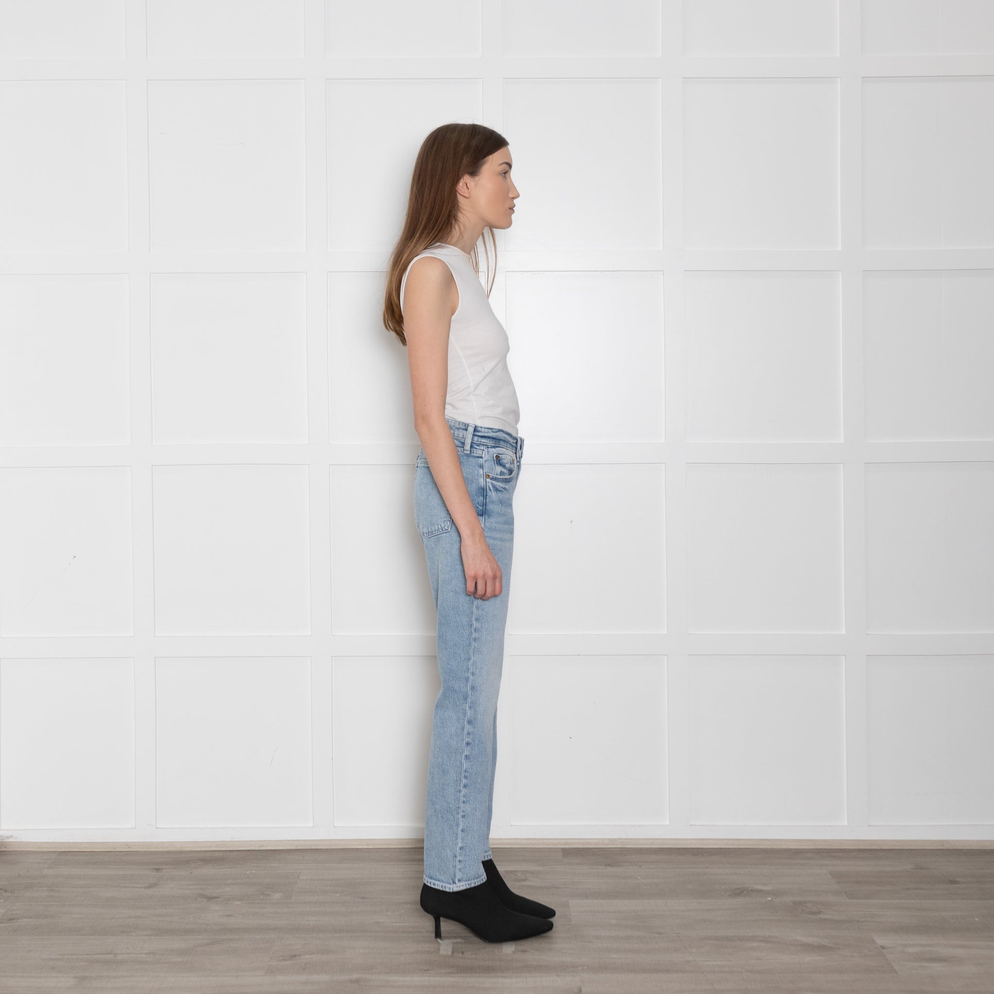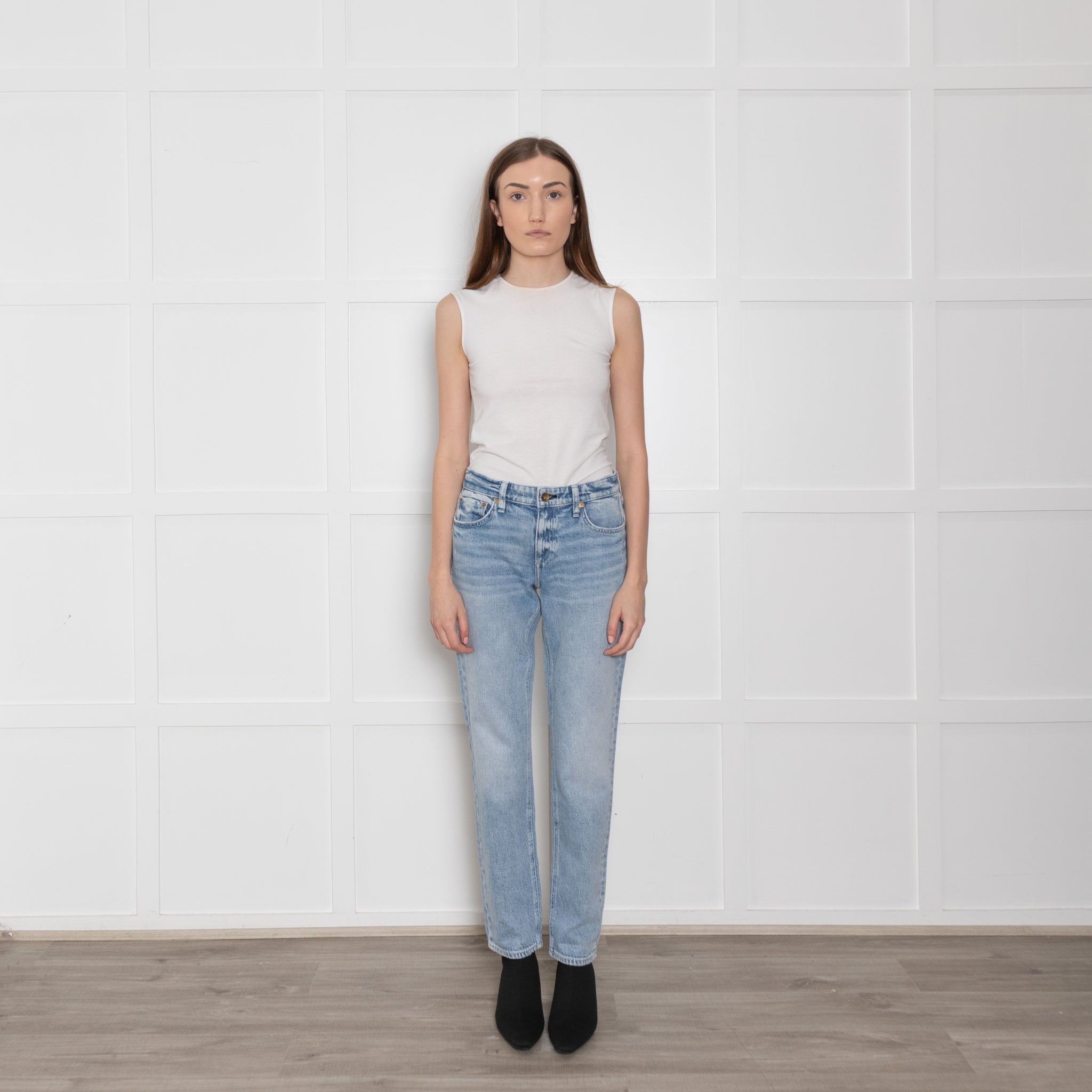 Rag & Bone cotton boyfriend jeans, featuring a stunning pale wash color with four pockets, a front zip, and a button-up closure.