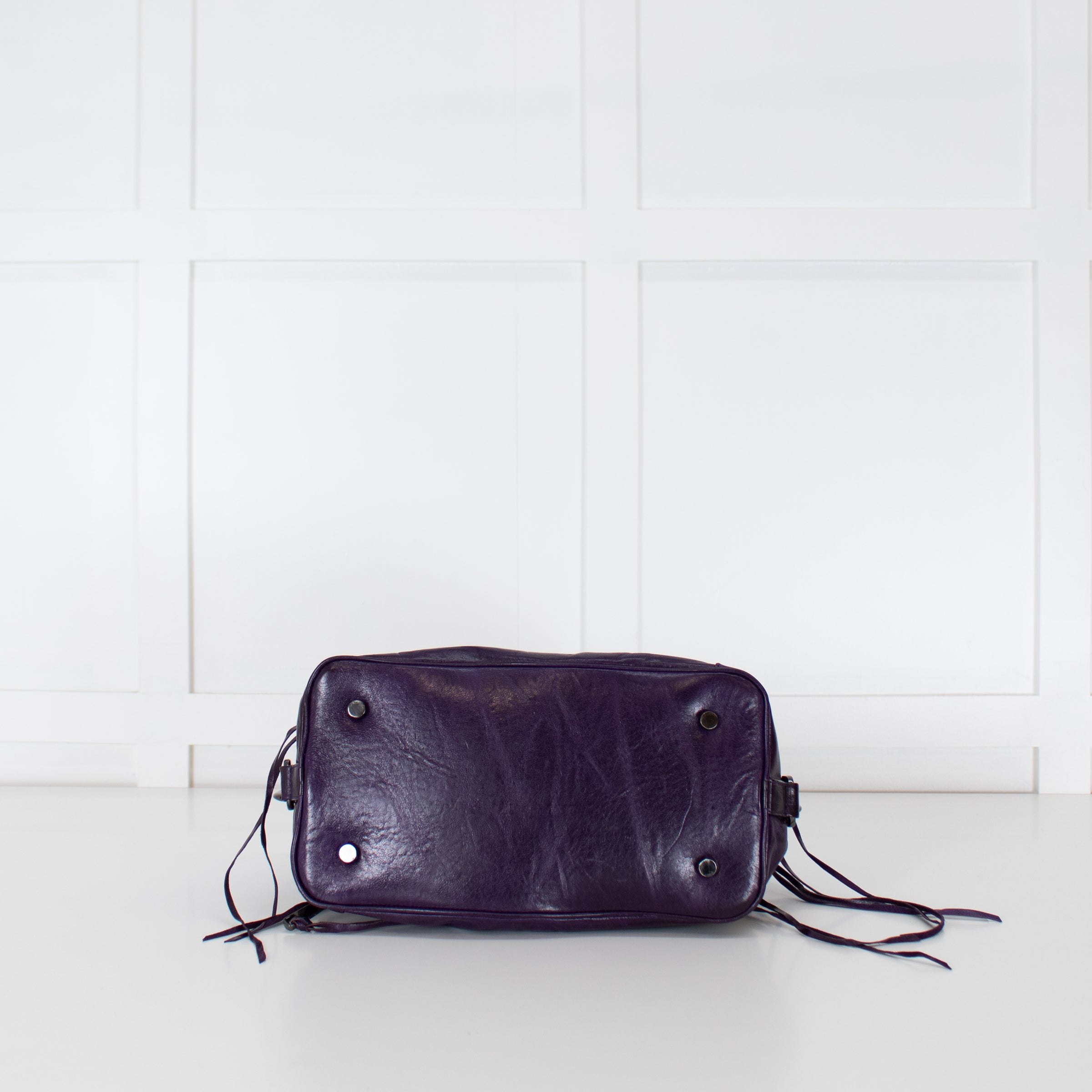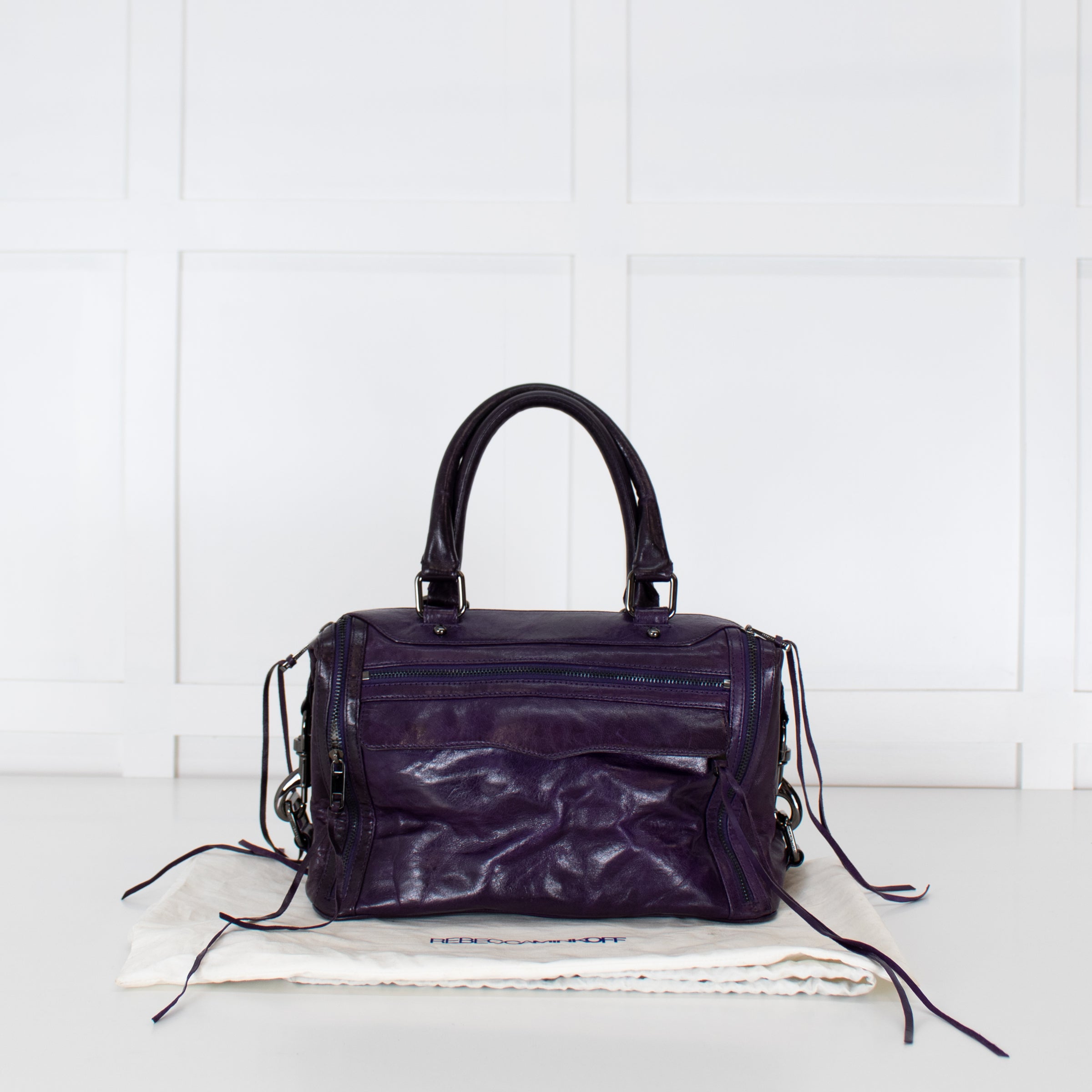 Rebecca Minkoff purple leather Mab motorcycle style handbag with dual rolled top handles, side clip detailing, zip detailing, and tasselled zip pulls. With the original dust bag.