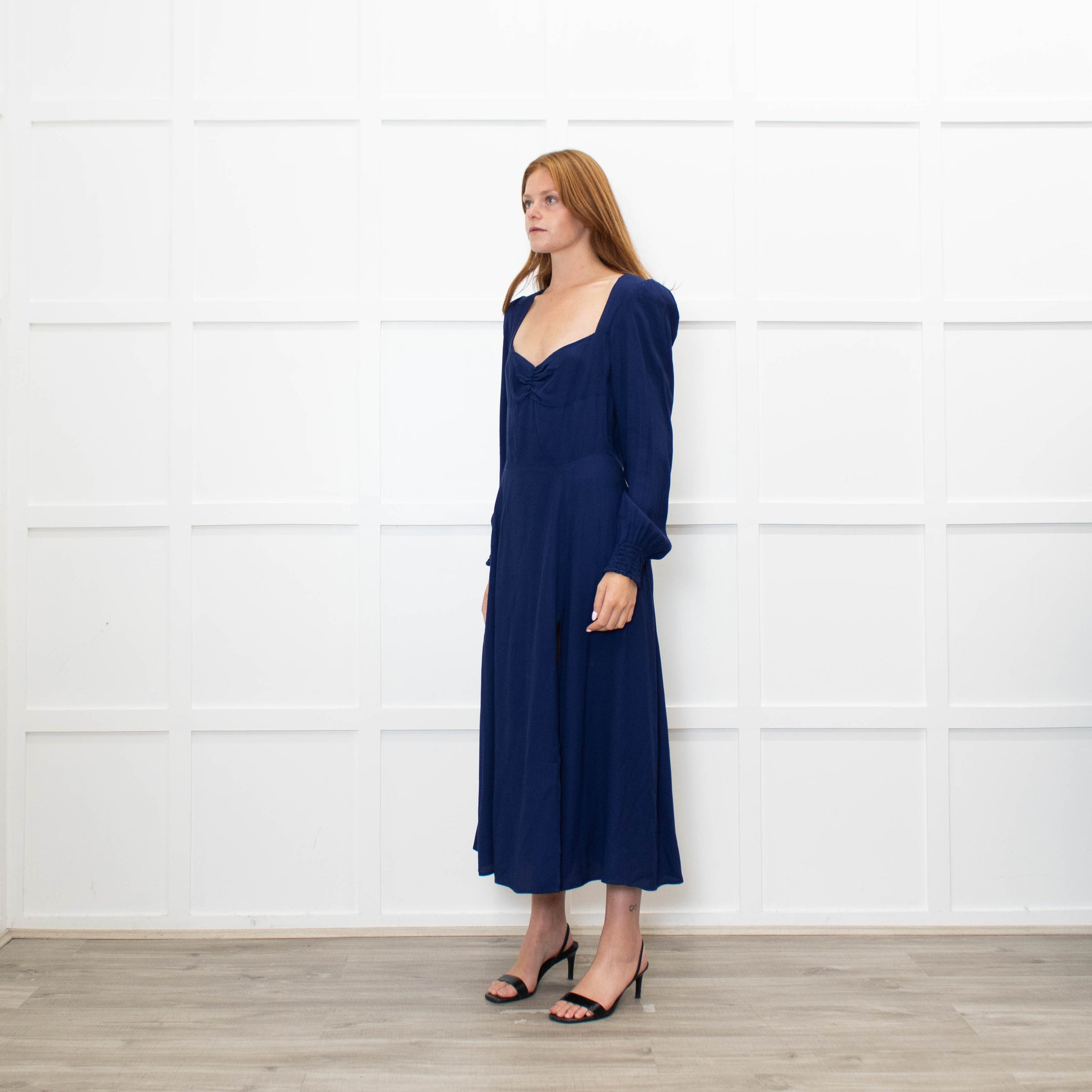 Reformation blue dress with a sweetheart neckline. Maxi length with gathered 3/4 length sleeves. Zip fastening to the back.