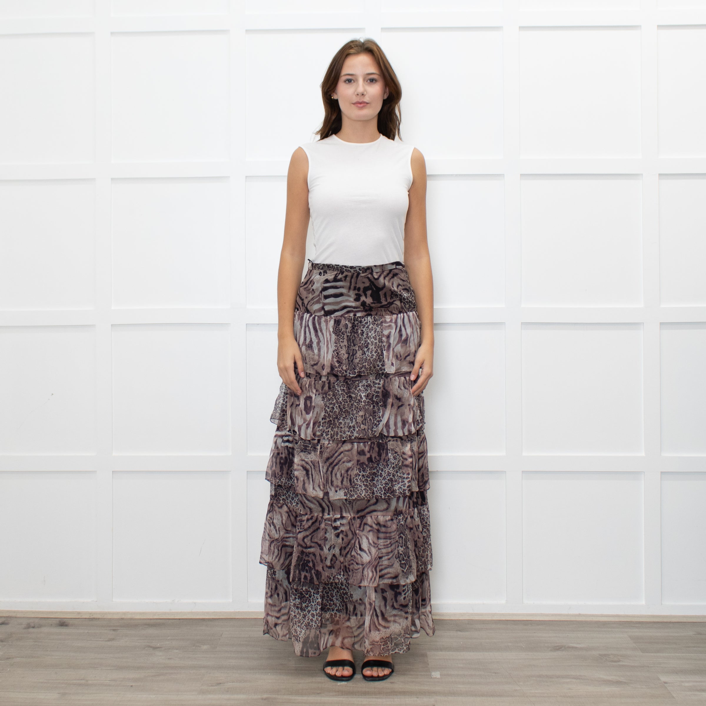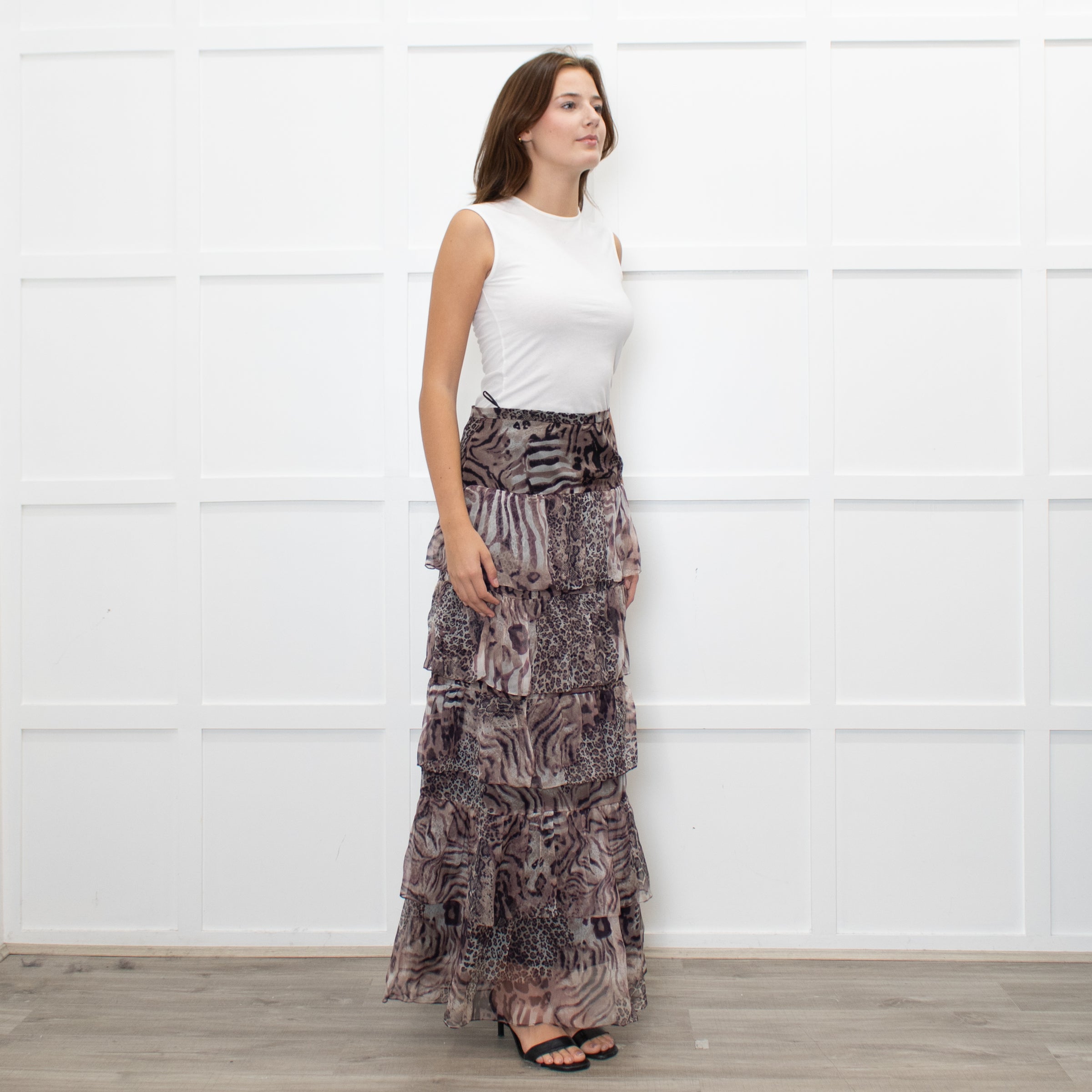 Ridley brown mixed animal print silk chiffon tiered frilled maxi skirt with a fixed waistband, zip fastener, and a full lining.