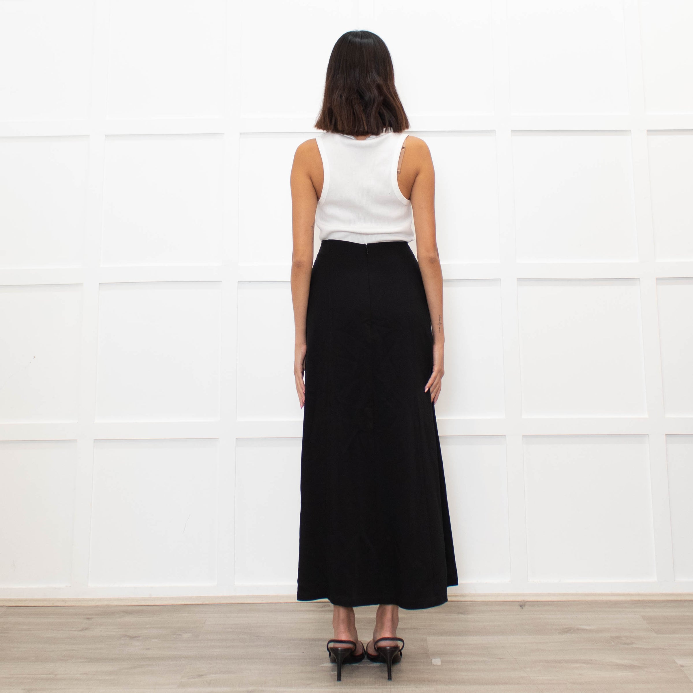 Rodebjer black straight midi skirt with concealed rear zip closure.