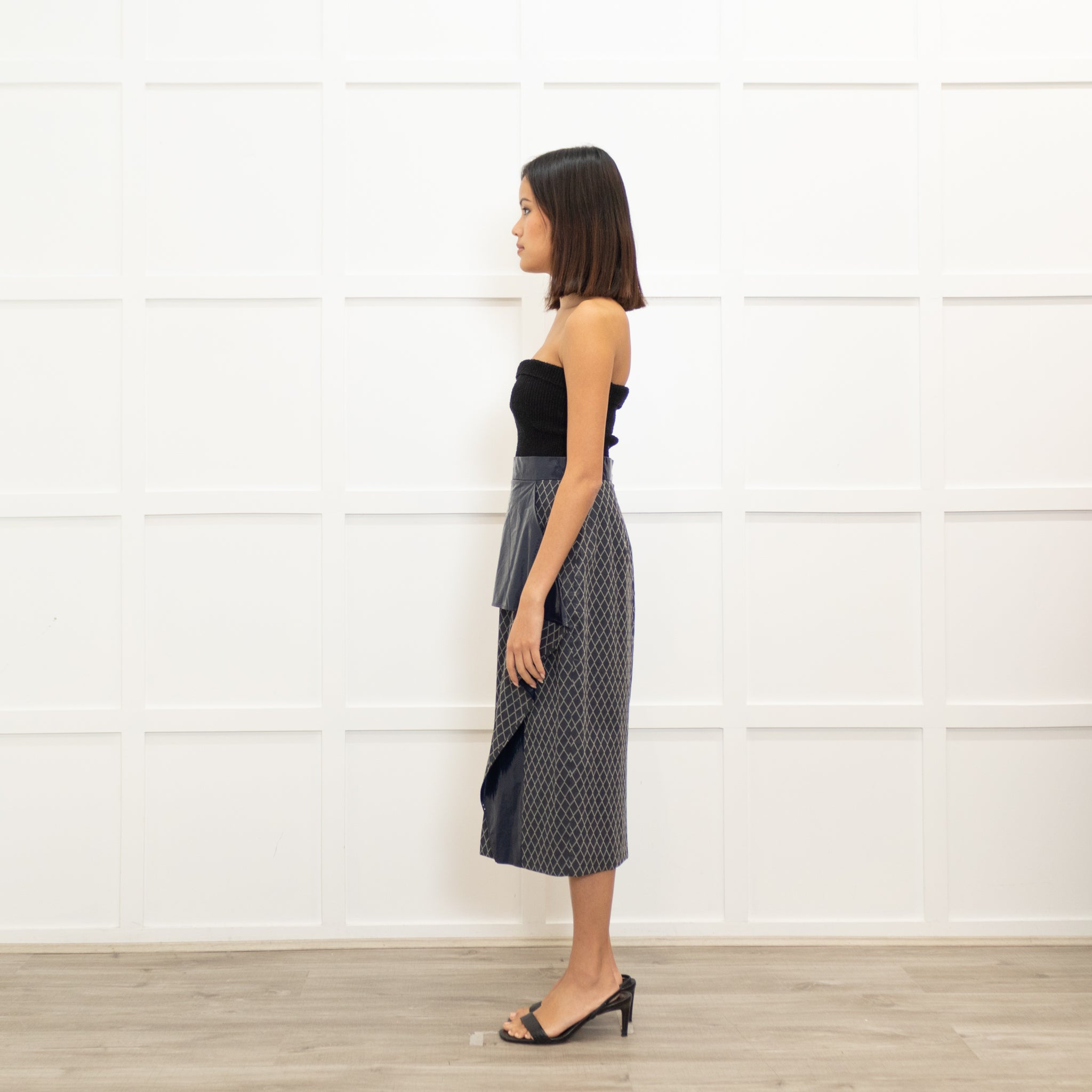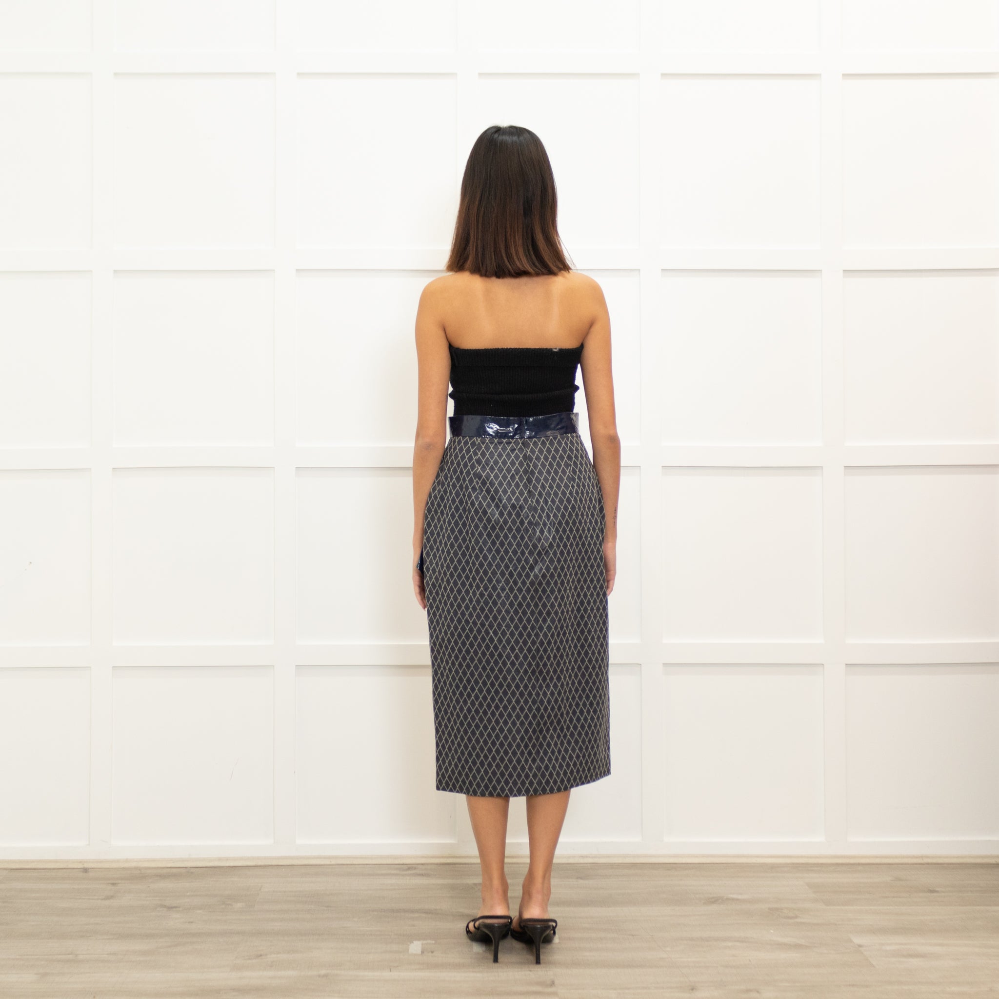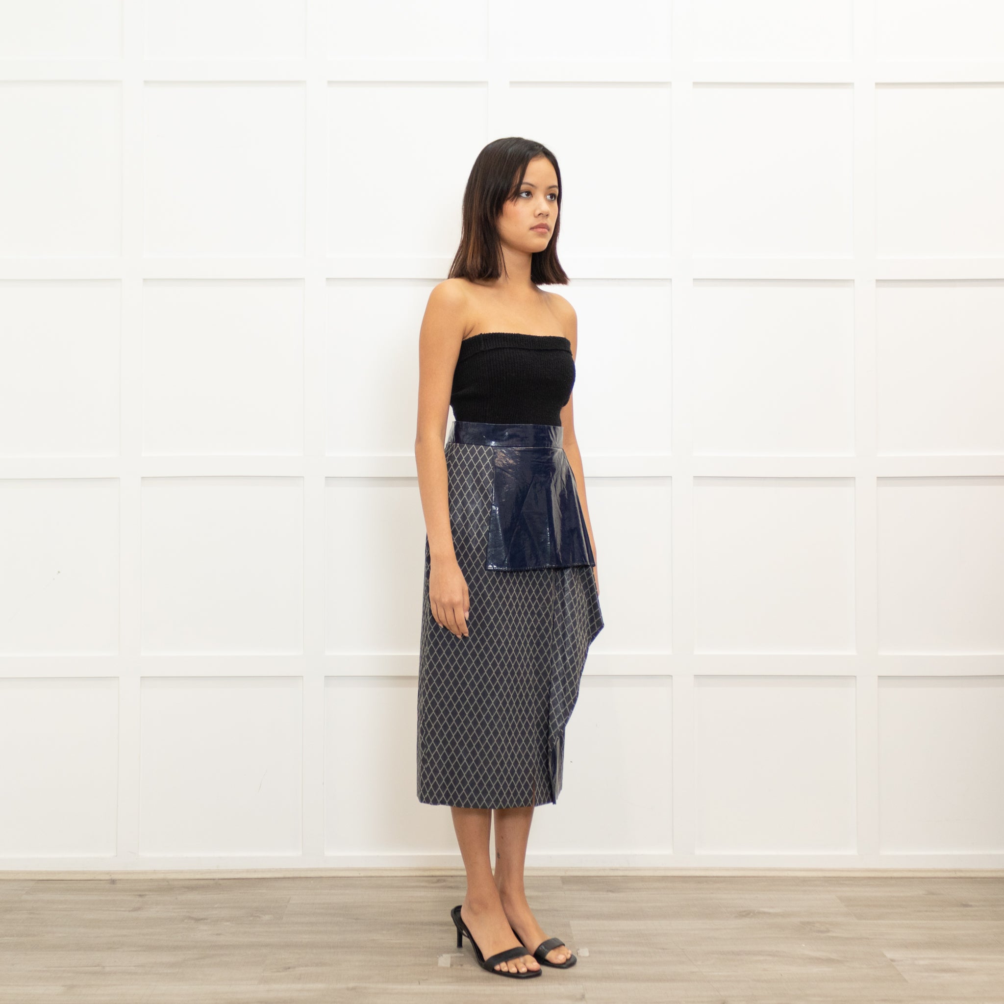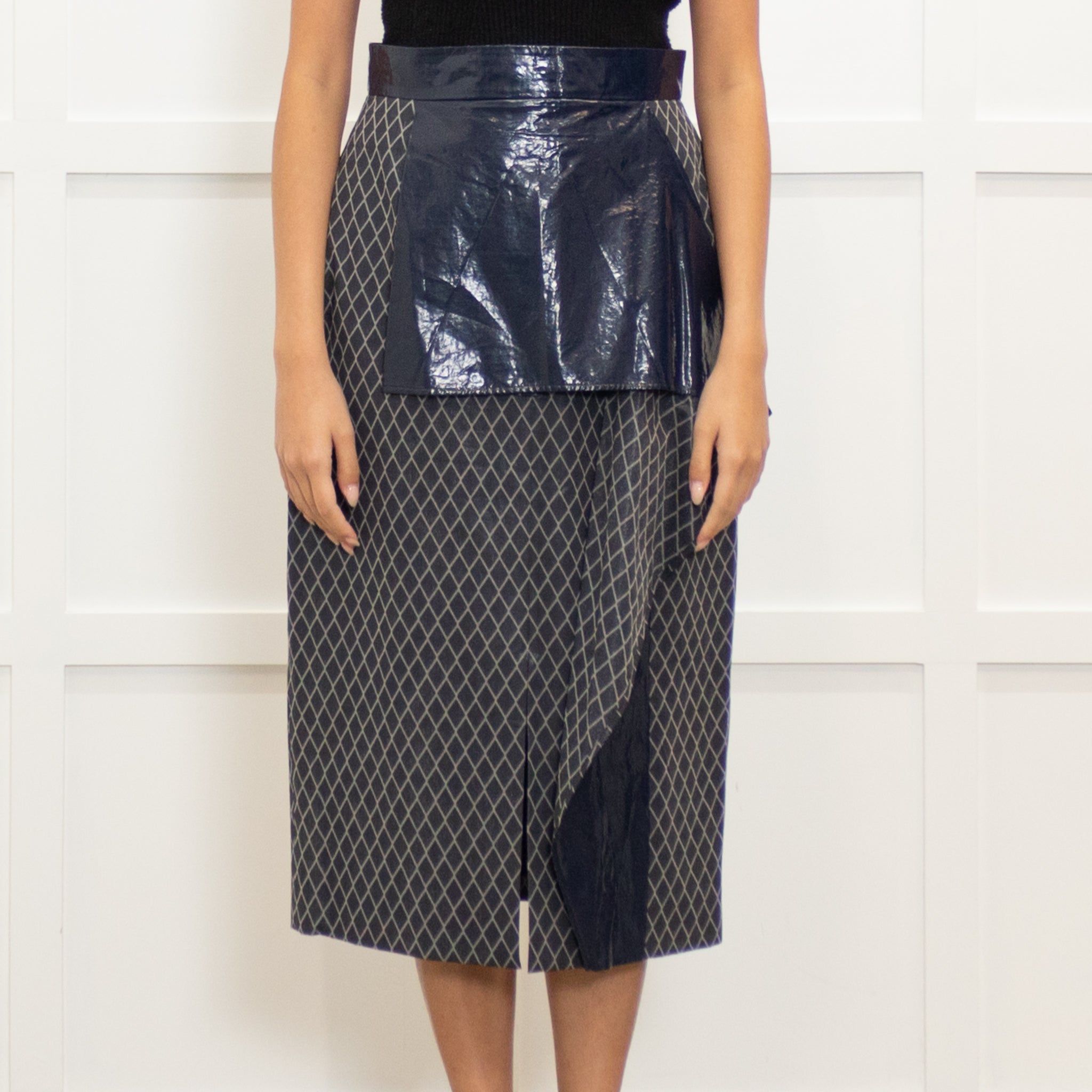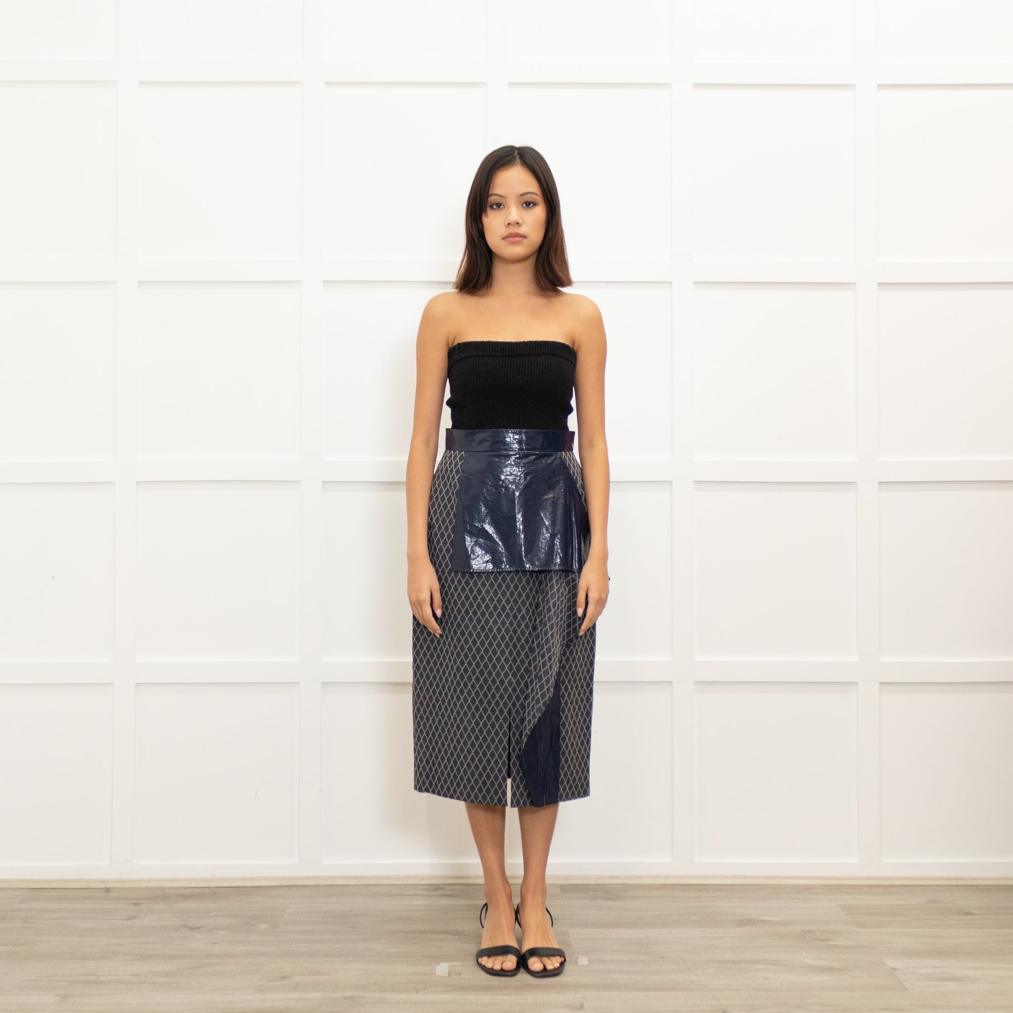 Roksanda navy pencil skirt with patent frill and a front leg split.