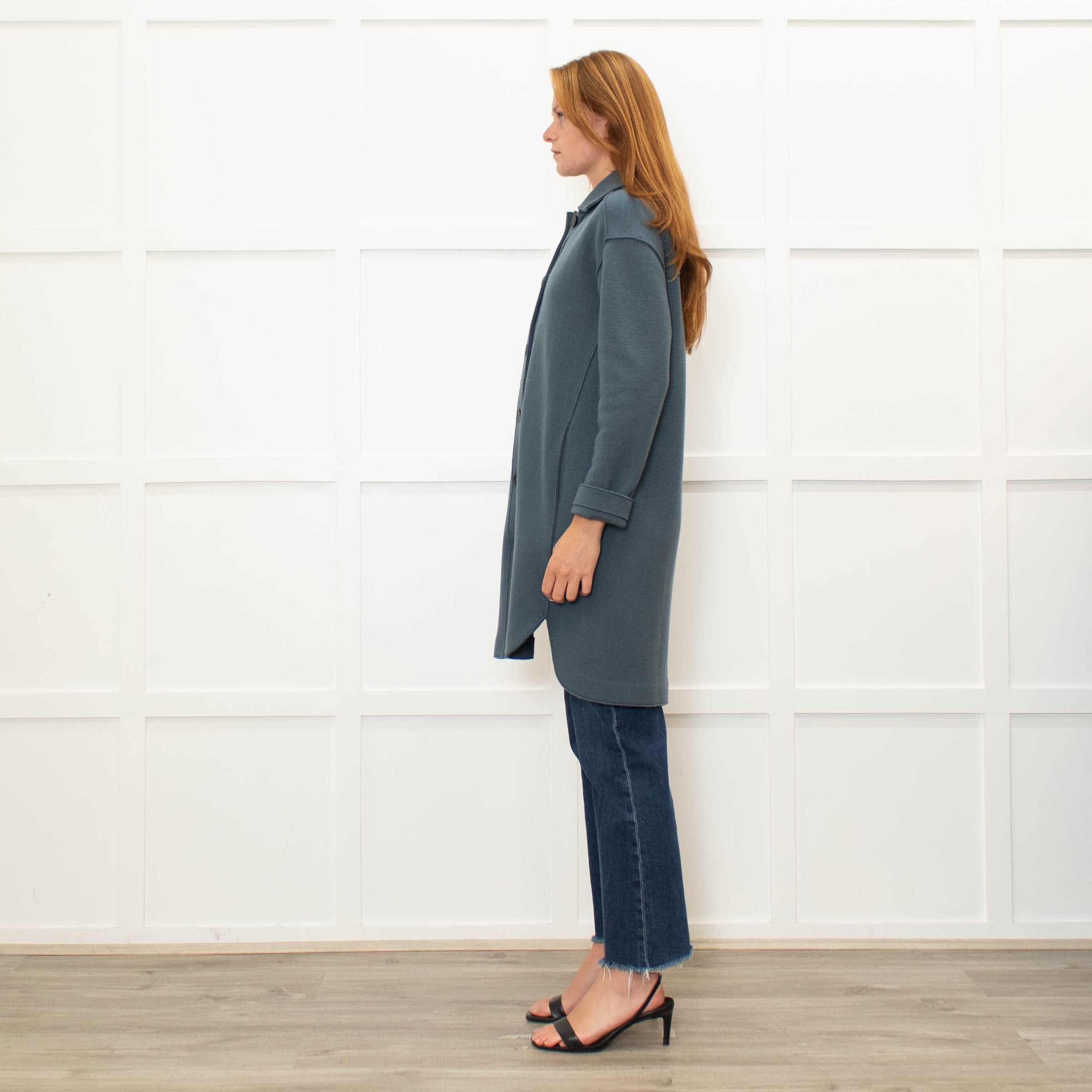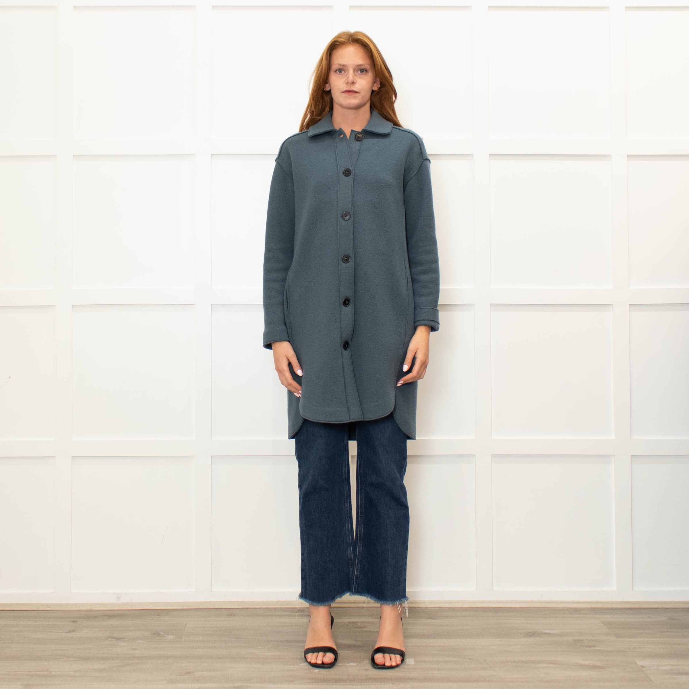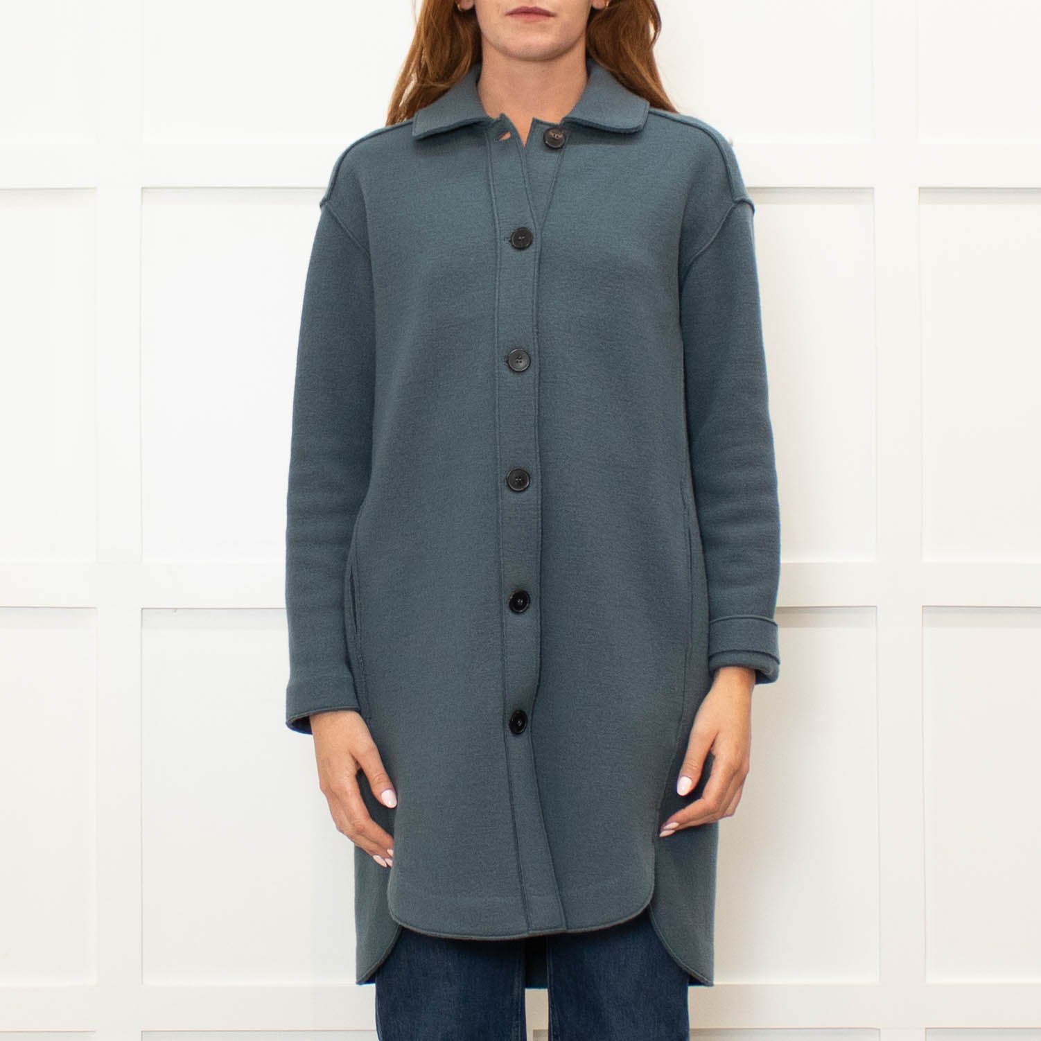 Rosso35 petrol blue knit unlined coat with a scooped hem, long sleeves, a pointed collar, and side slip pockets.