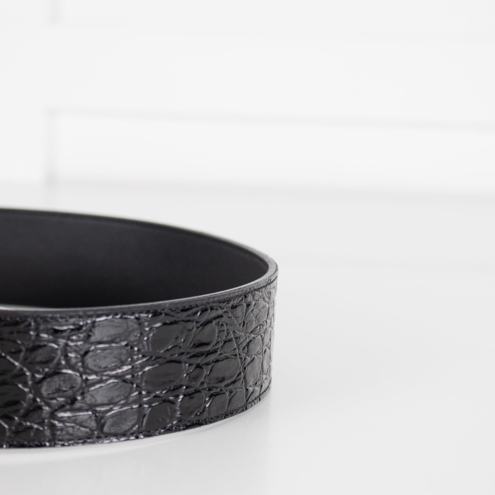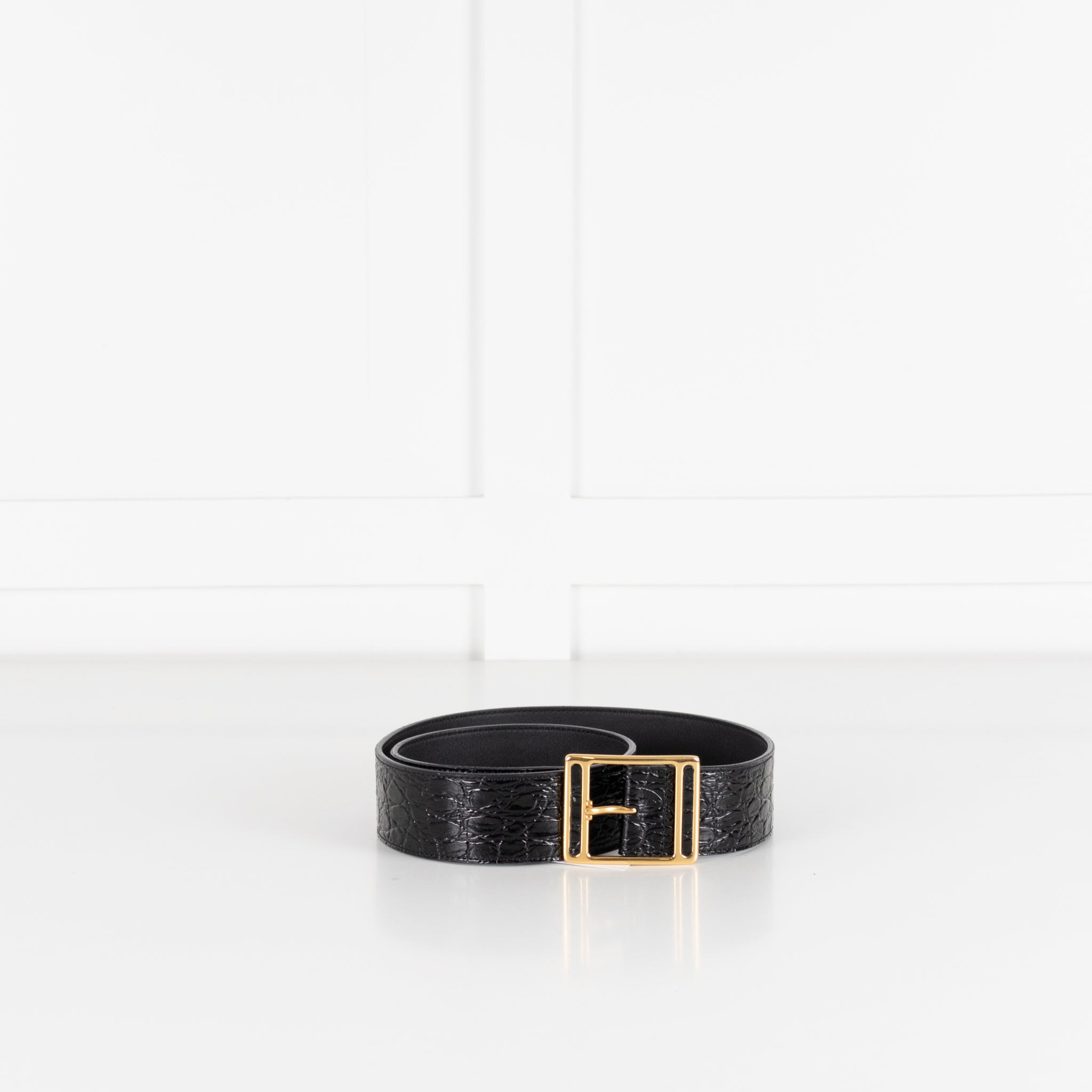 Saint Laurent black croc wide belt with gold buckle detailing.