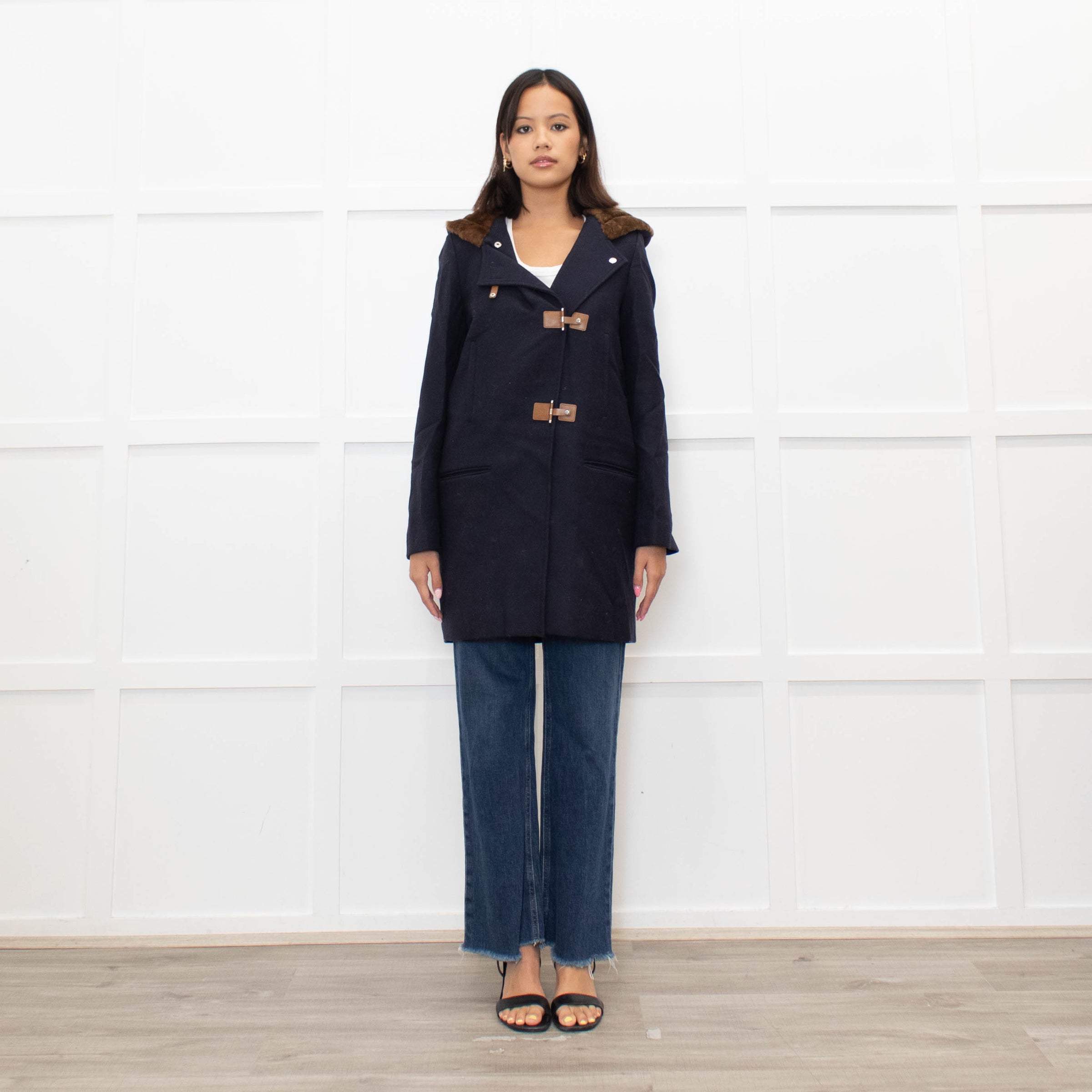 Sandro navy blue wool peacoat with faux fur trim and a hood. Fastening with leather and metal toggles. Finished with long sleeves, four front pockets, and a full lining.