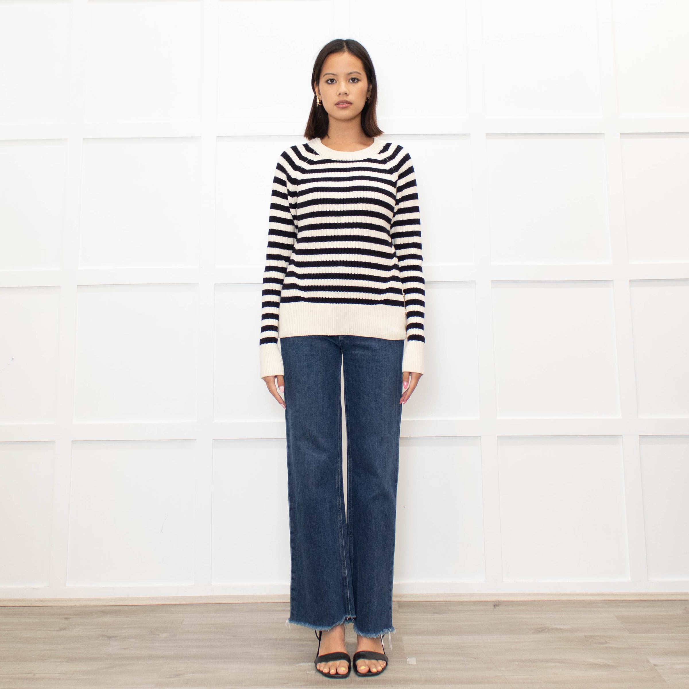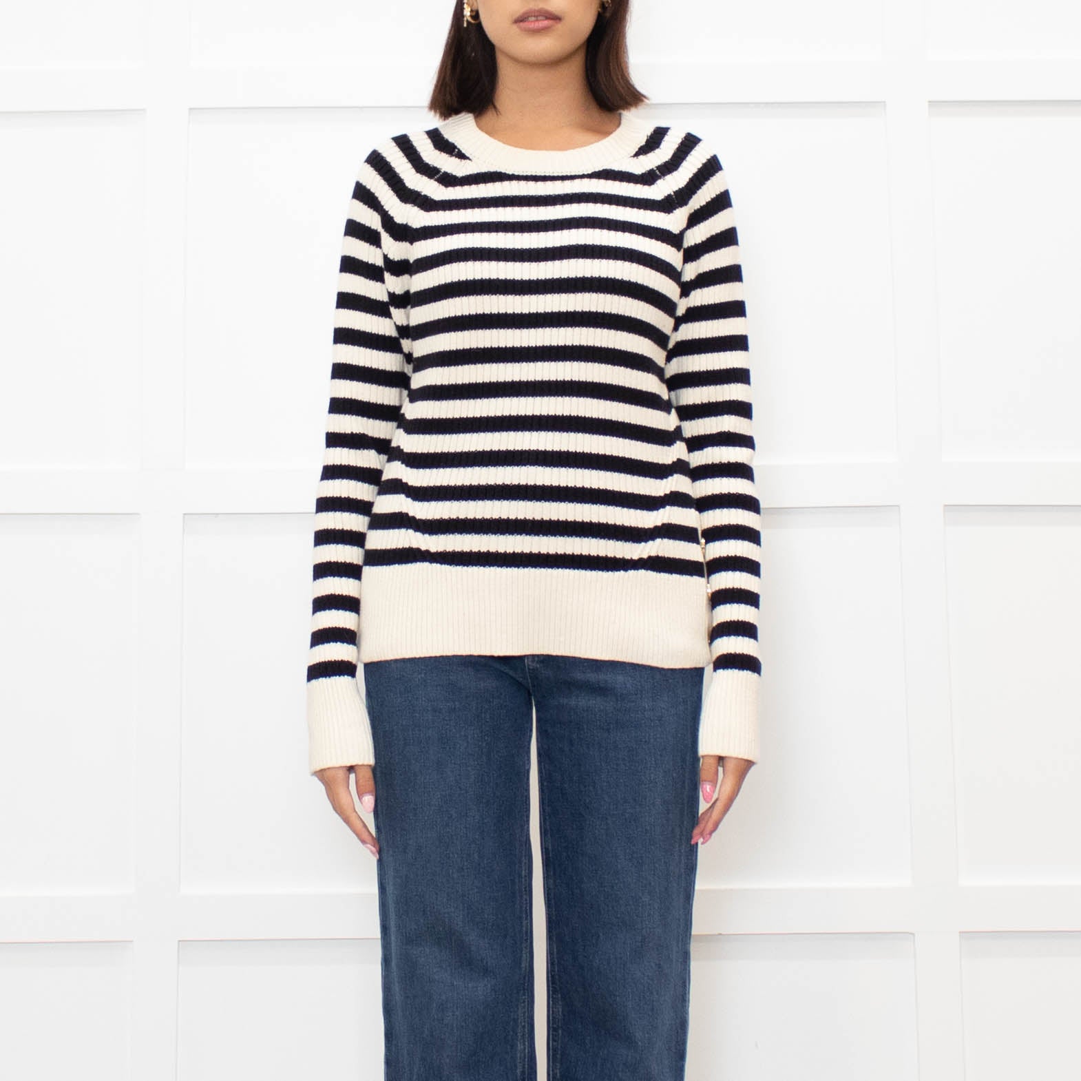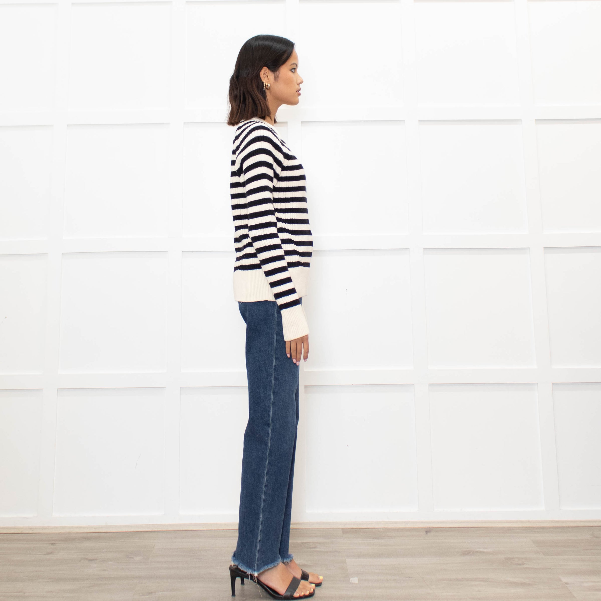 Scotch & Soda cream and black cotton ribbed knit jumper with side gold button split detailing, raglan sleeves, and V shape shaping at the hem.