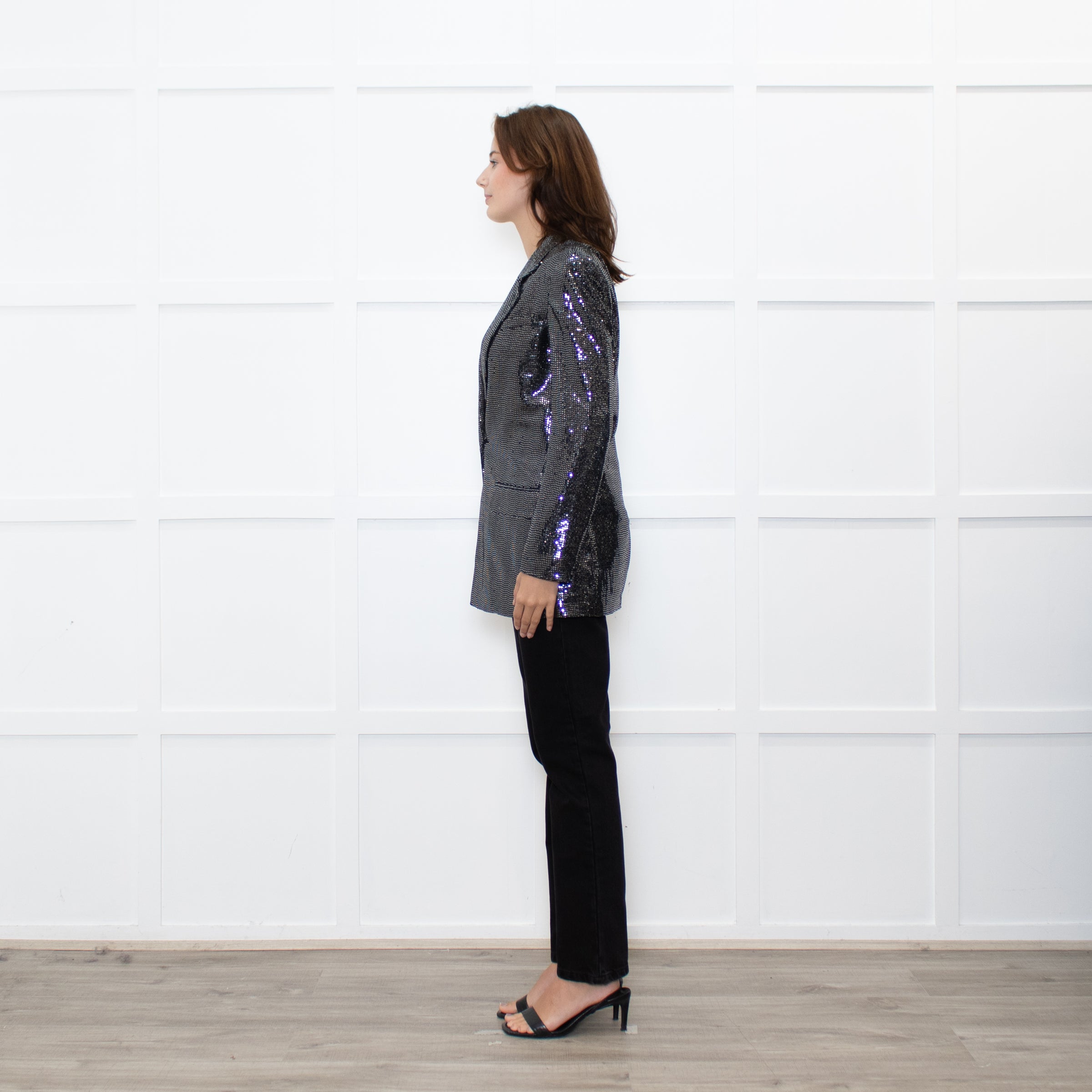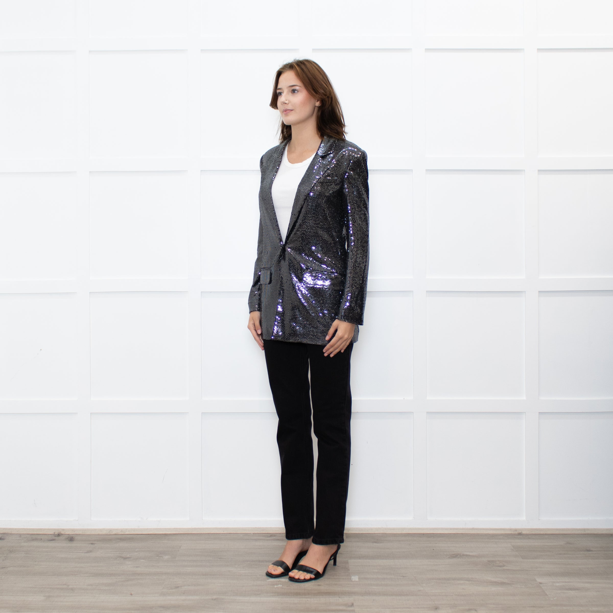 Second Female black and silver sequined blazer jacket with a notch collar and lapel, two side flap pockets, and a single button fastener. New with tags.