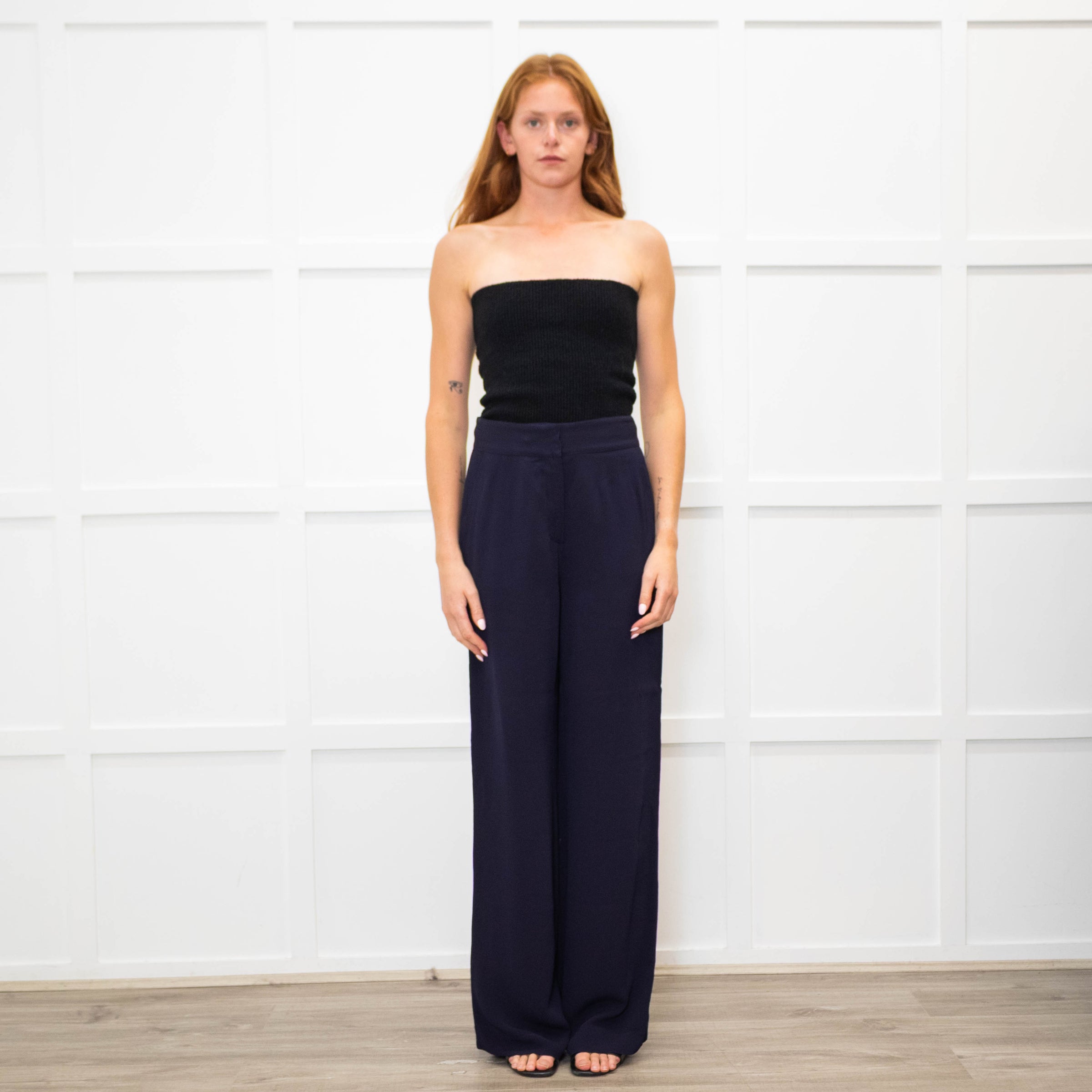 See By Chloe navy blue textured wide-leg trousers with concealed front zip and metal clip flies and two side slip pockets.