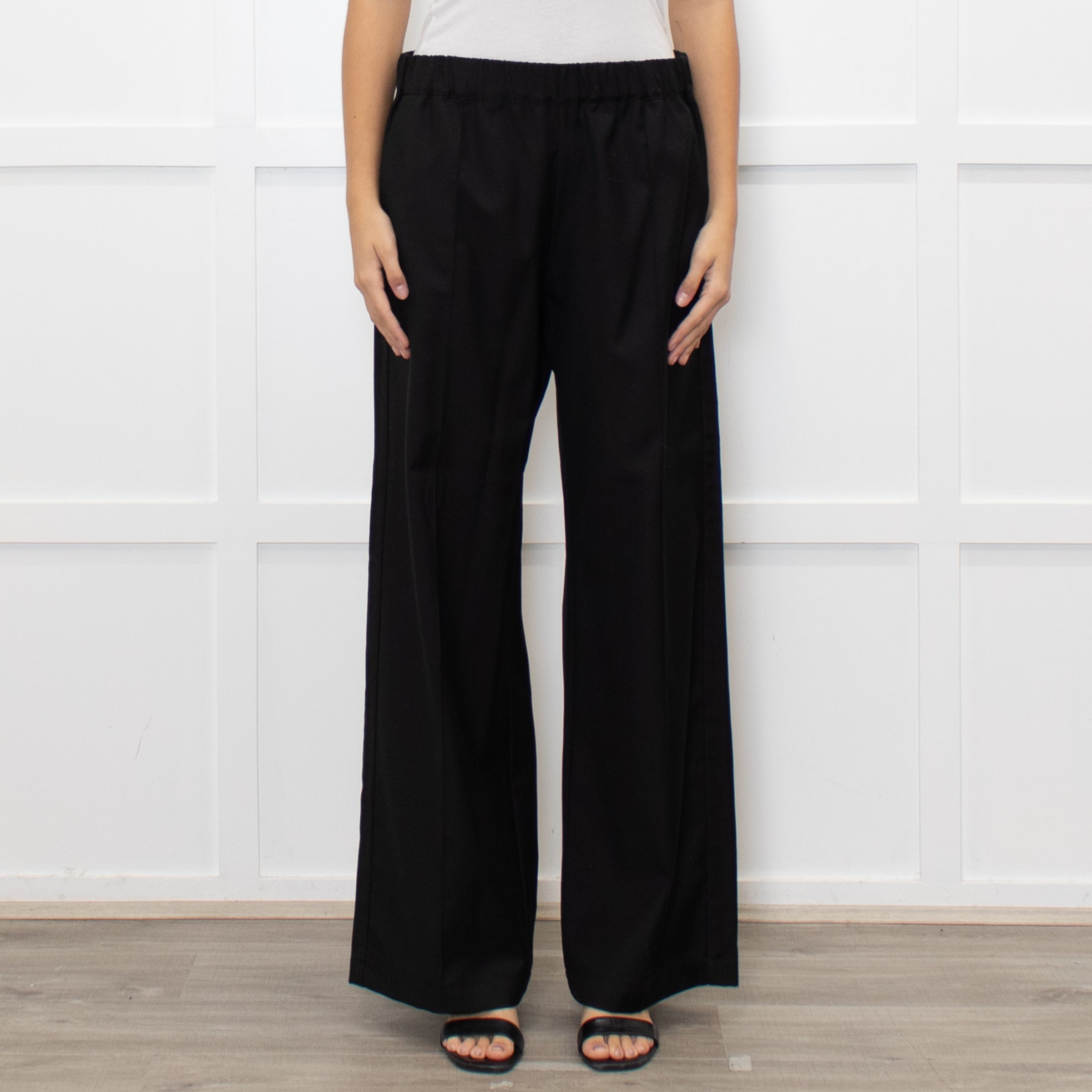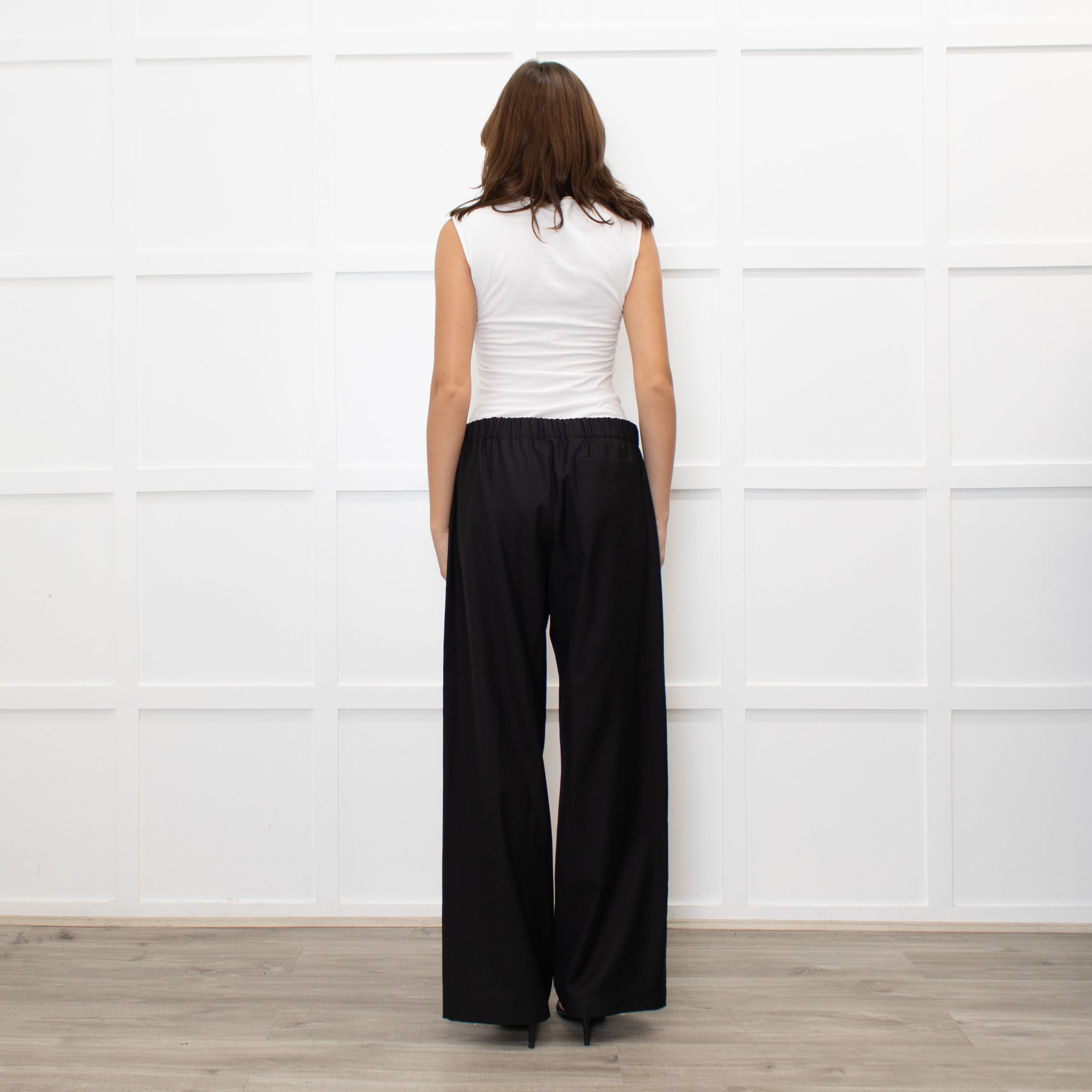 Serena Bute black wool twill pull-on trousers with a wide cut leg, an elasticated waist, side slip pockets, and a rear patch pocket.