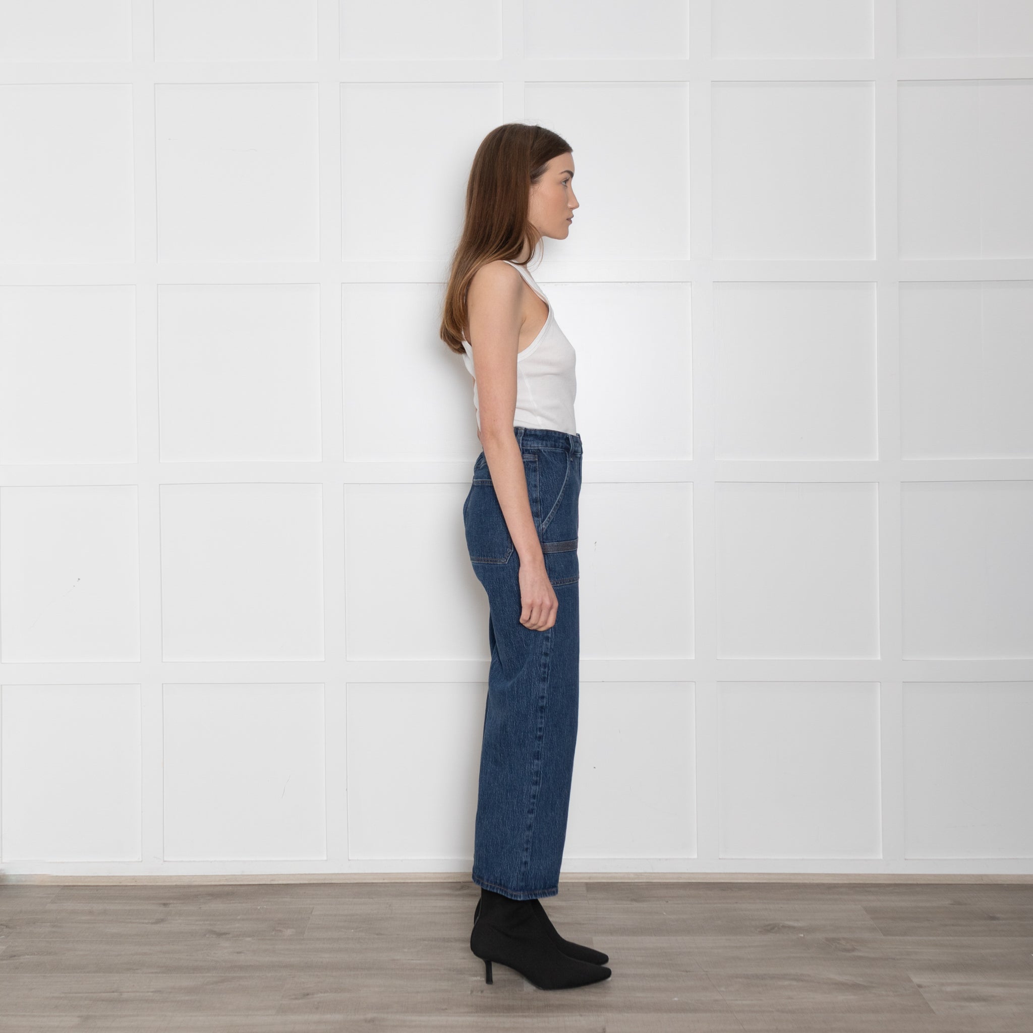 Seventy + Mochi dark blue carpenter-style jeans with a straight leg, symmetrical pockets, and front fly zip.