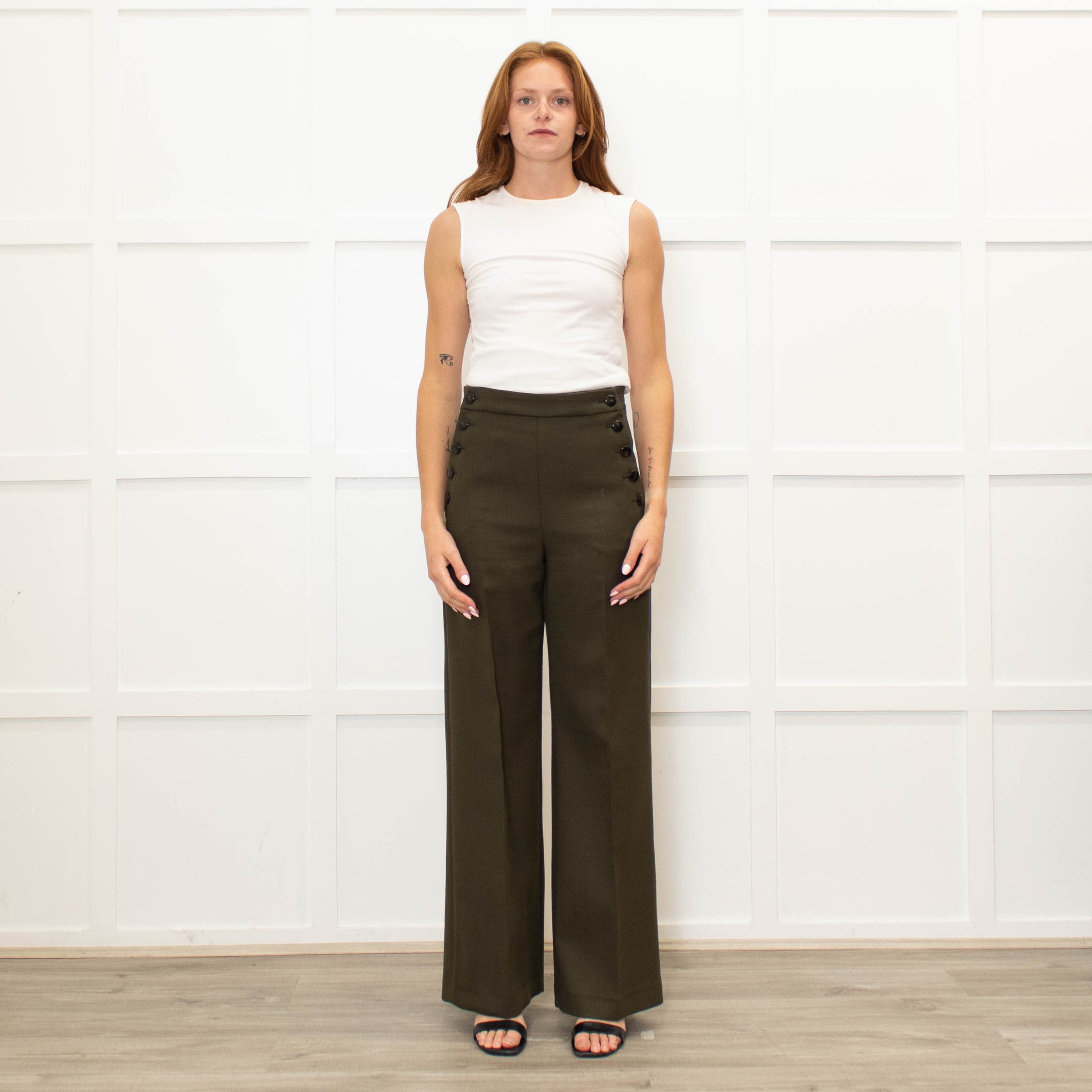 Sezane green wide-leg trousers with front buttons on both sides of the waist, one rear patch pocket, and concealed side zip closure.