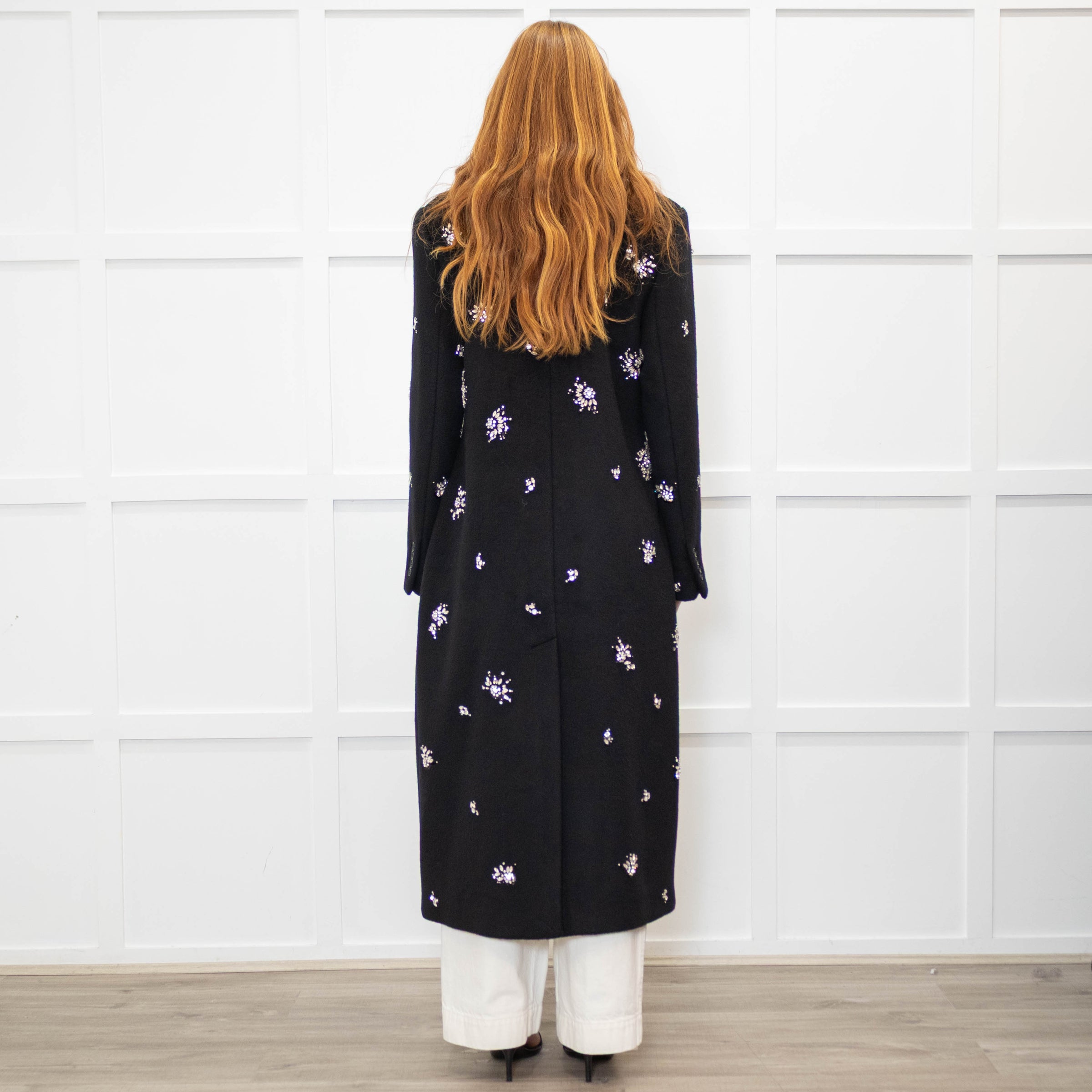 Simkhai black soft wool blend Gianni coat with crystal, and black sequin floral embellished detailing. In a longline style with long sleeves, a notch collar and lapel, and front slip pockets (still stitched closed). Current season RRP £925.