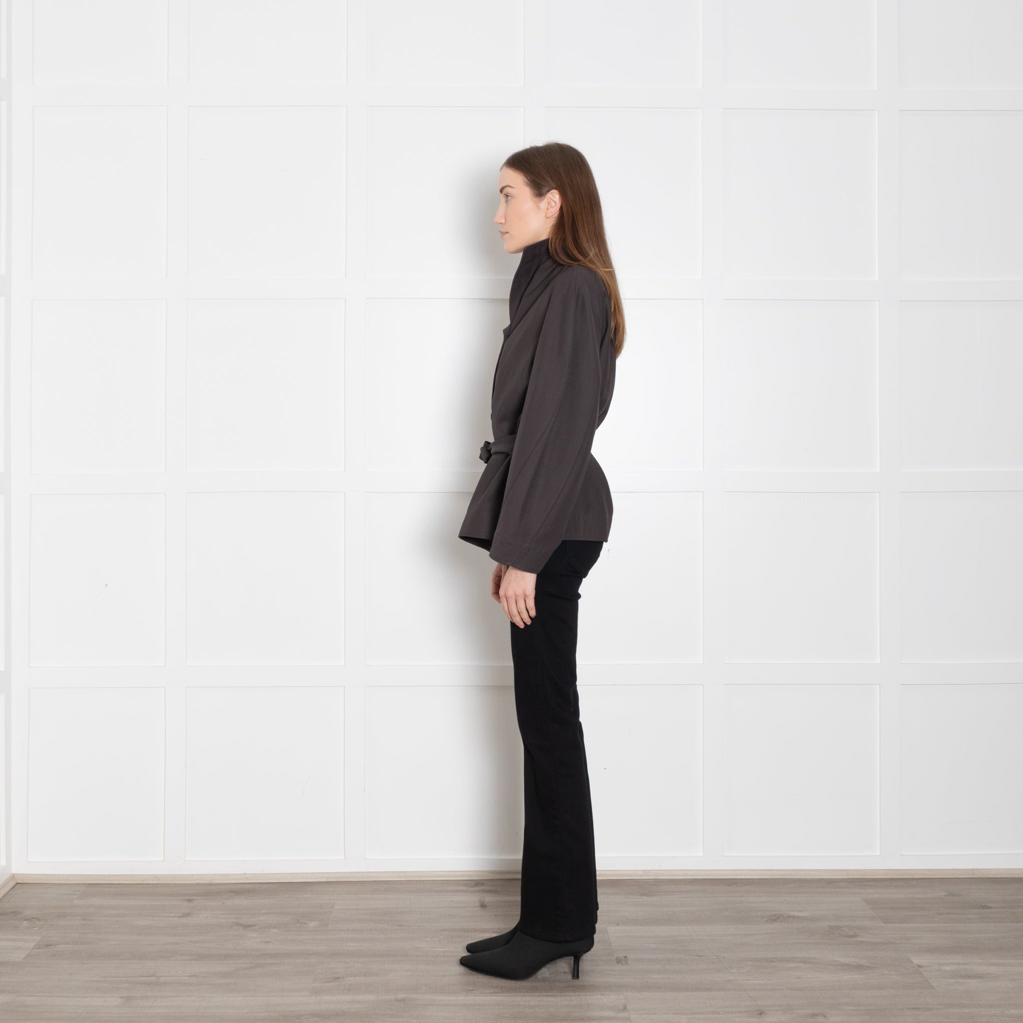 Soeur grey drop-shoulder belted jacket with a funnel neck and front button closure.