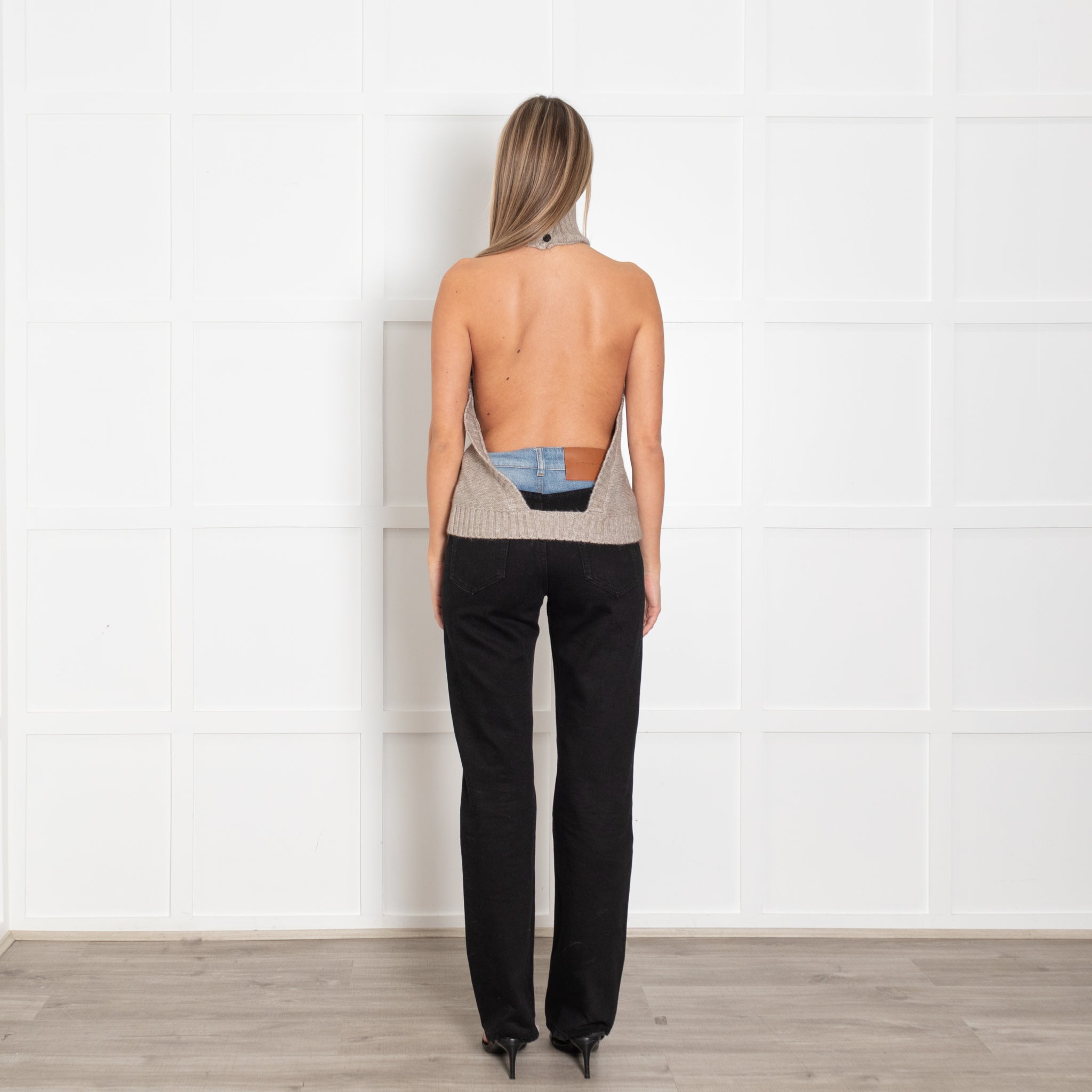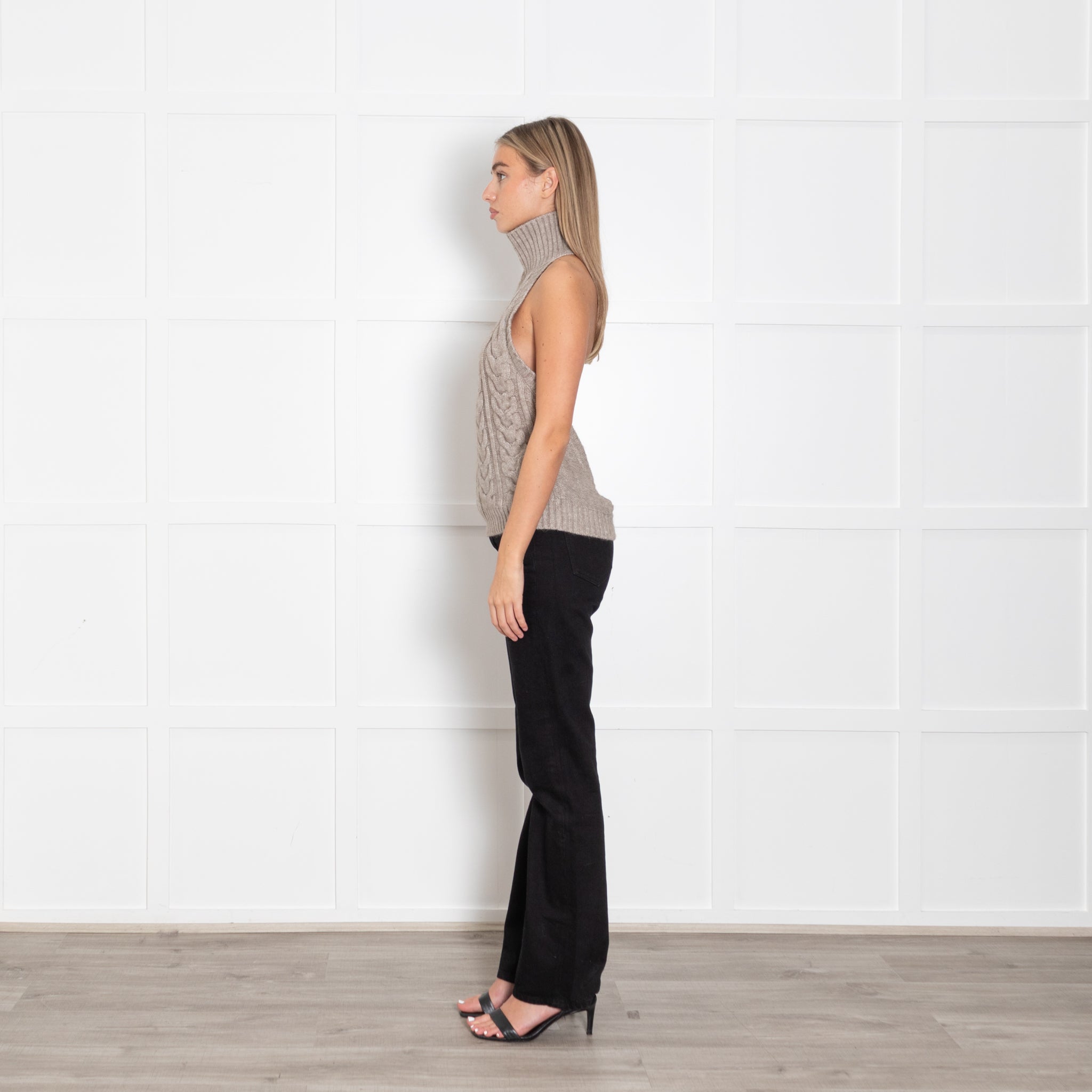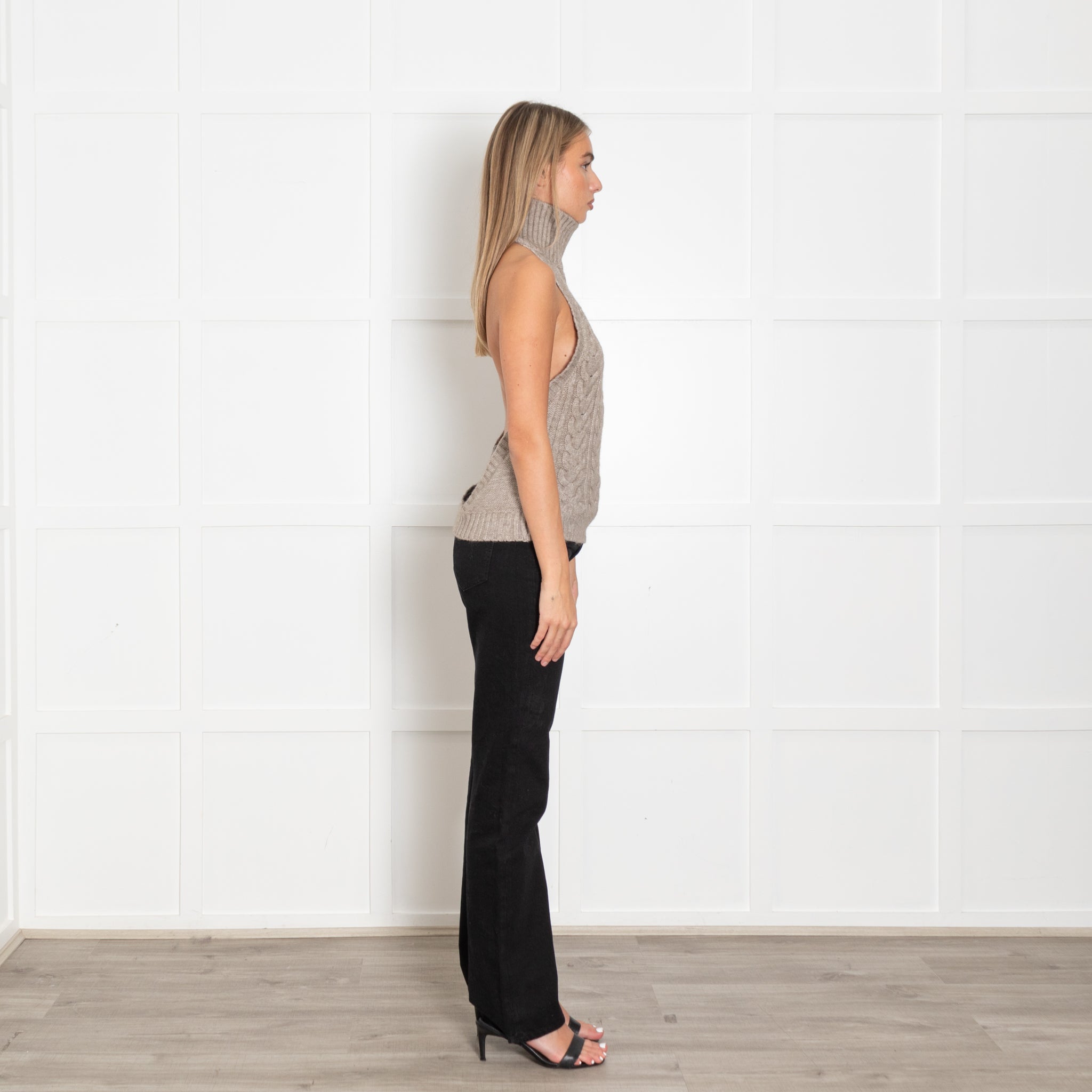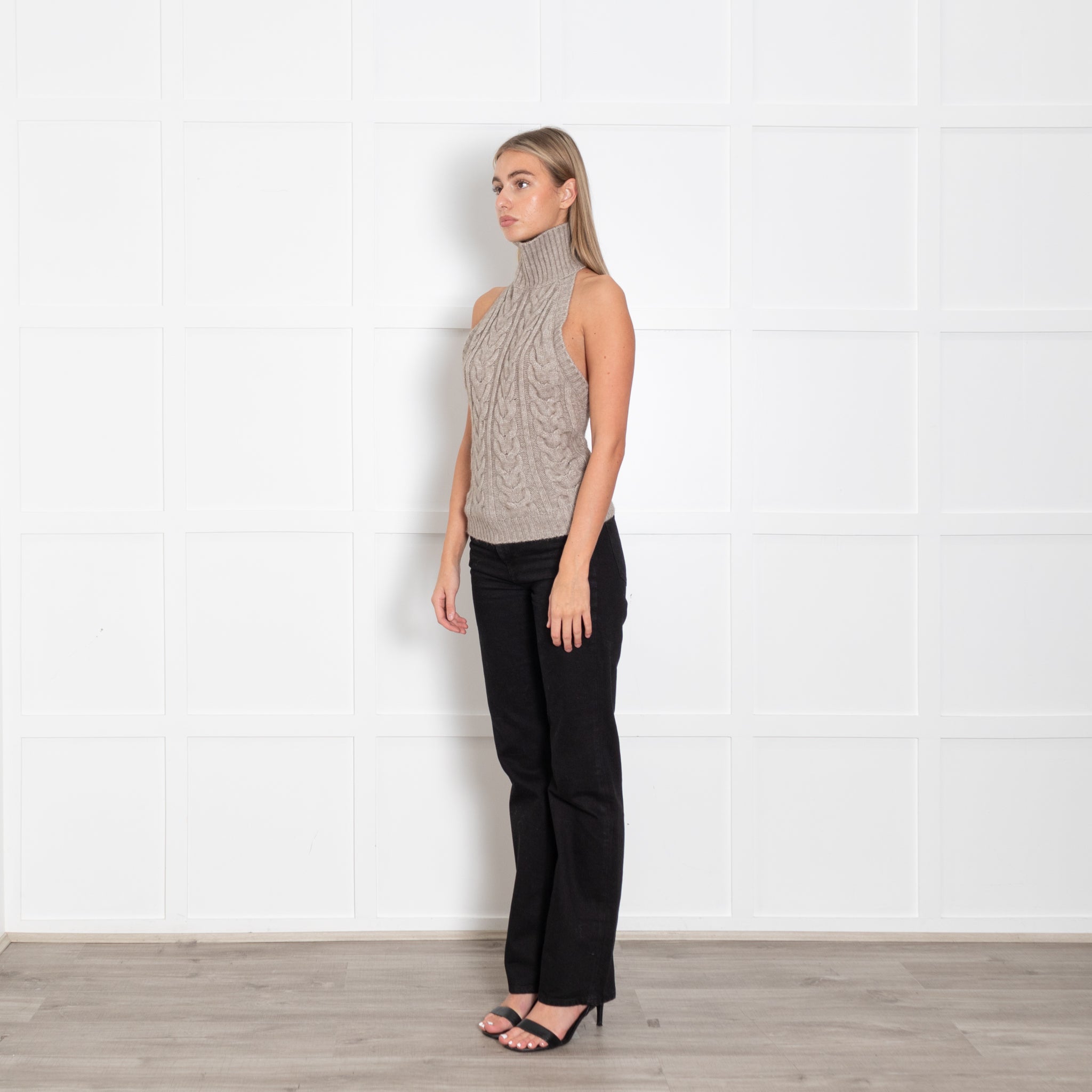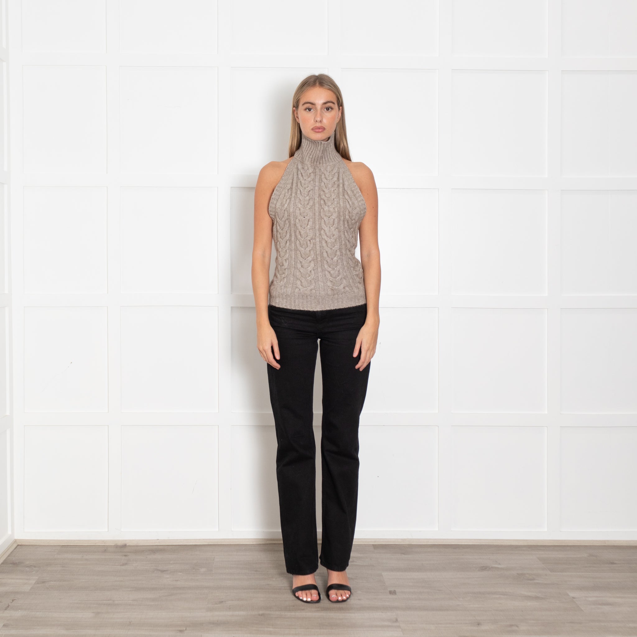 Source Unknown beige halterneck cashmere top, featuring a sleeveless silhouette with a textured cable-knit design for a soft, elevated finish. The open back is secured with contrasting black neck buttons, creating a chic backless effect.