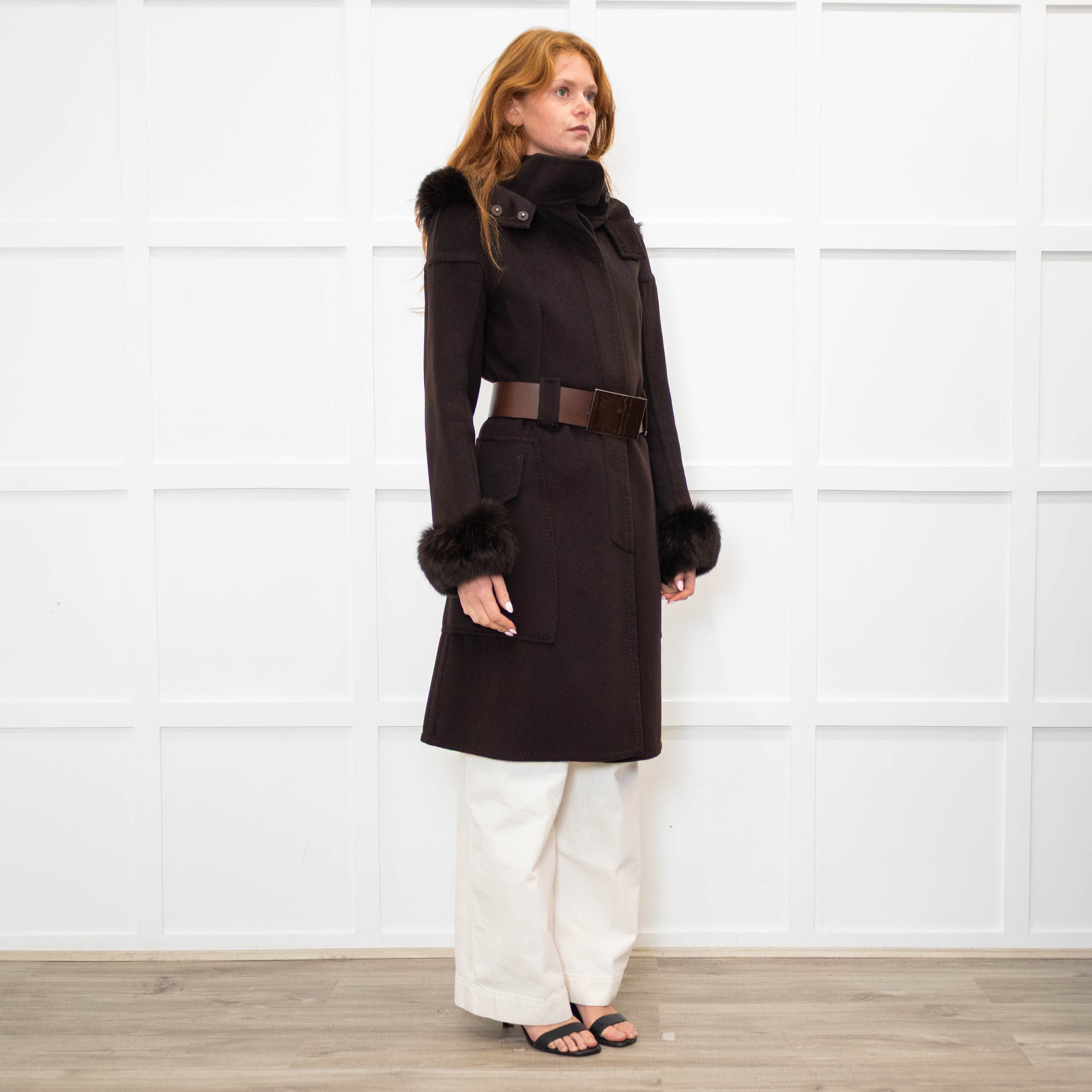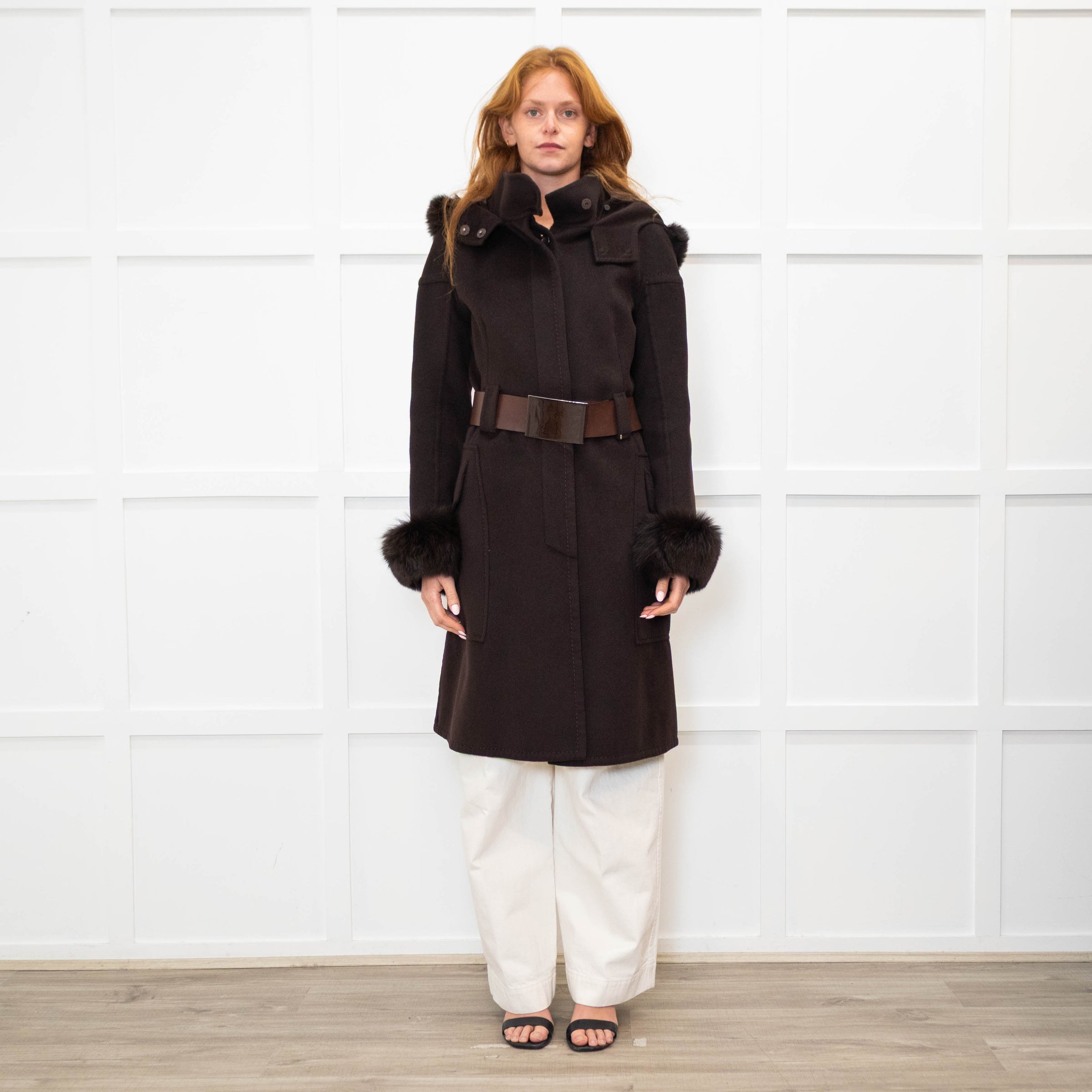 Sportmax brown angora wool blend hooded unlined coat with fur trim around the cuffs and hood, a chunky brown leather belt at the waist, side flap pockets, chunky topstitched detailing, and a button-up front.