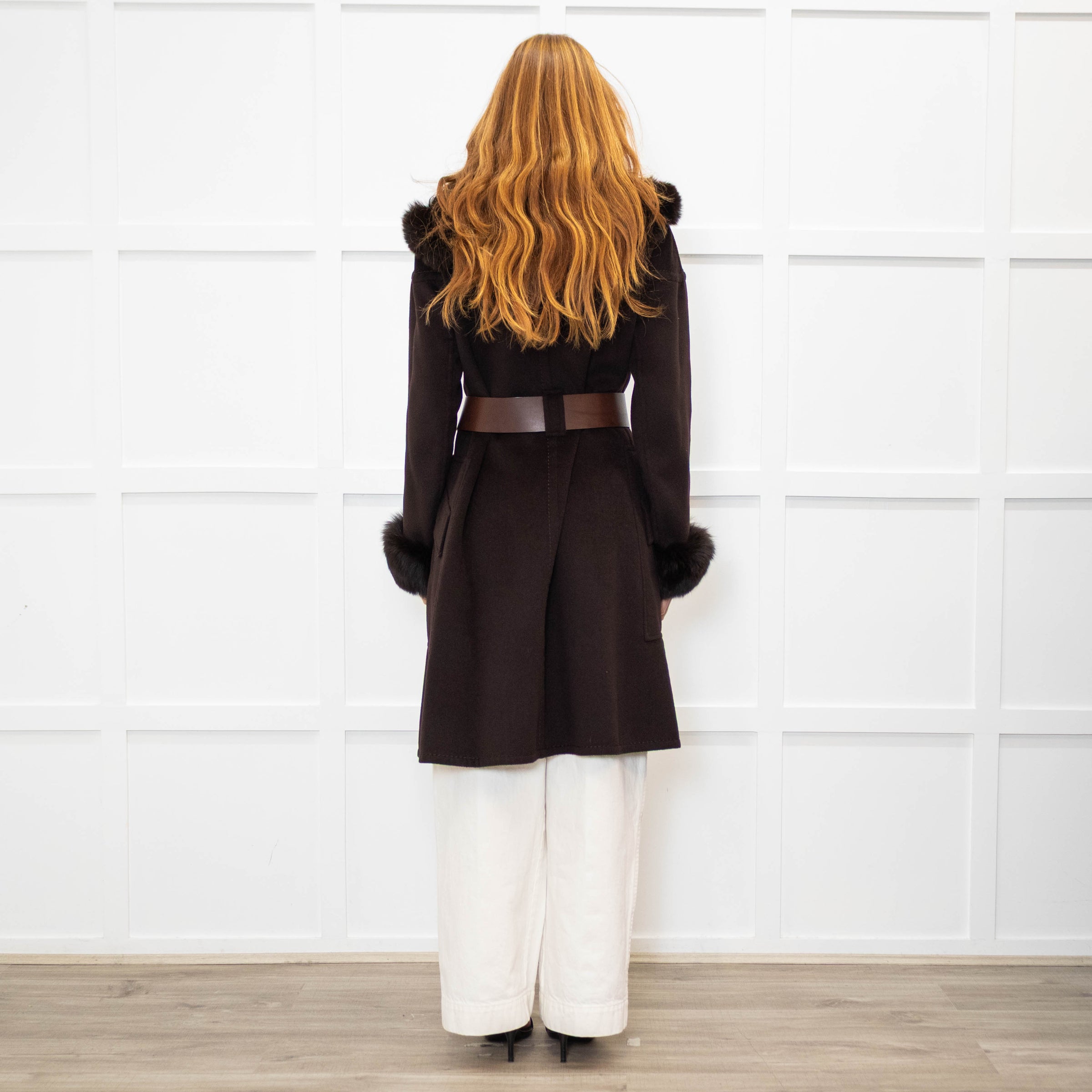 Sportmax Brown Fur Trim Hooded Belted Coat