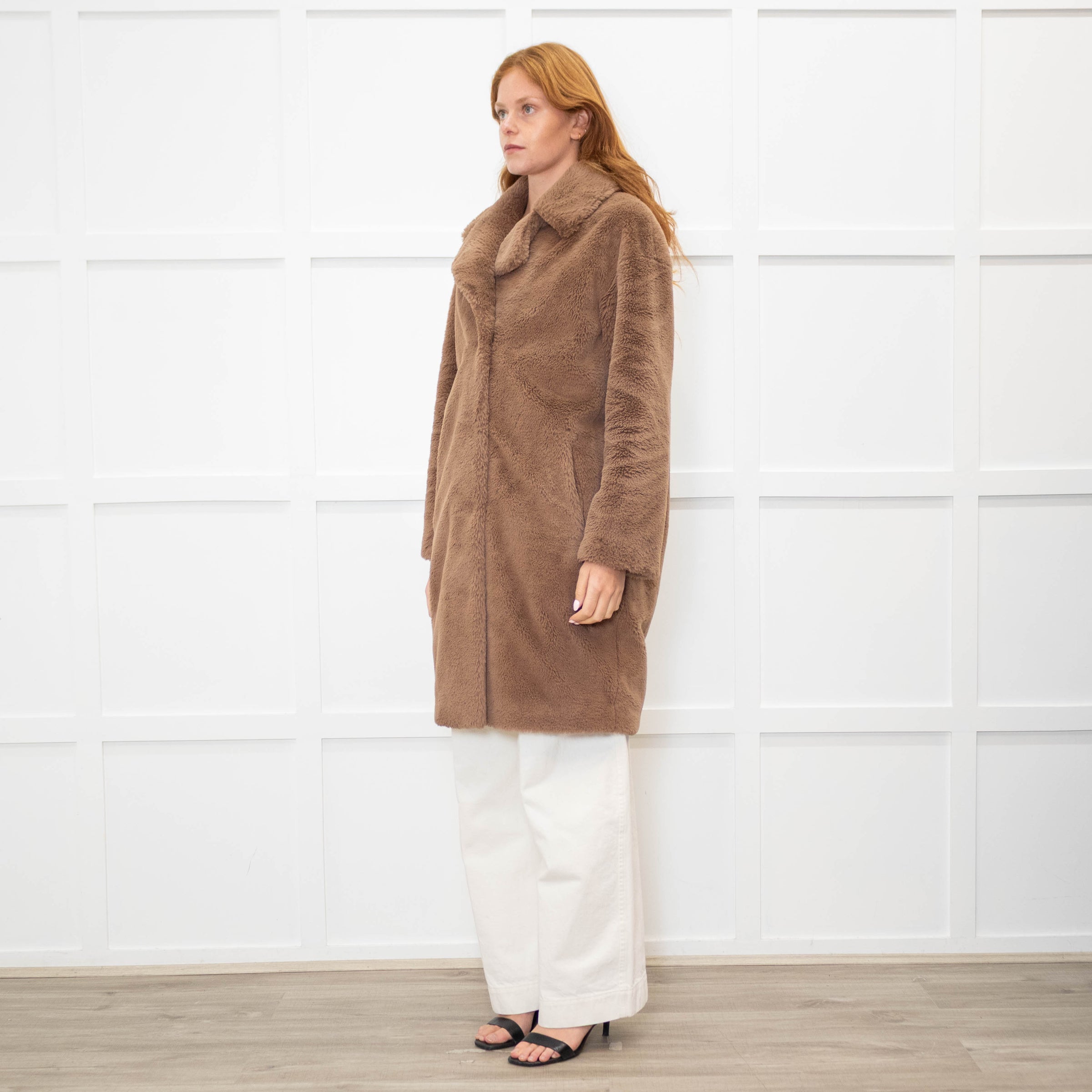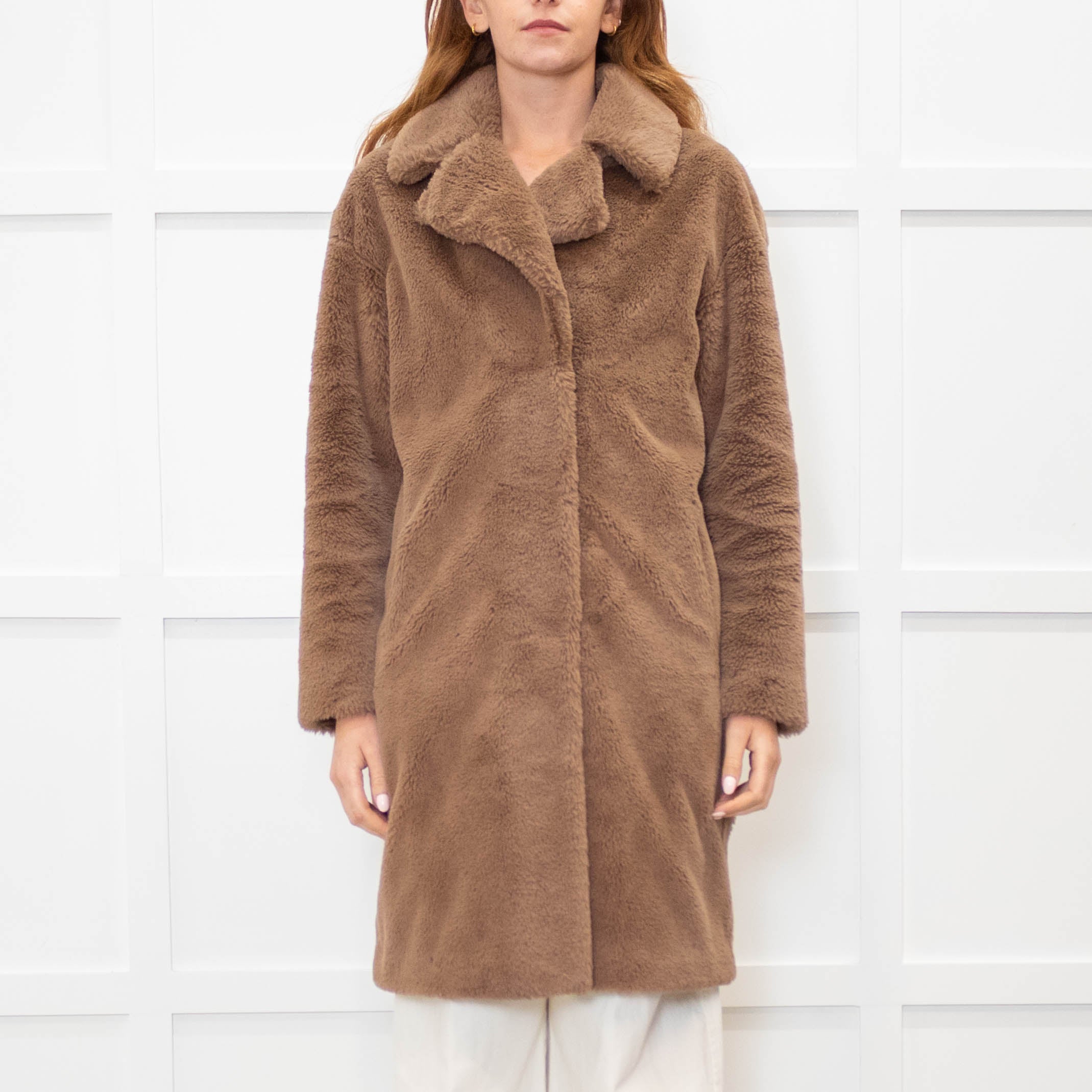 Stand Studio brown faux fur longling teddy coat with a notch collar and lapel, long sleeves, side slip pockets, and a poppered front fastening.