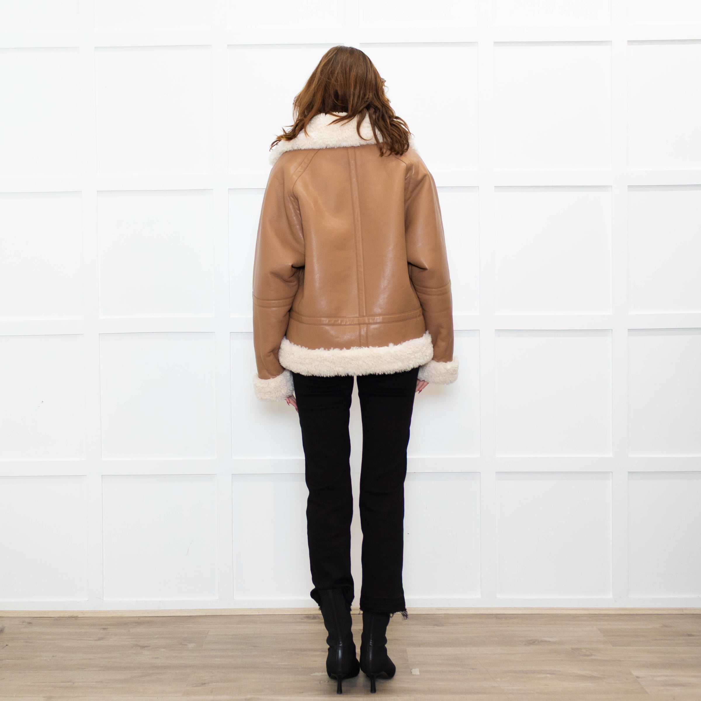 Stand Studio camel faux leather flight aviator jacket with front zip closure, two side slip pockets, and cream faux shearling.