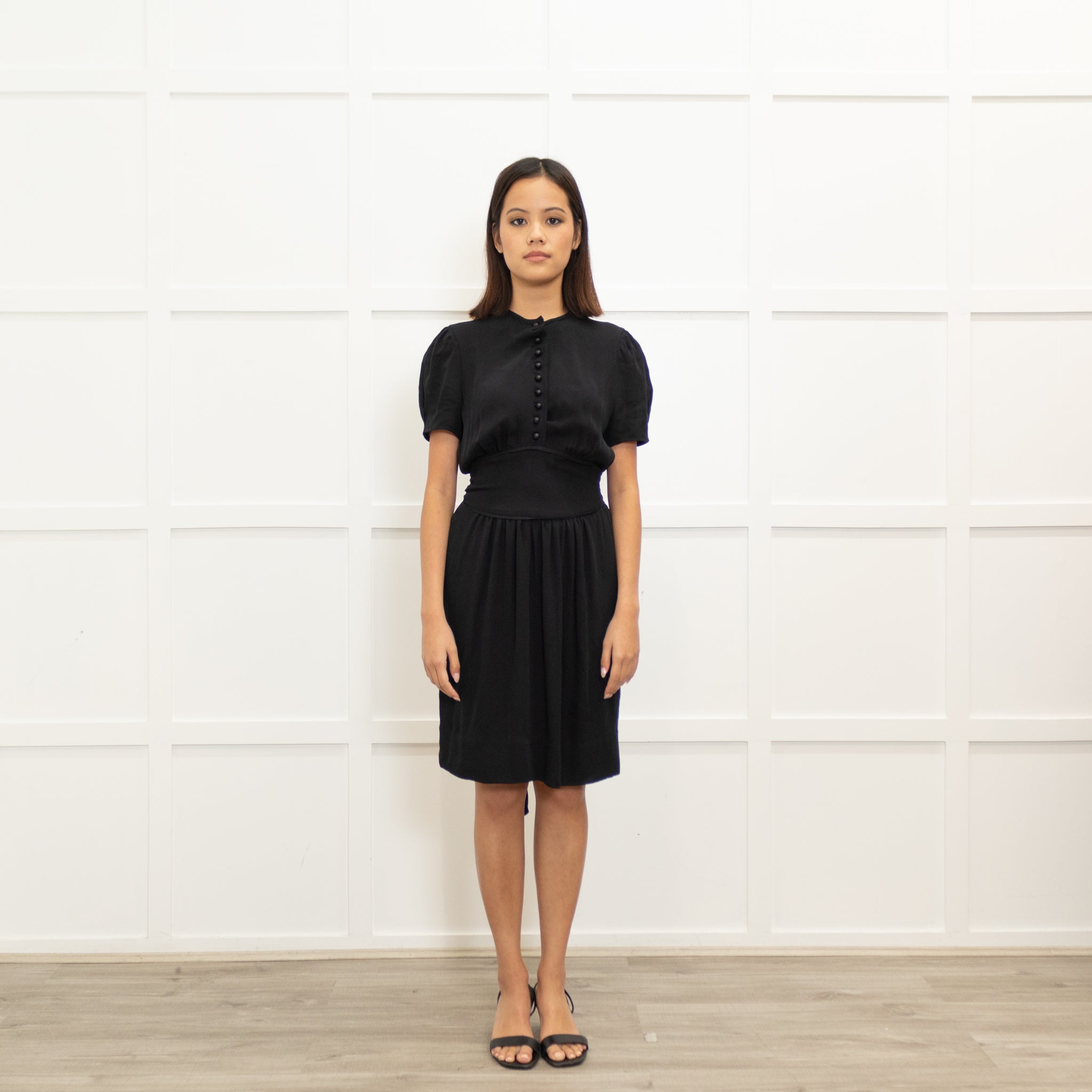 Stella McCartney black silk short dress with a button front and matching belt. This dress also features a pleated skirt and a rounded neckline.