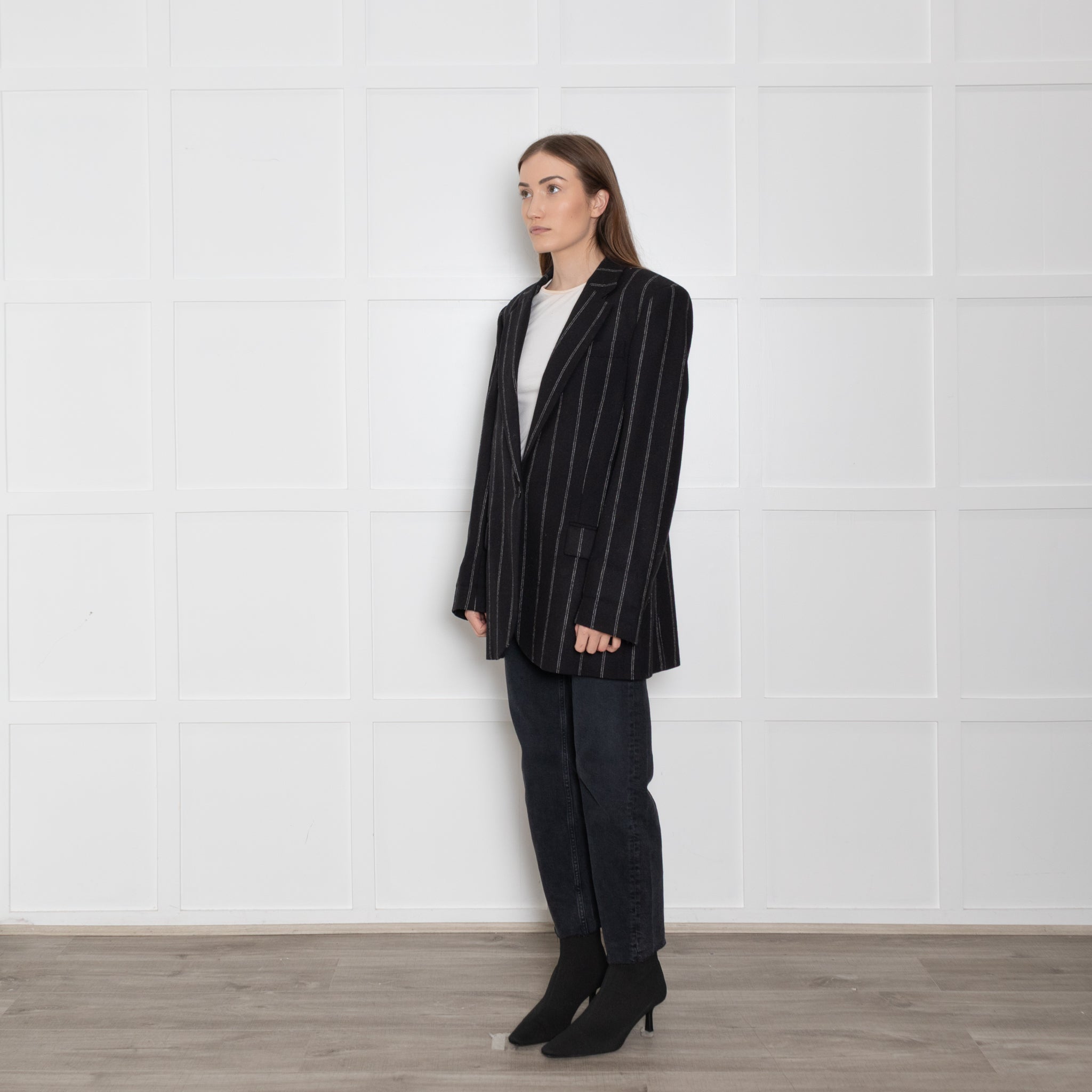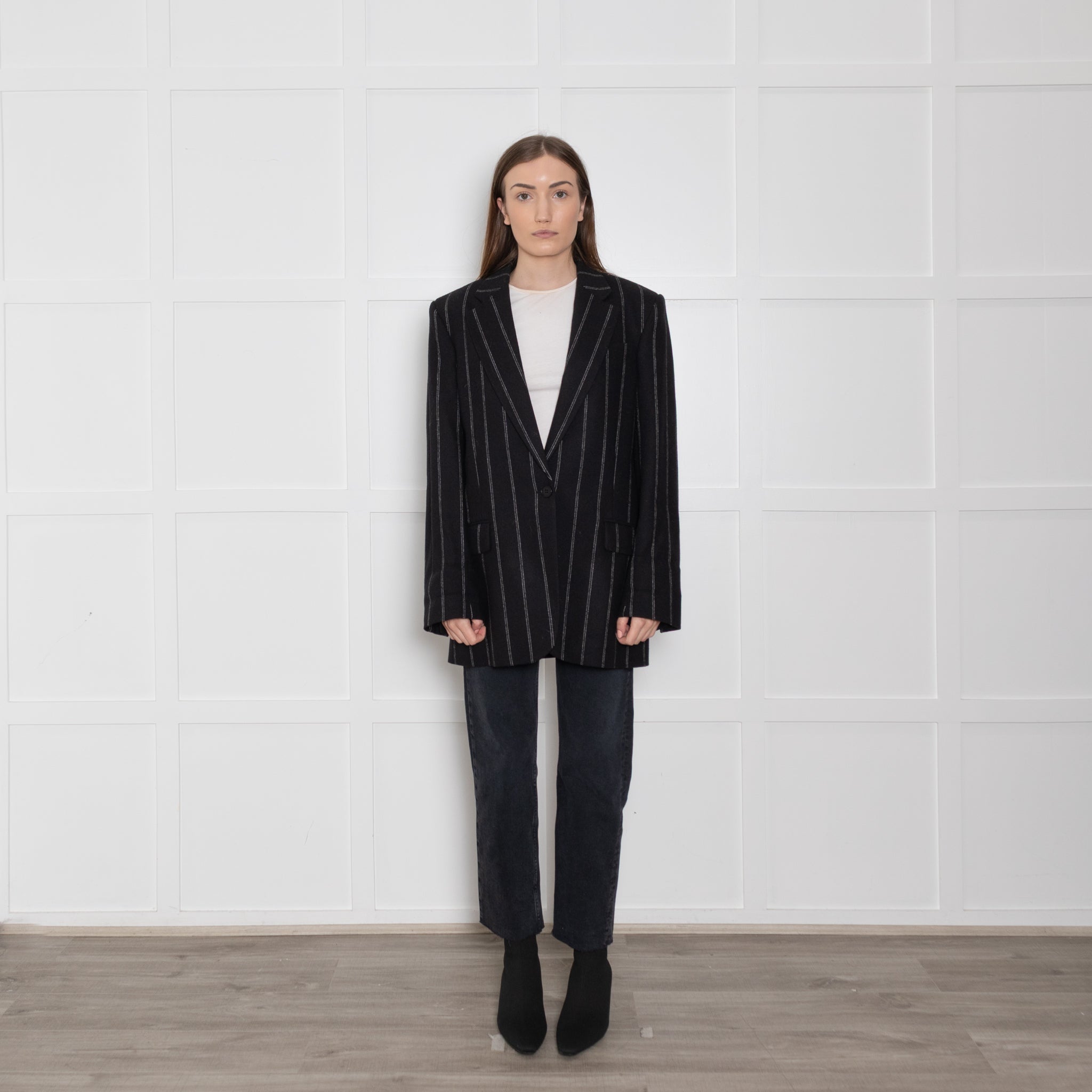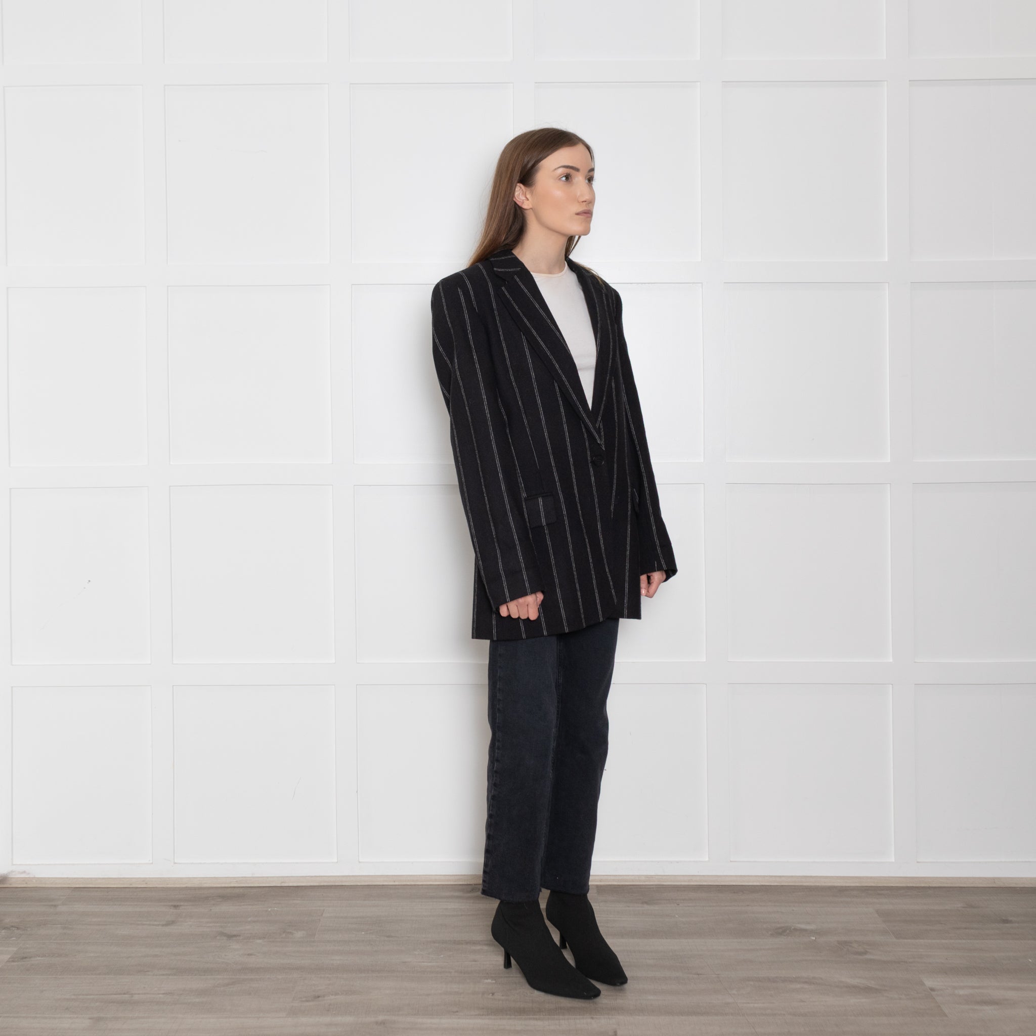 Stella McCartney black and white boyfriend blazer, featuring a stunning pin-stripe design, classic long collar, with a single button-up front design, and two front pockets.