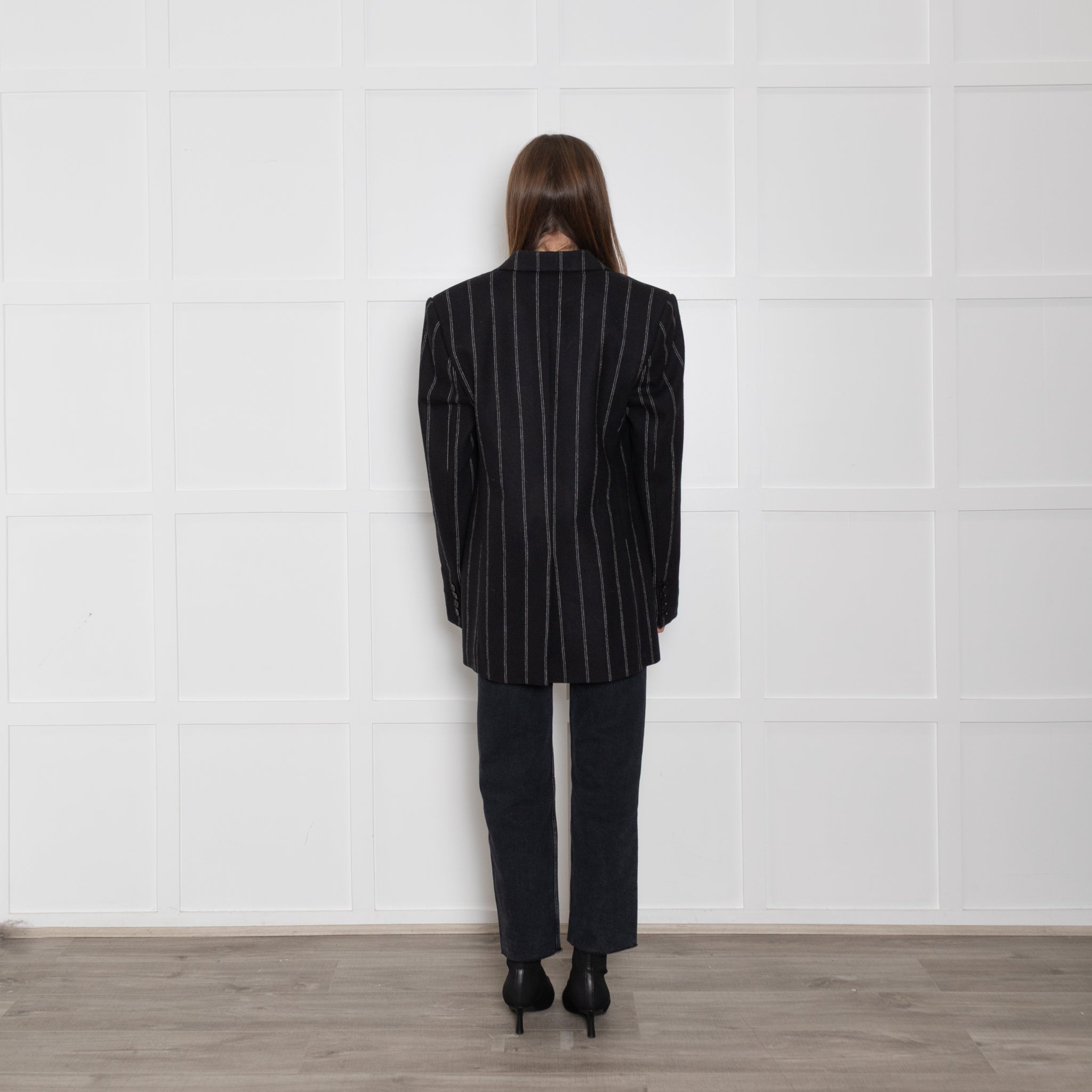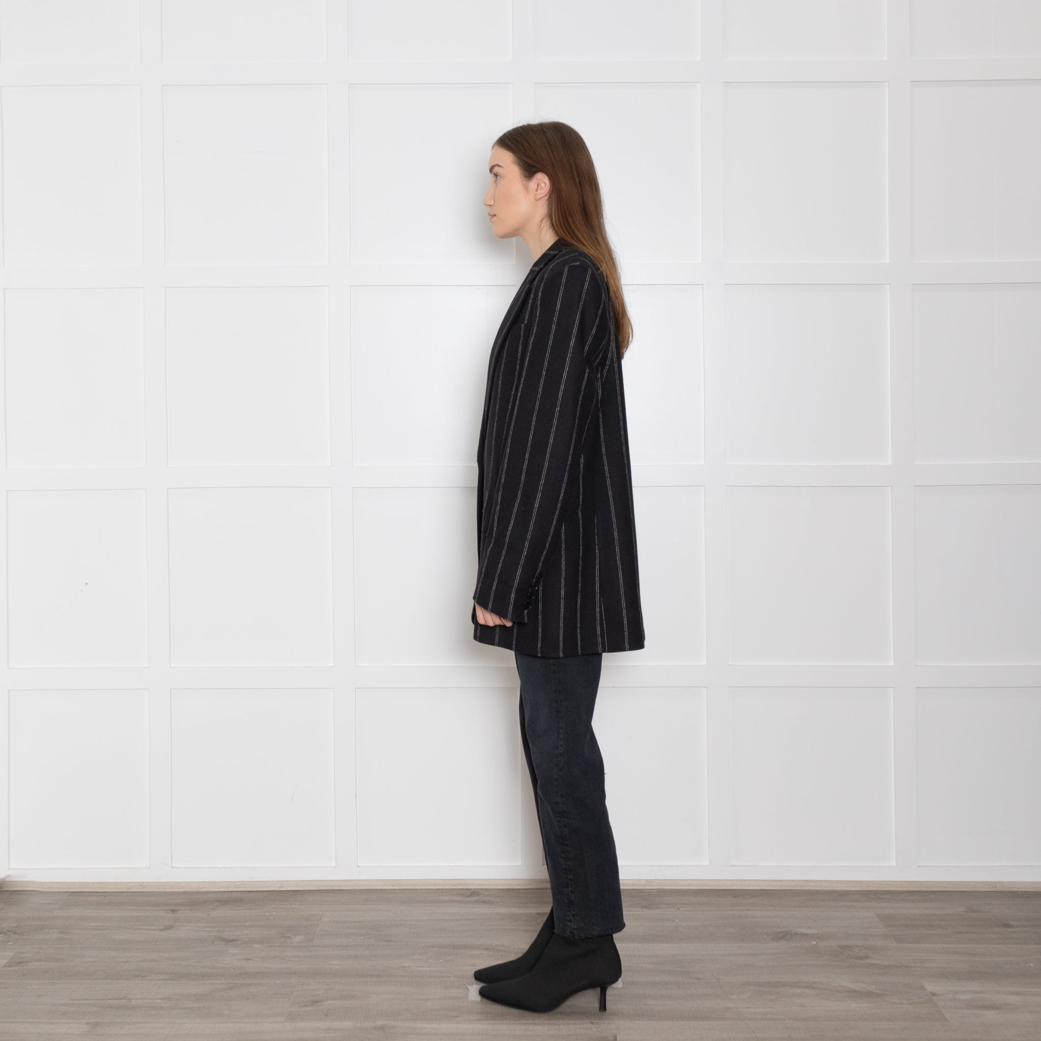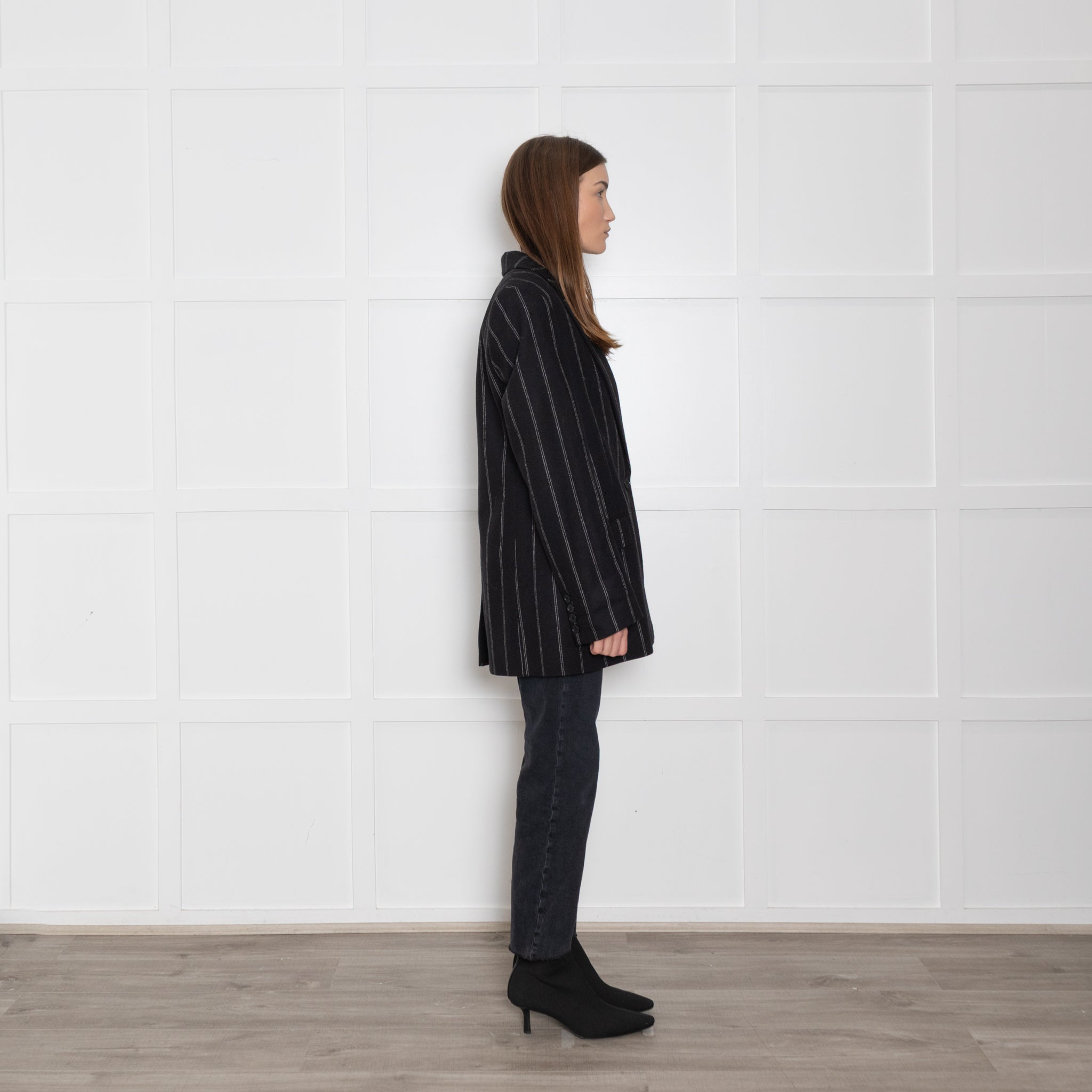 Stella McCartney black and white boyfriend blazer, featuring a stunning pin-stripe design, classic long collar, with a single button-up front design, and two front pockets.