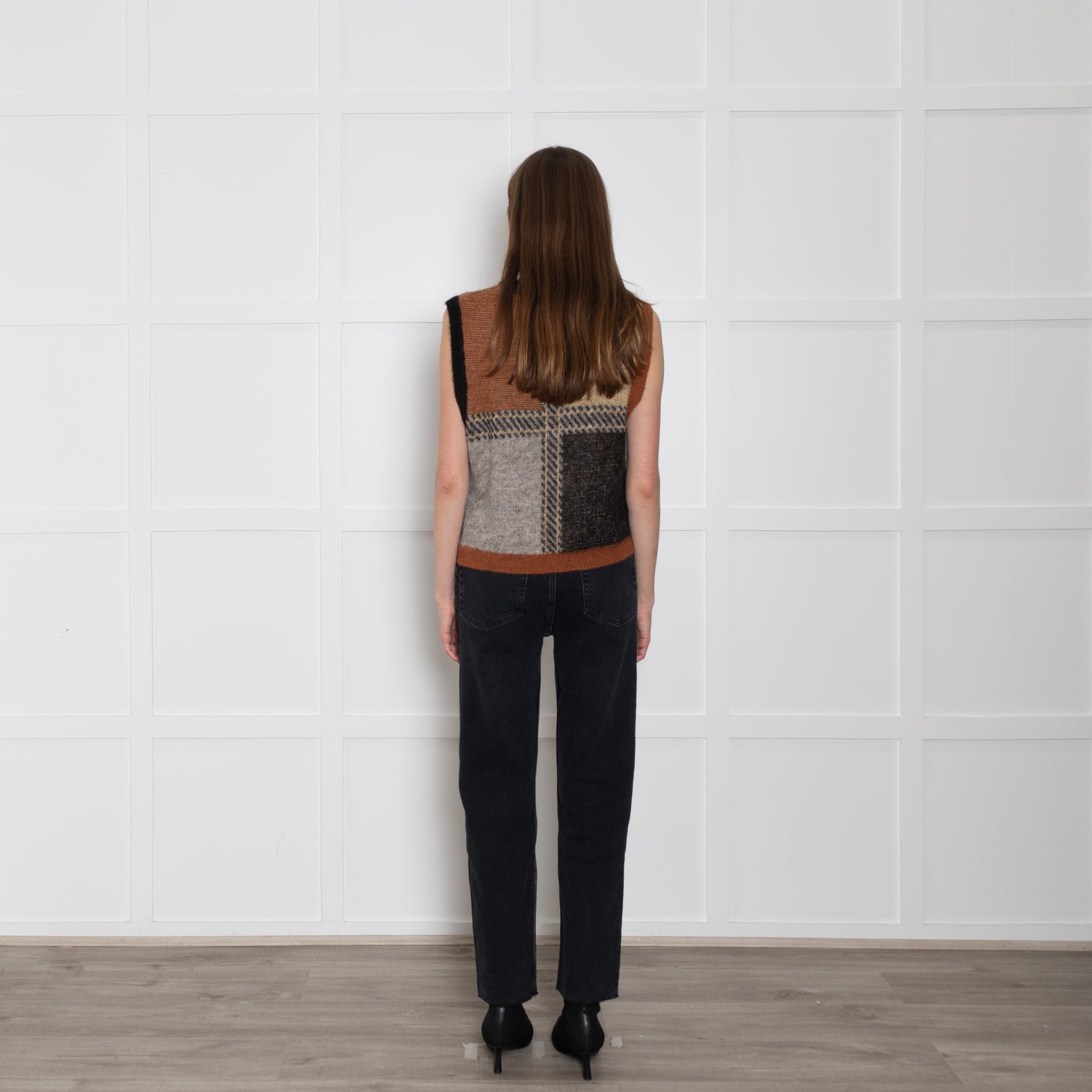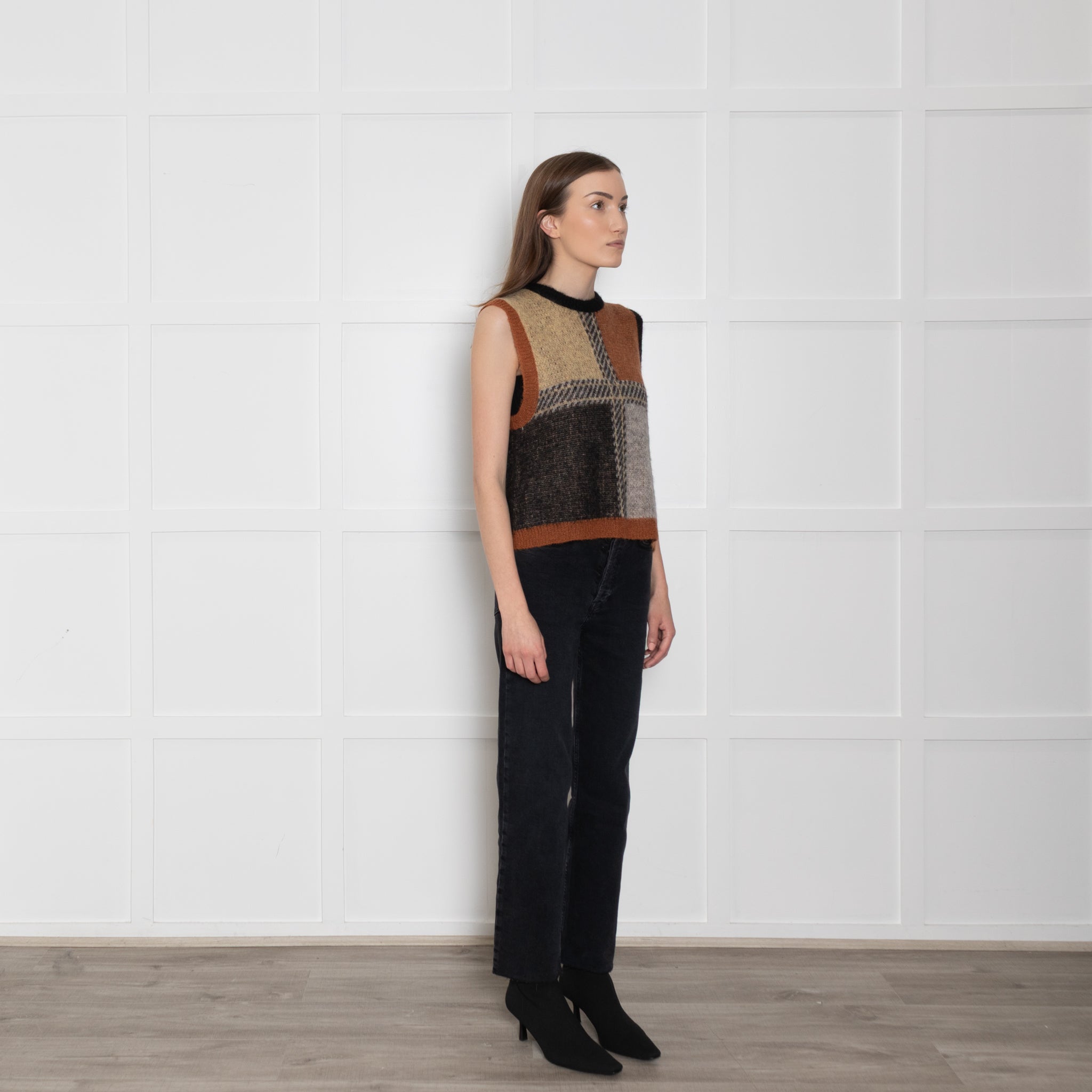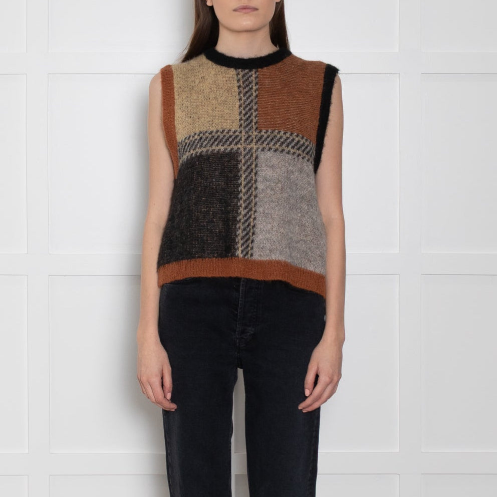 Stella Nova brown check knitted vest with a patchwork colour effect, rounded neckline, and ribbed trims.