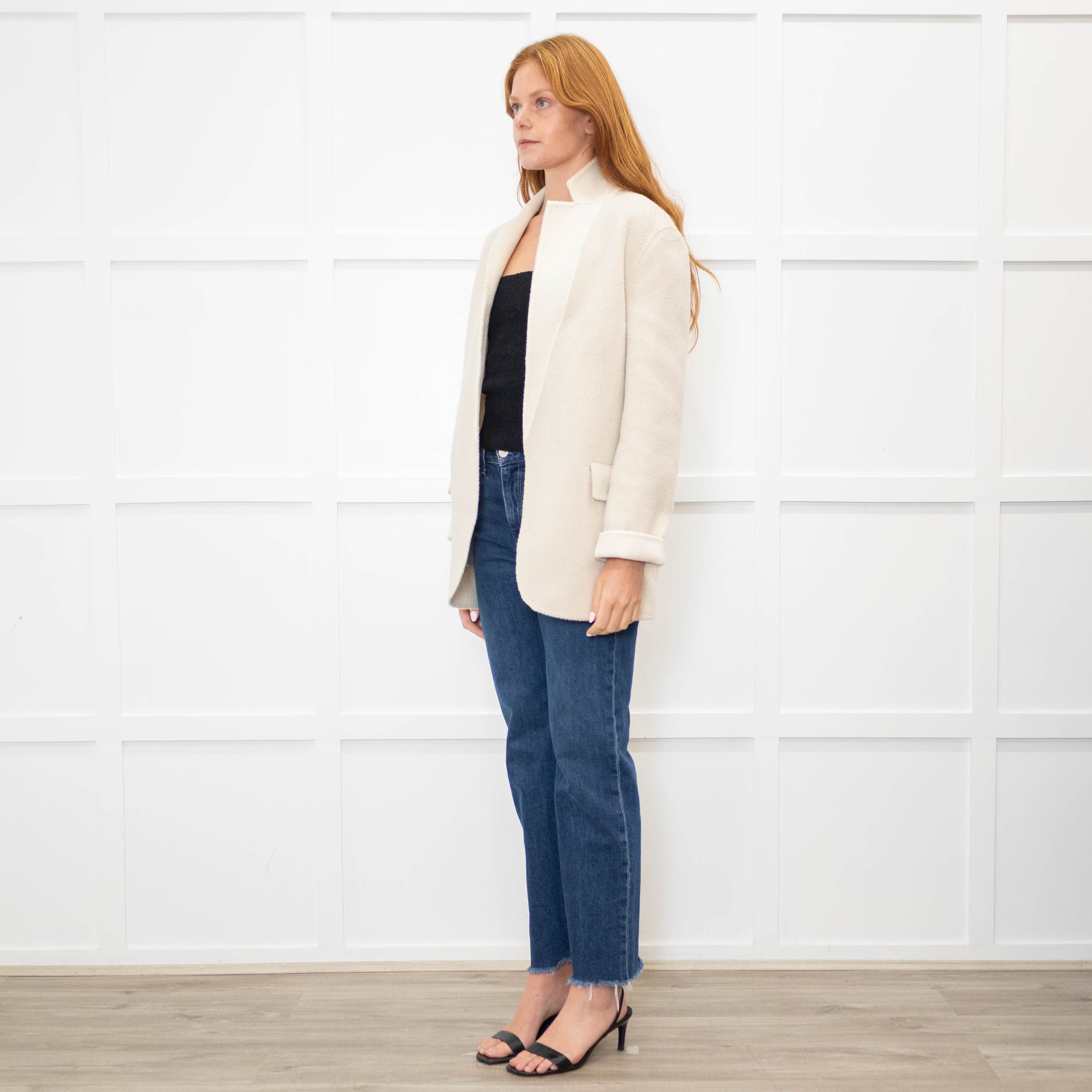 Theory cream herringbone unlined jacket with two front flap pockets and a pointed collar and lapel.