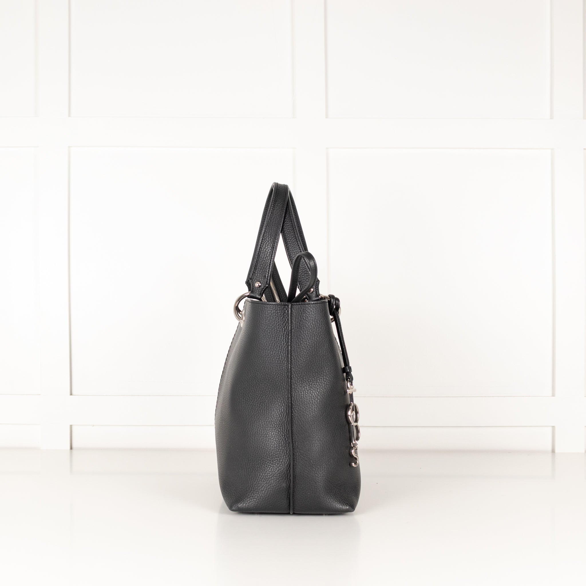 Tod's black pebble leather tote with silver-tone hardware, an attached logo pendant, dual top handles, and top zip closure. Internally, the bag features a suede lining and 3 slip pockets.