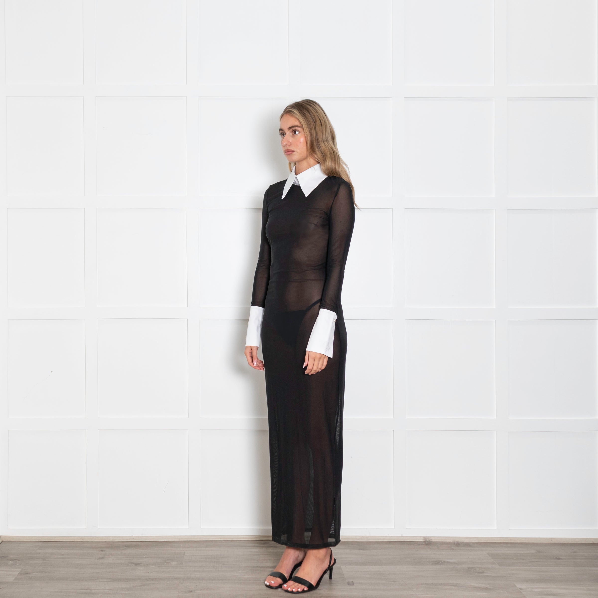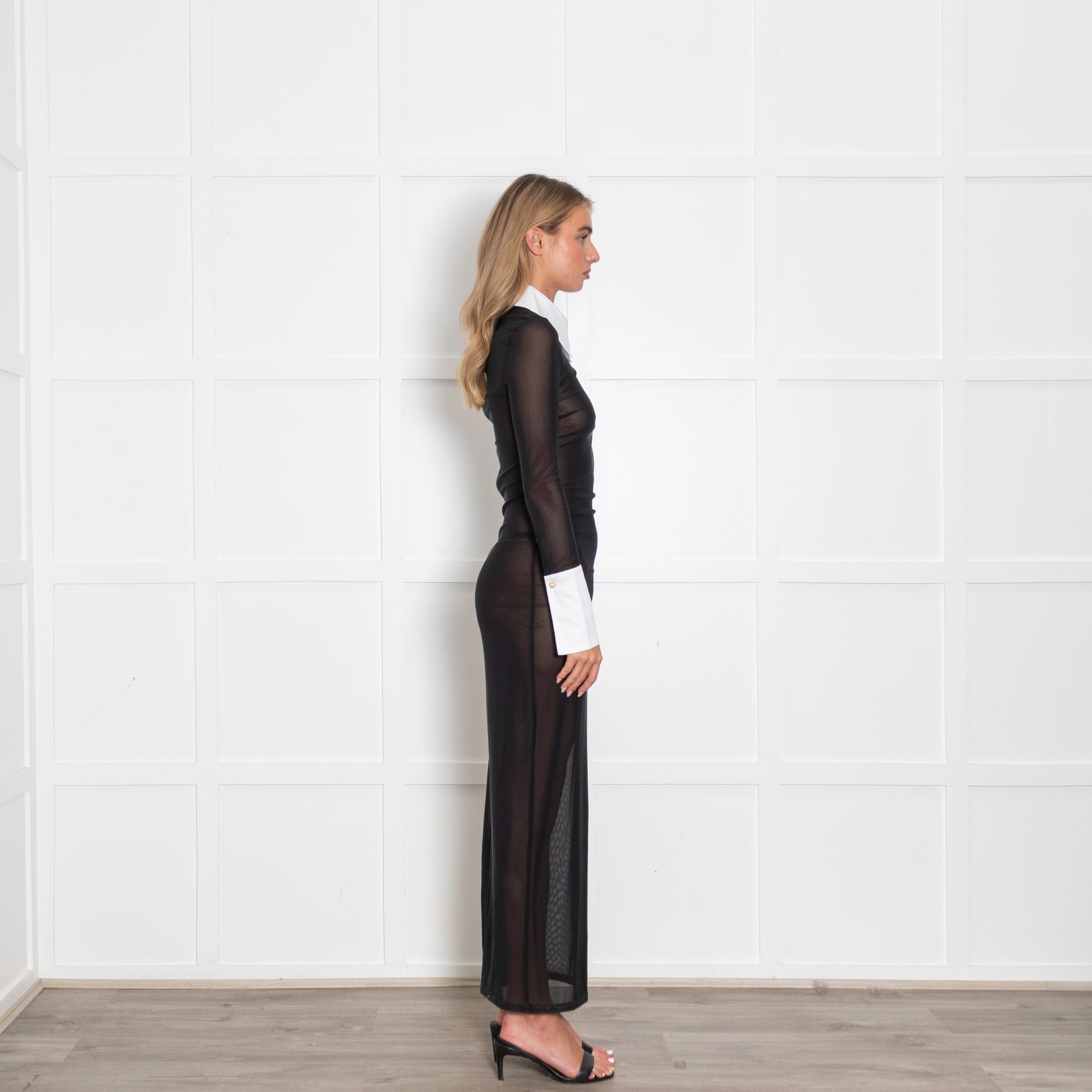 Tokyo Foxtrot long-sleeve maxi black dress, crafted with sheer fabric, featuring a shirt effect, with a white classic collar, long white sleeve wrists, as well as tiny gold and pearl accent charms on each wrist, for an elegant, stunning effect. This dress features a back zip-up closure.