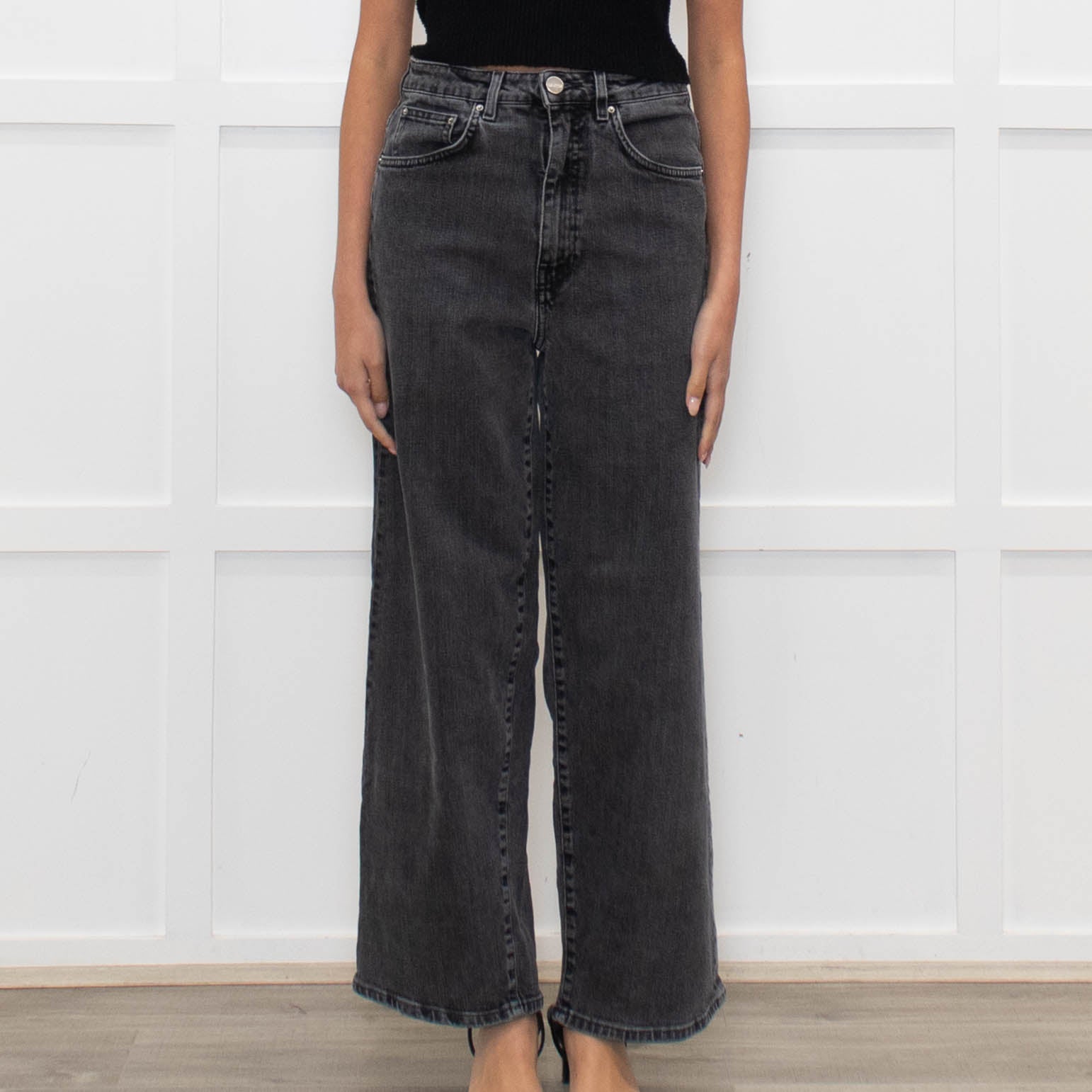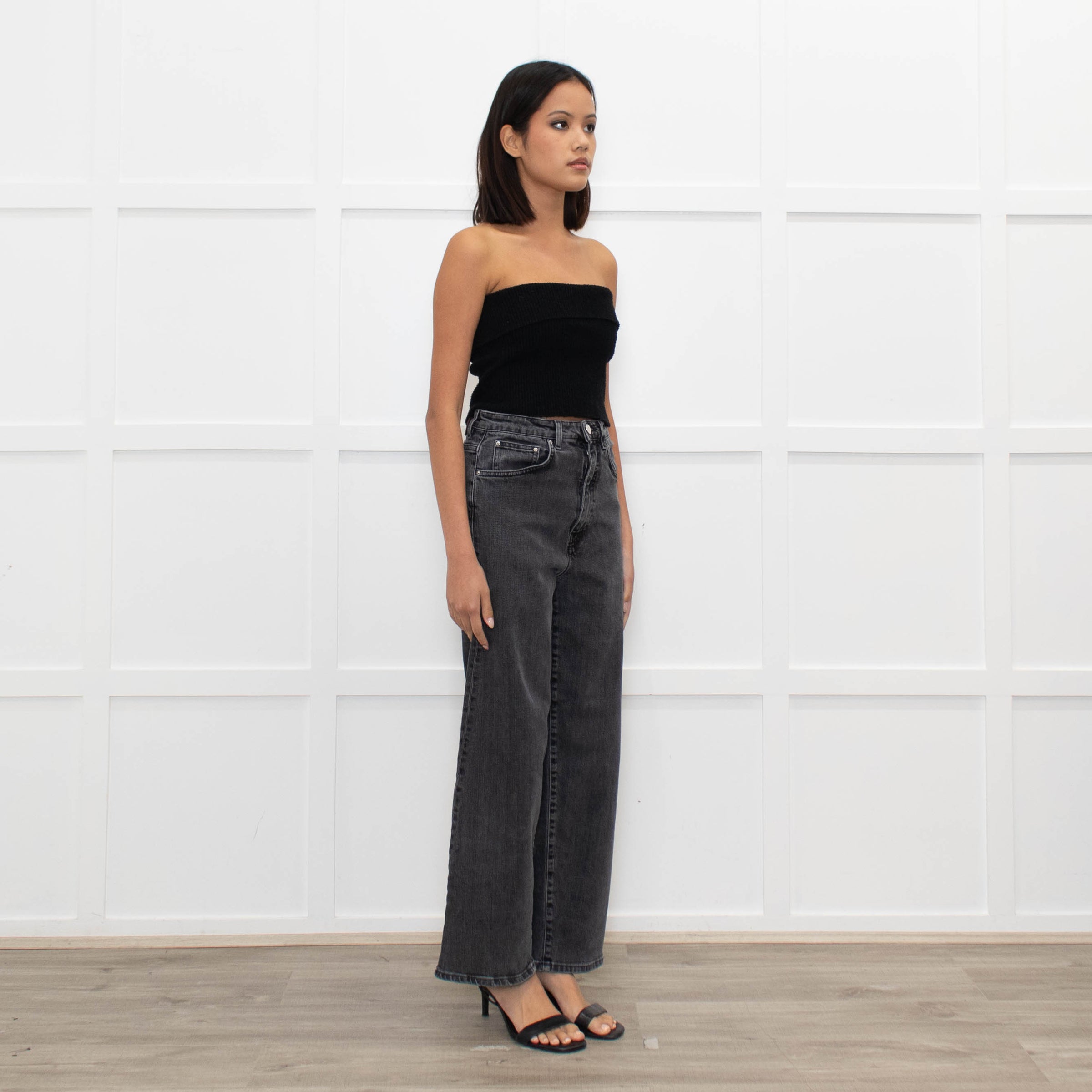 Toteme black washed wide-leg jeans with concealed front zip and button flies, five pockets, and belt loops.