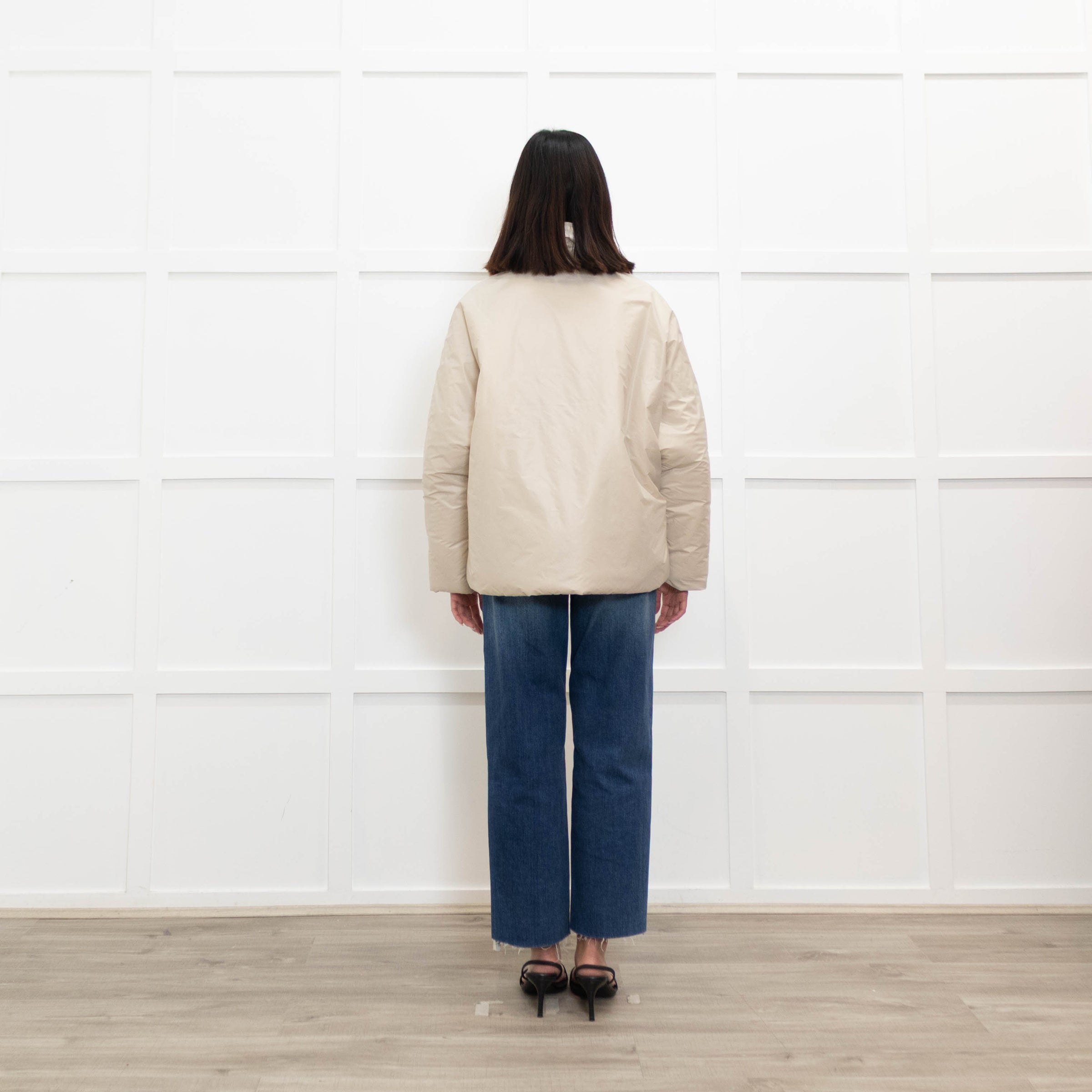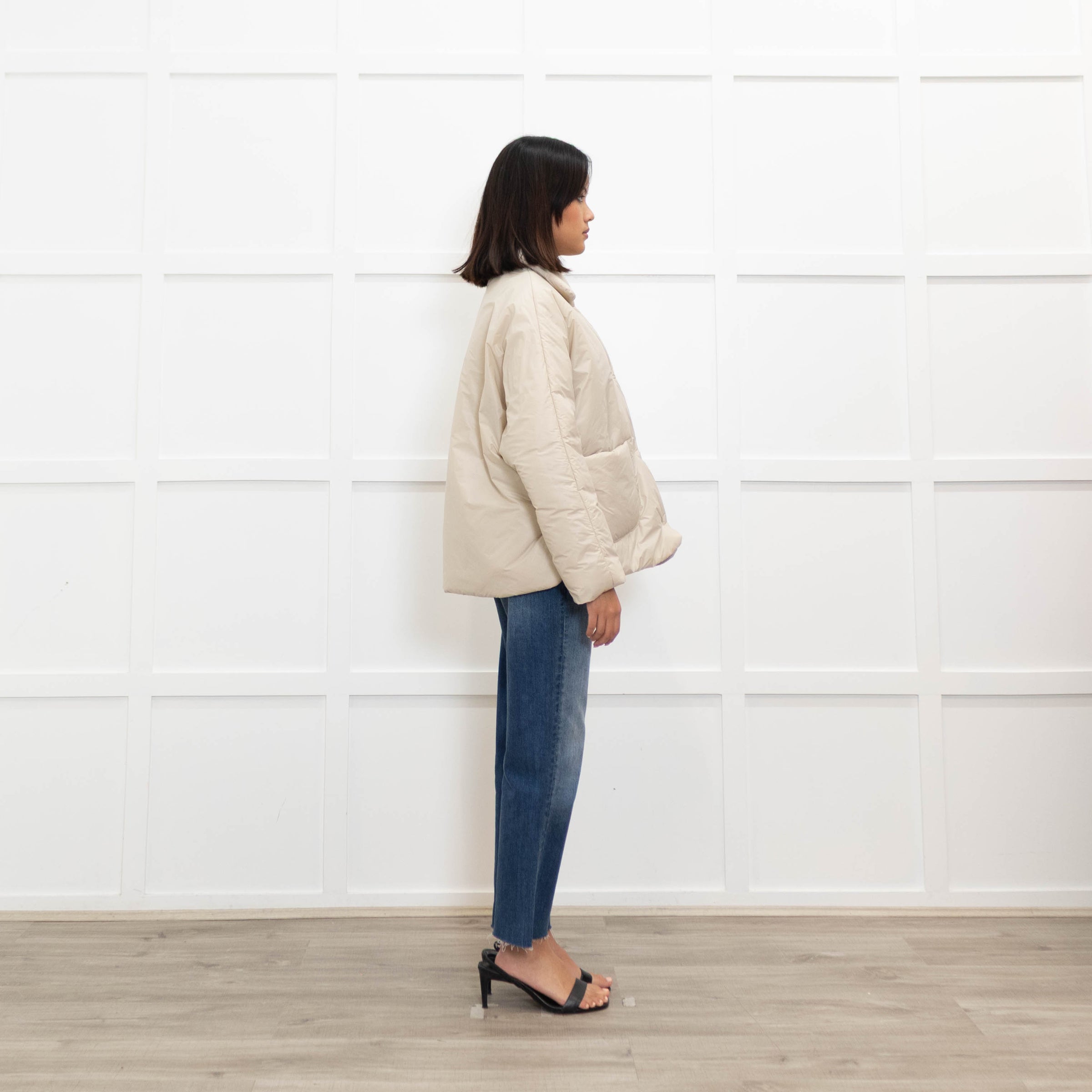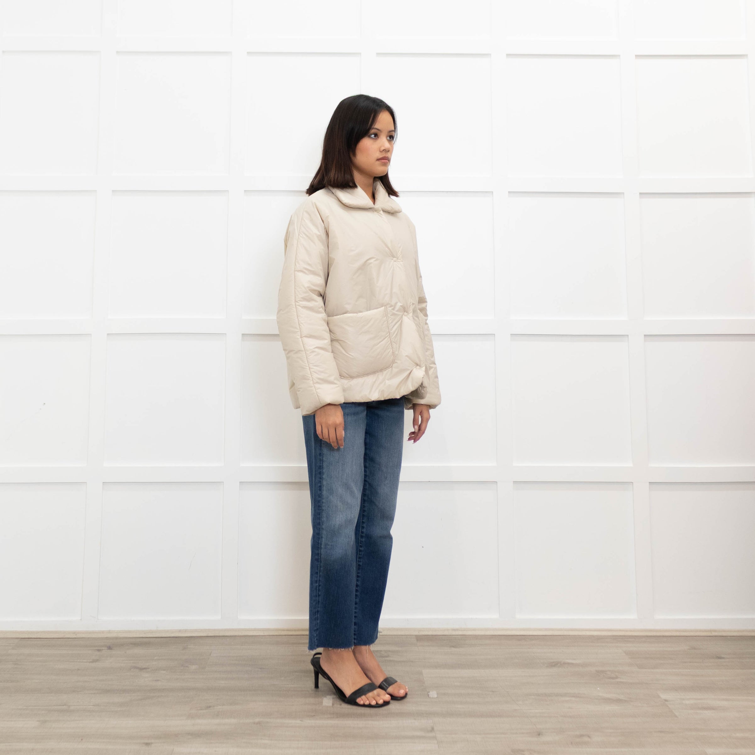 TreBarraBi gorgeous long-sleeve ivory nylon puffa jacket, featuring a button-up front closure, two large spacious pockets, a stunning classic collar design.