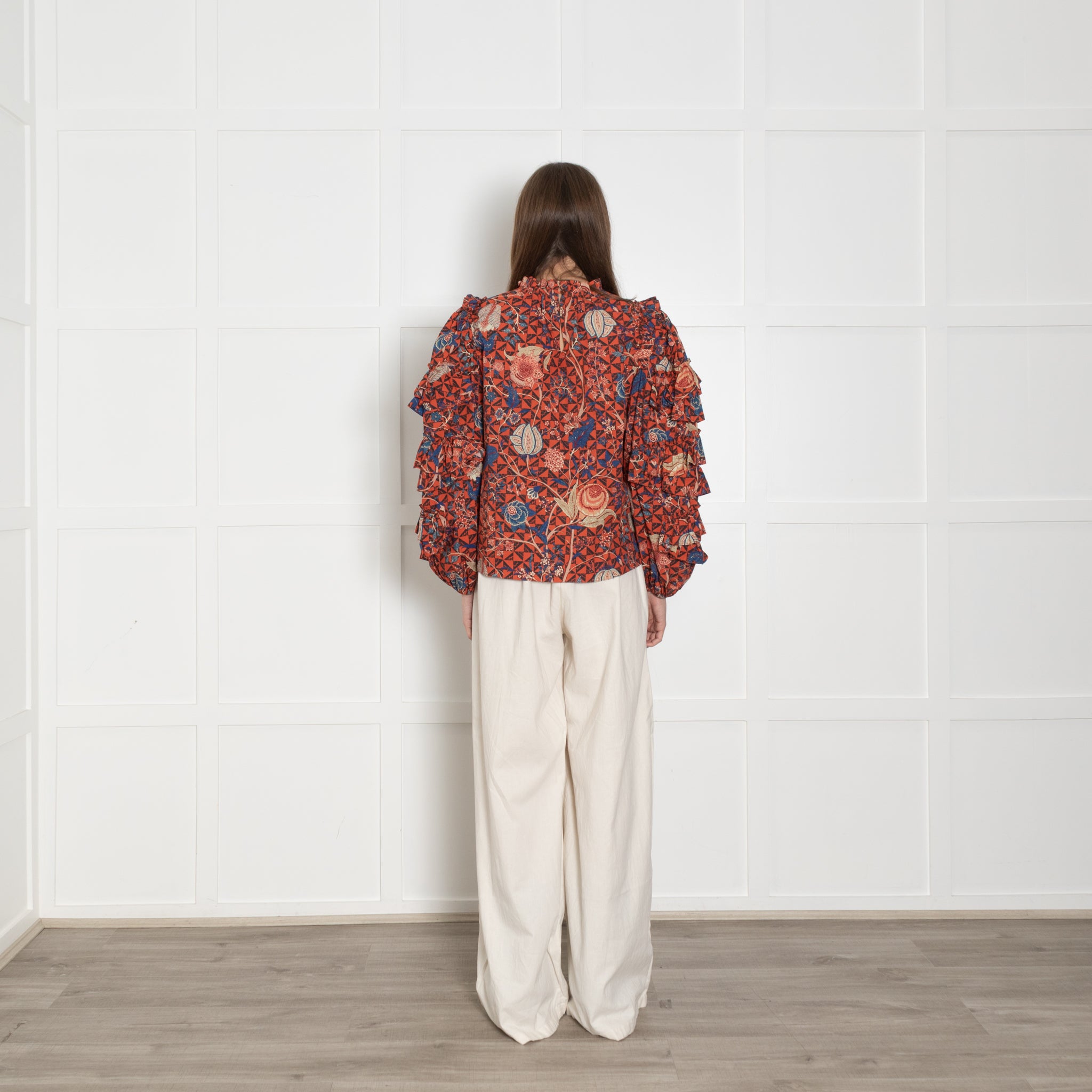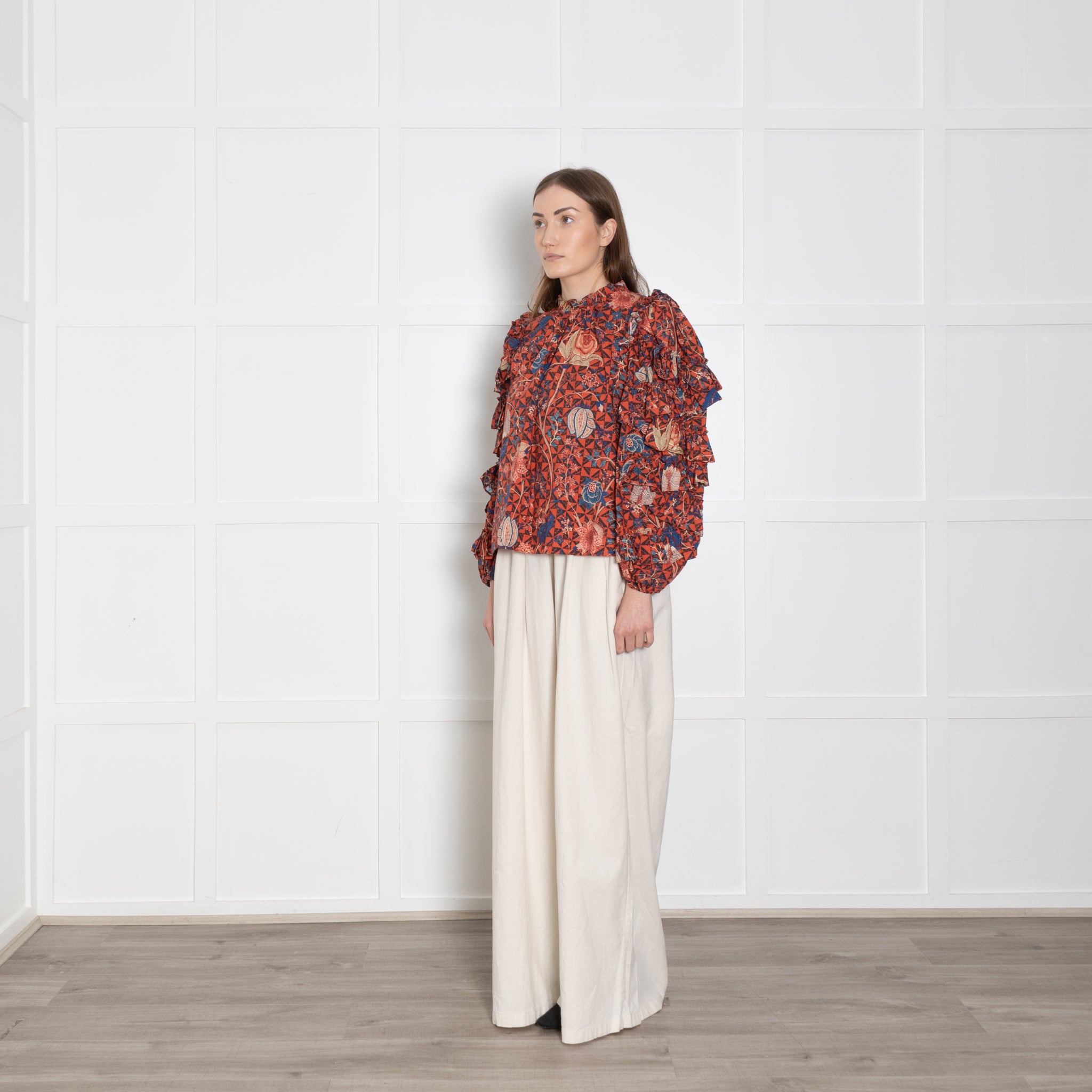 Ulla Johnson orange, blue, beige, and black floral blouse and ruffled sleeves and a ruffled high neck.