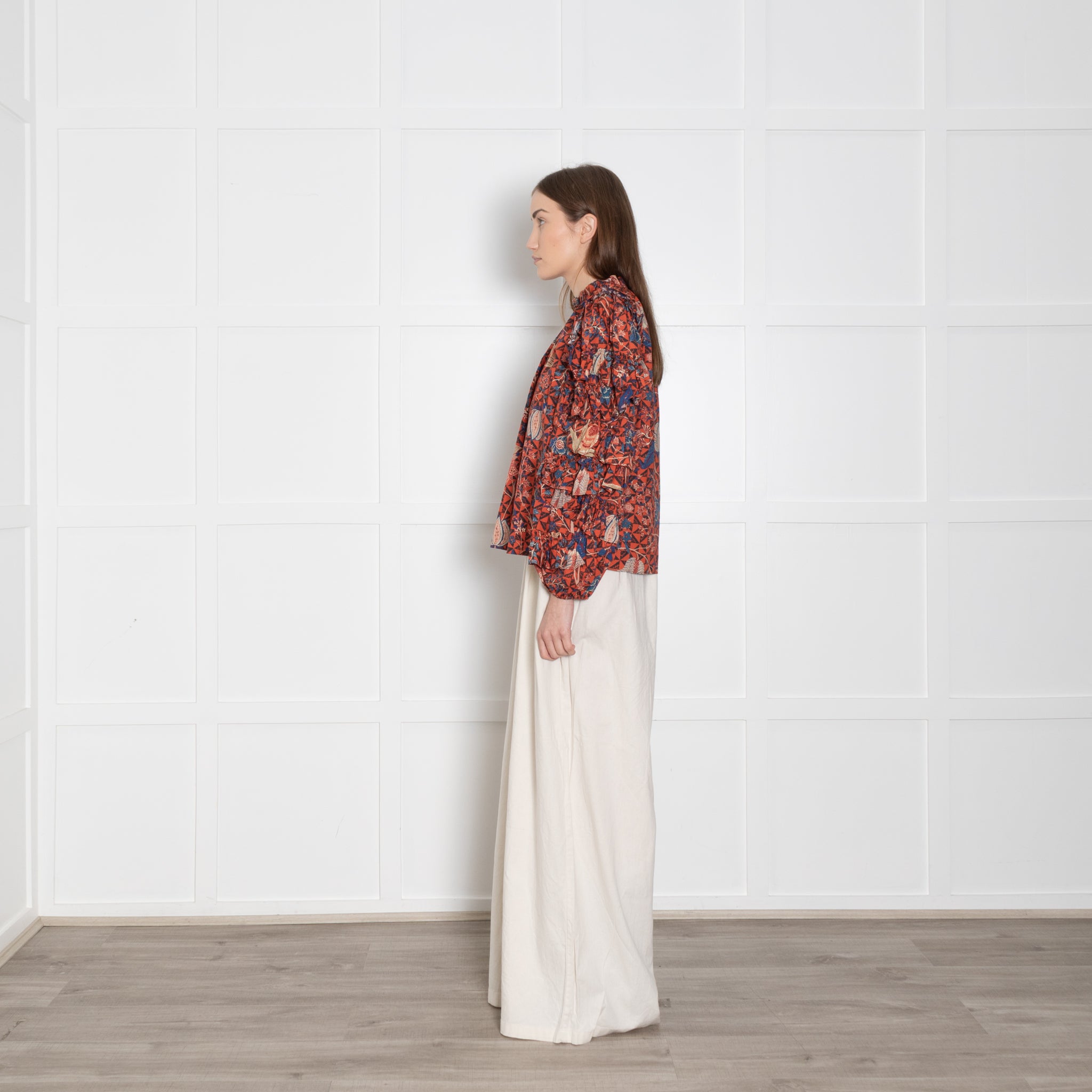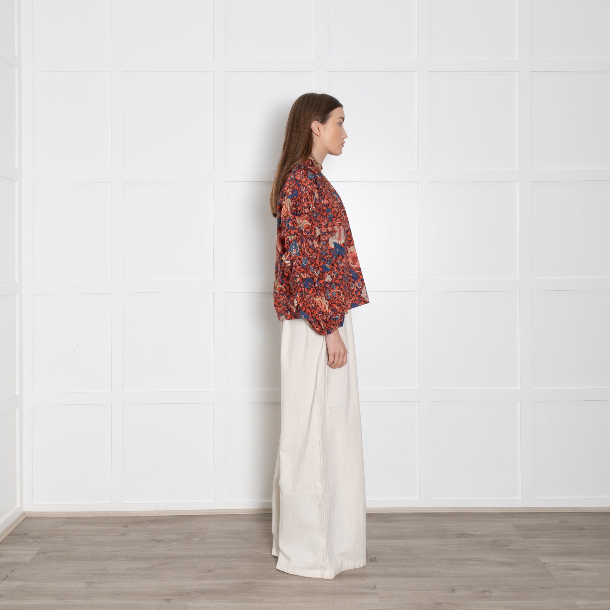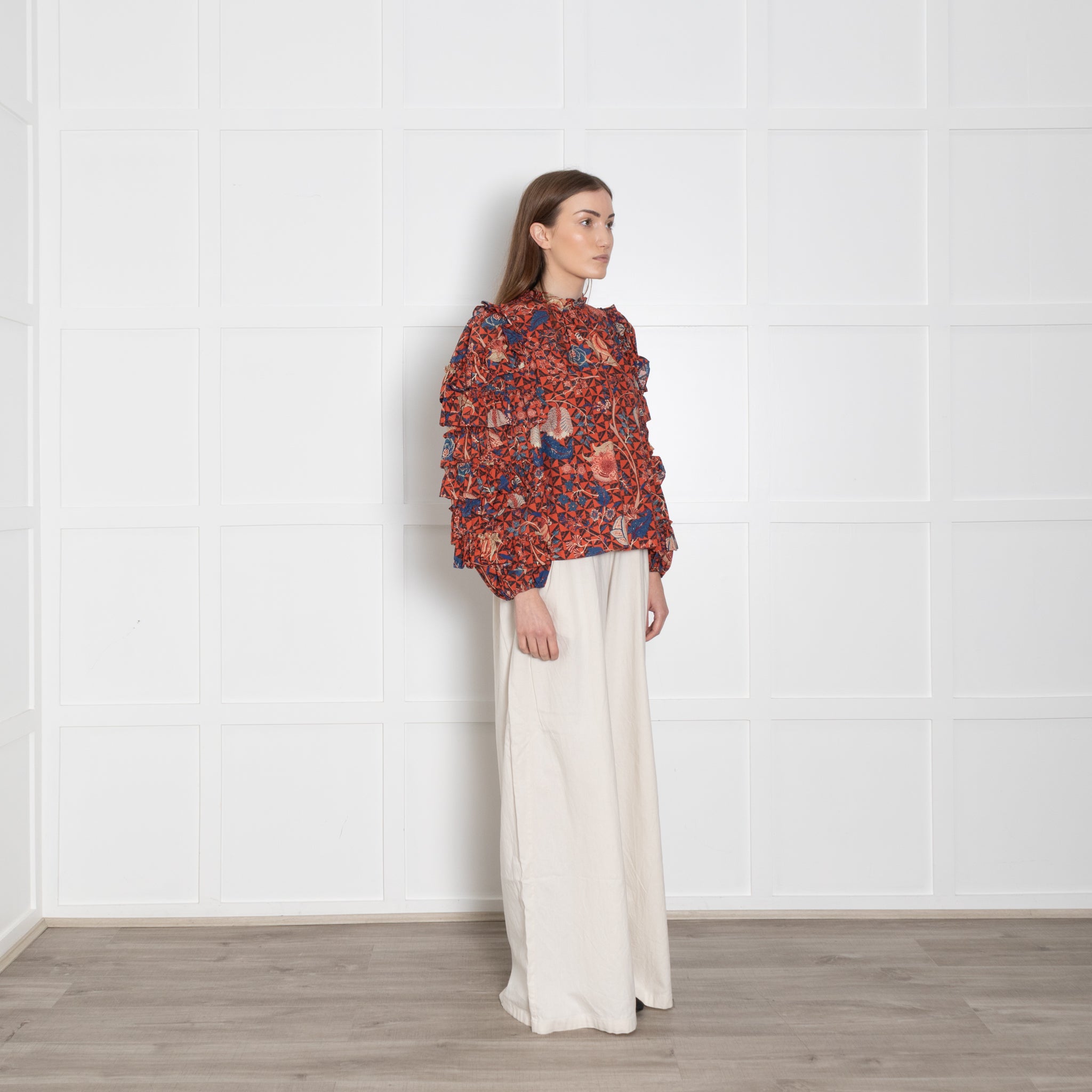 Ulla Johnson Orange, Blue, Beige, Black Floral Blouse & Ruffled Sleeves