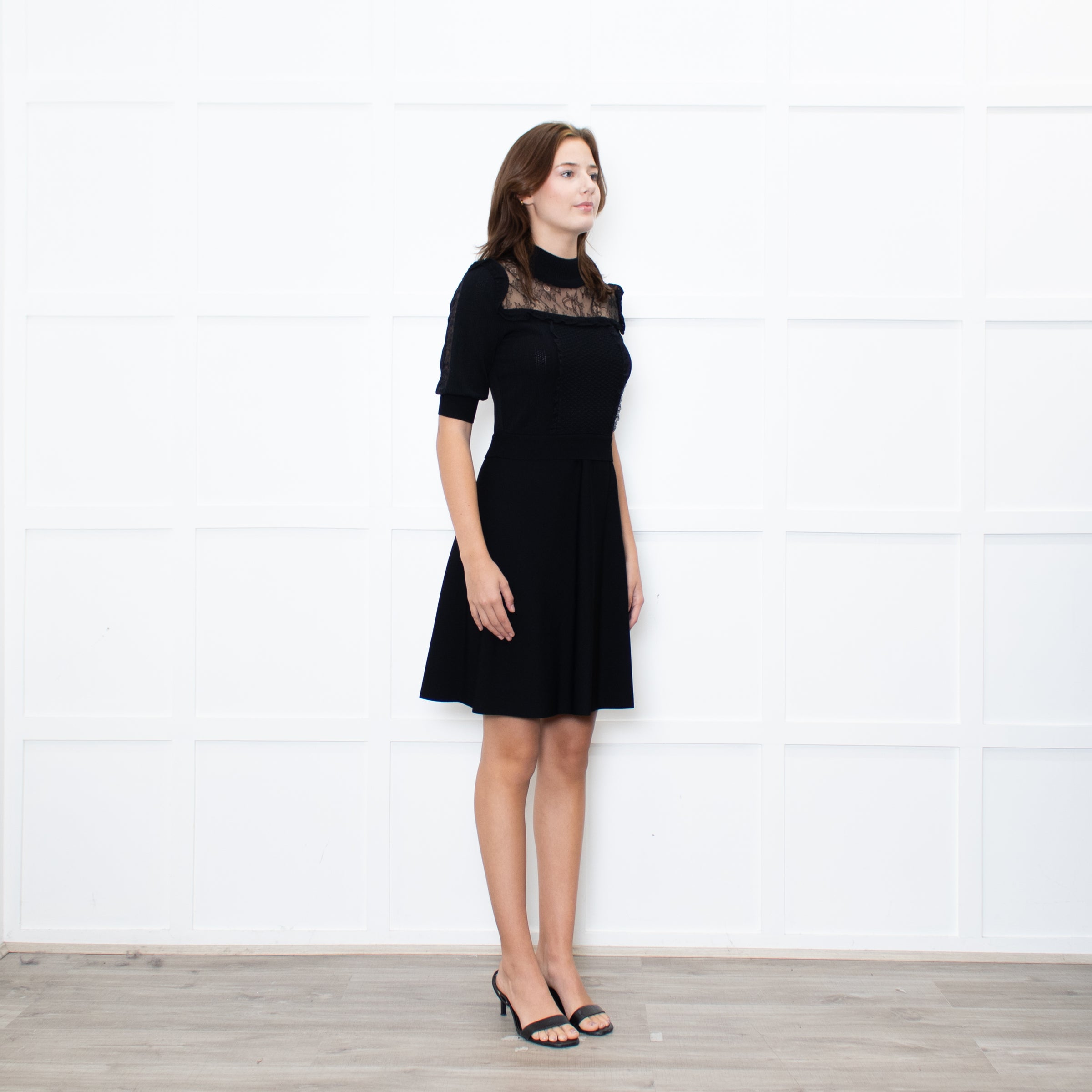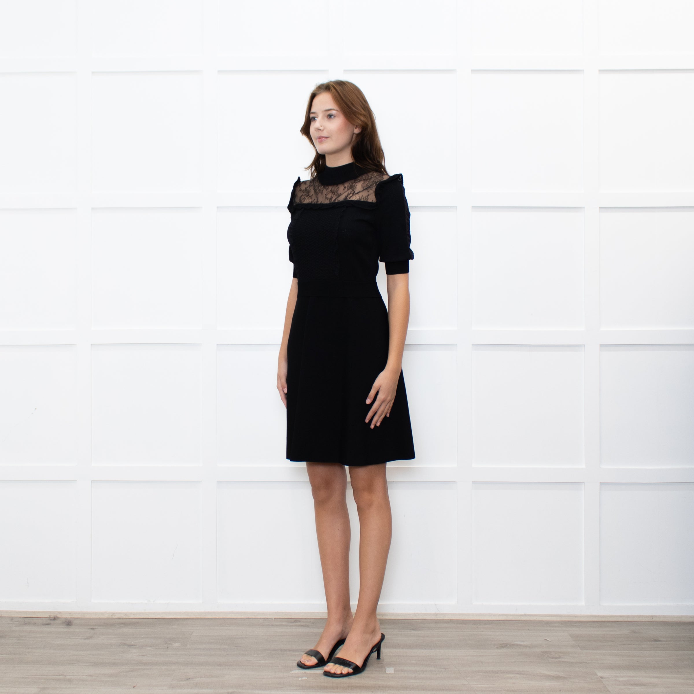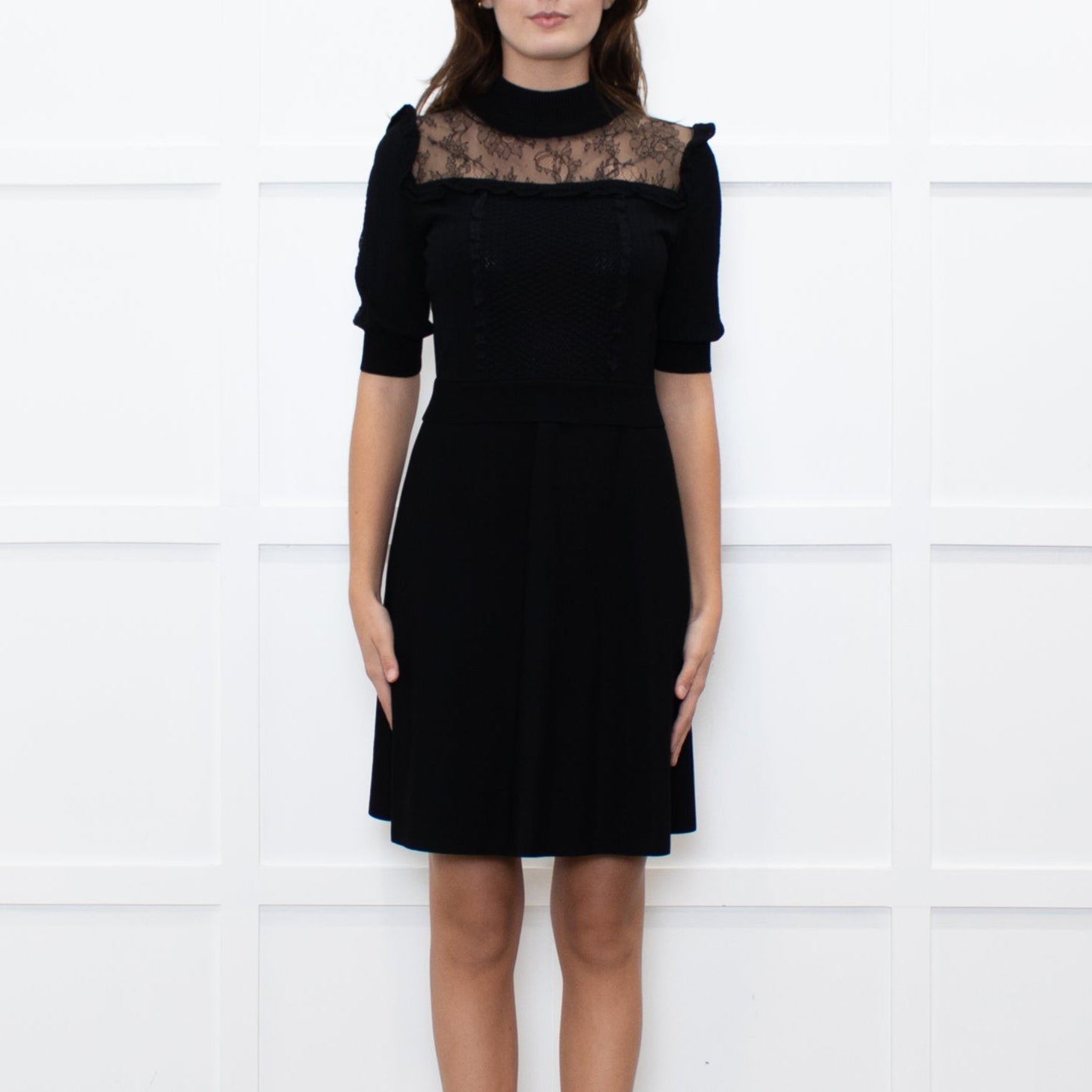 Valentino black short-sleeve lace panelled mini knitted dress with ribbed trim detailing and a high neckline.