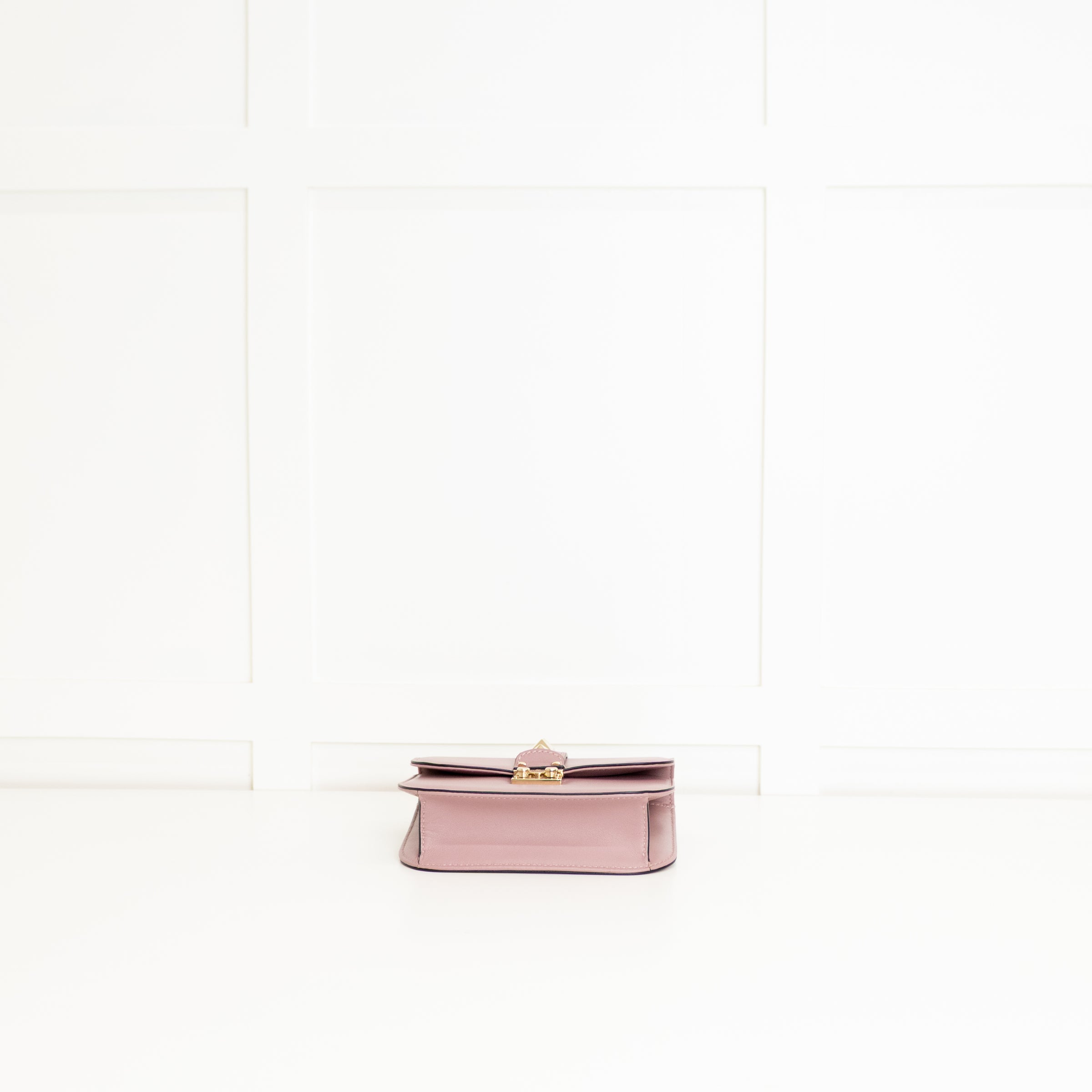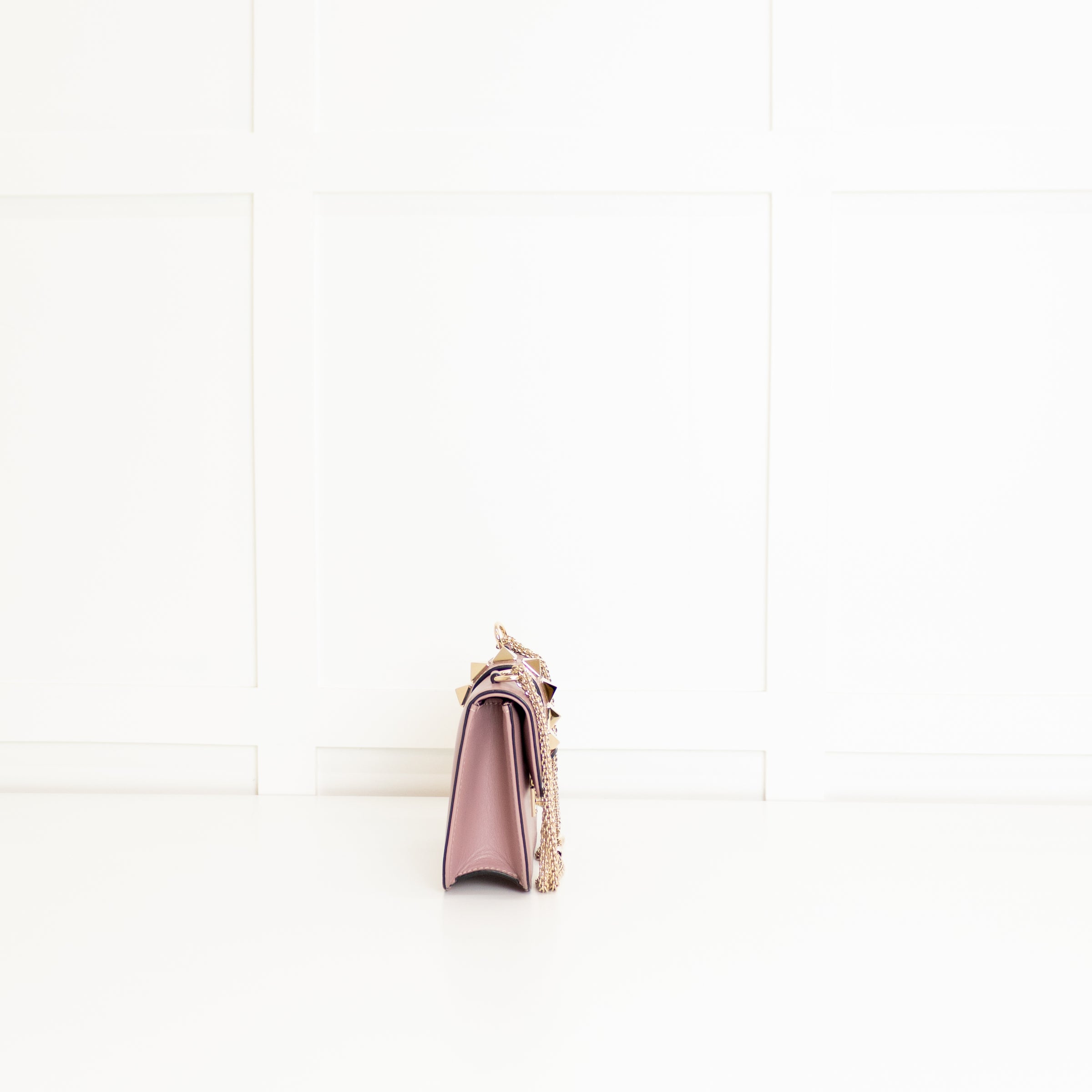 Valentino pink smooth leather small Rockstud bag with gold-tone metal hardware, a chain strap which can be worn doubled up as a shoulder strap, or long. Embellished with the house's iconic large square Rockstud studs. Finished with a small front flap closure, push lock, and opens onto one main interior compartment with small internal pockets. With the original dust bag.