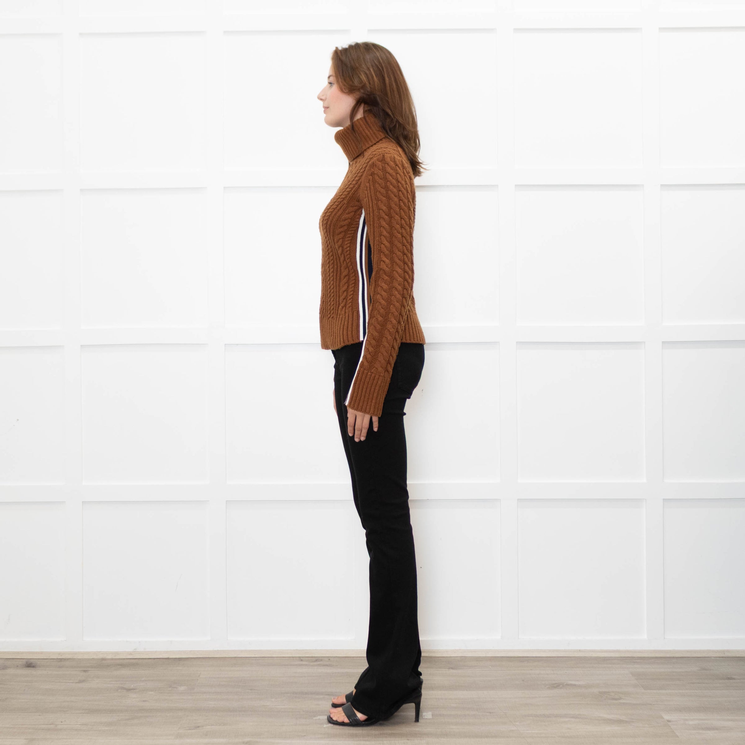 Veronica Beard brown cable knit polo neck jumper with white and navy side stripe detailing. In a fitted cut. New with tags RRP $478.