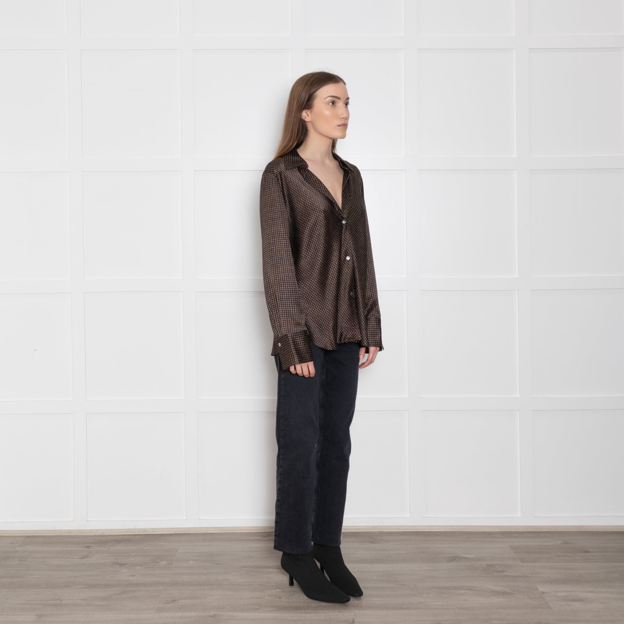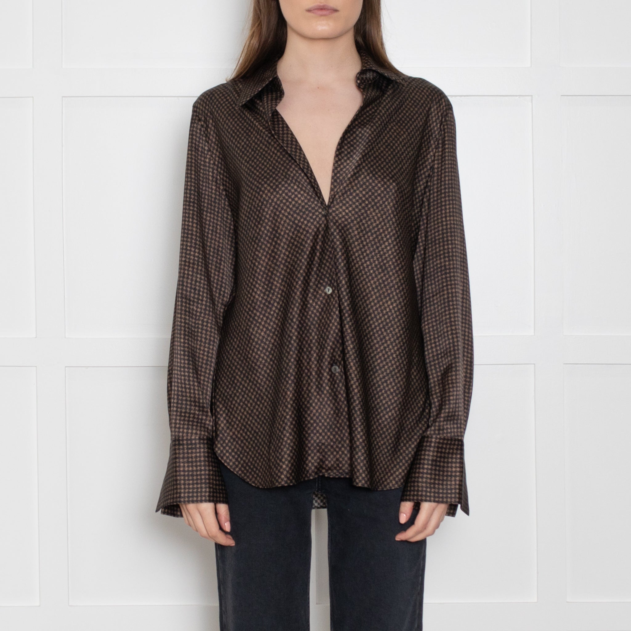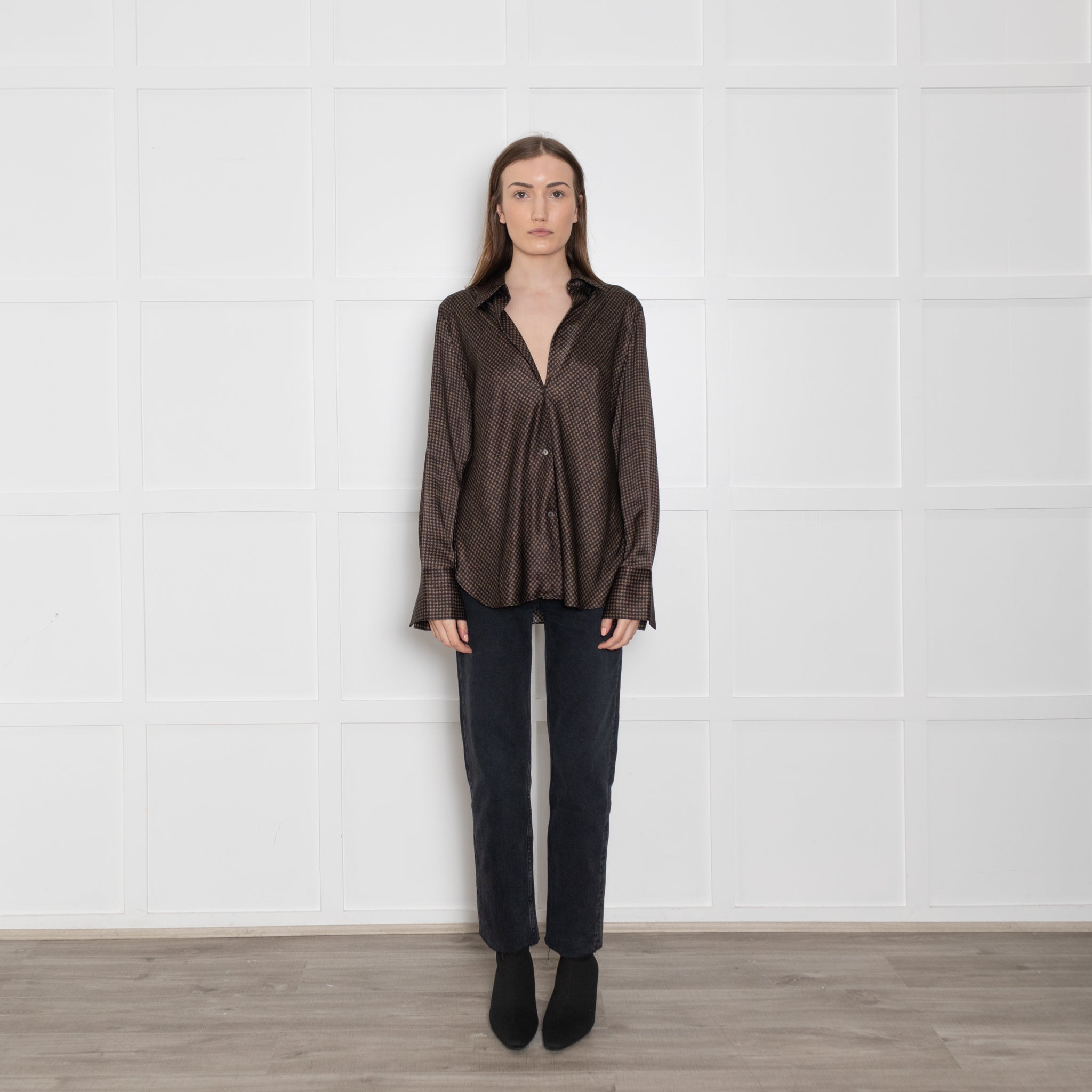 Vince black and brown printed silk blouse with a V-neckline, collar, and button-down front.