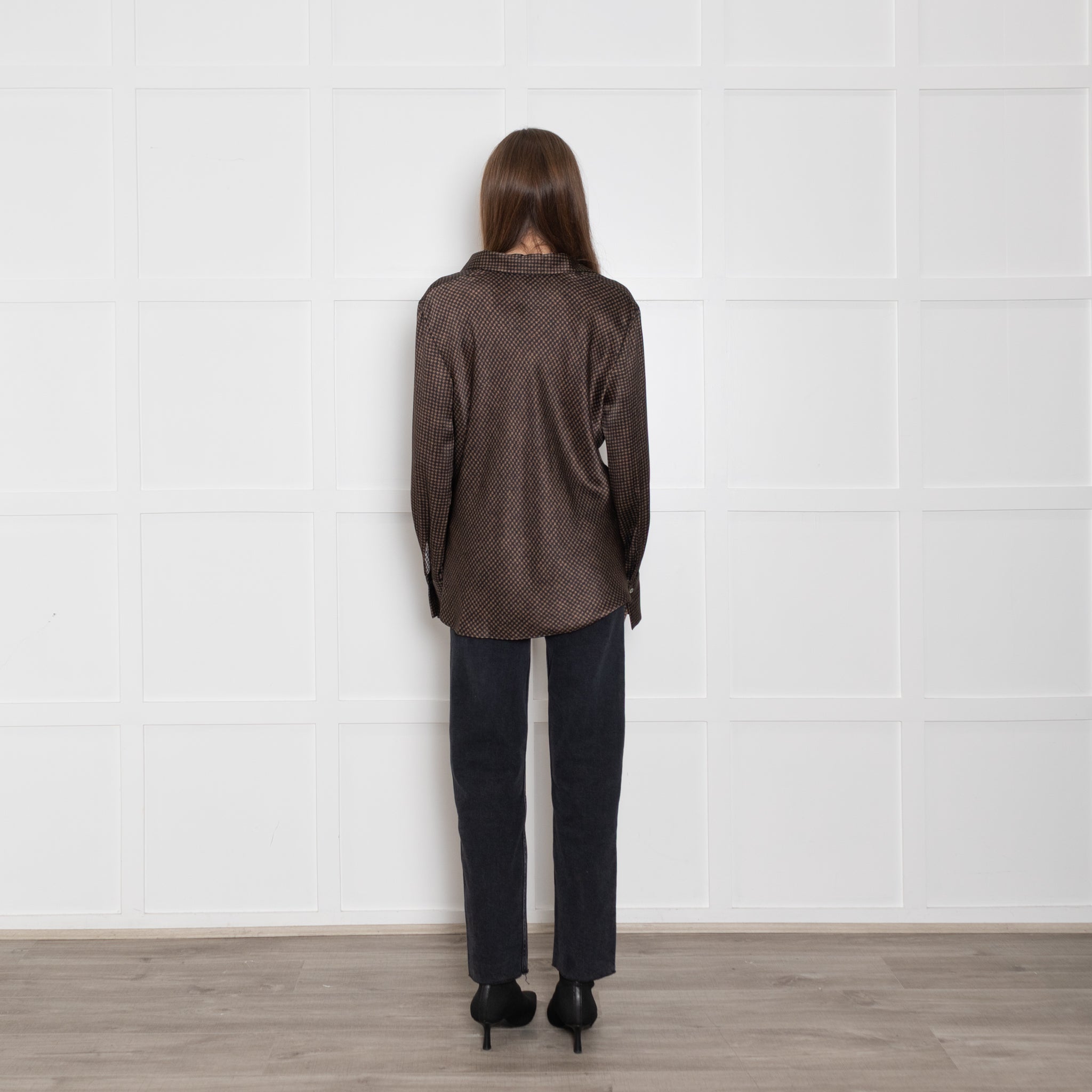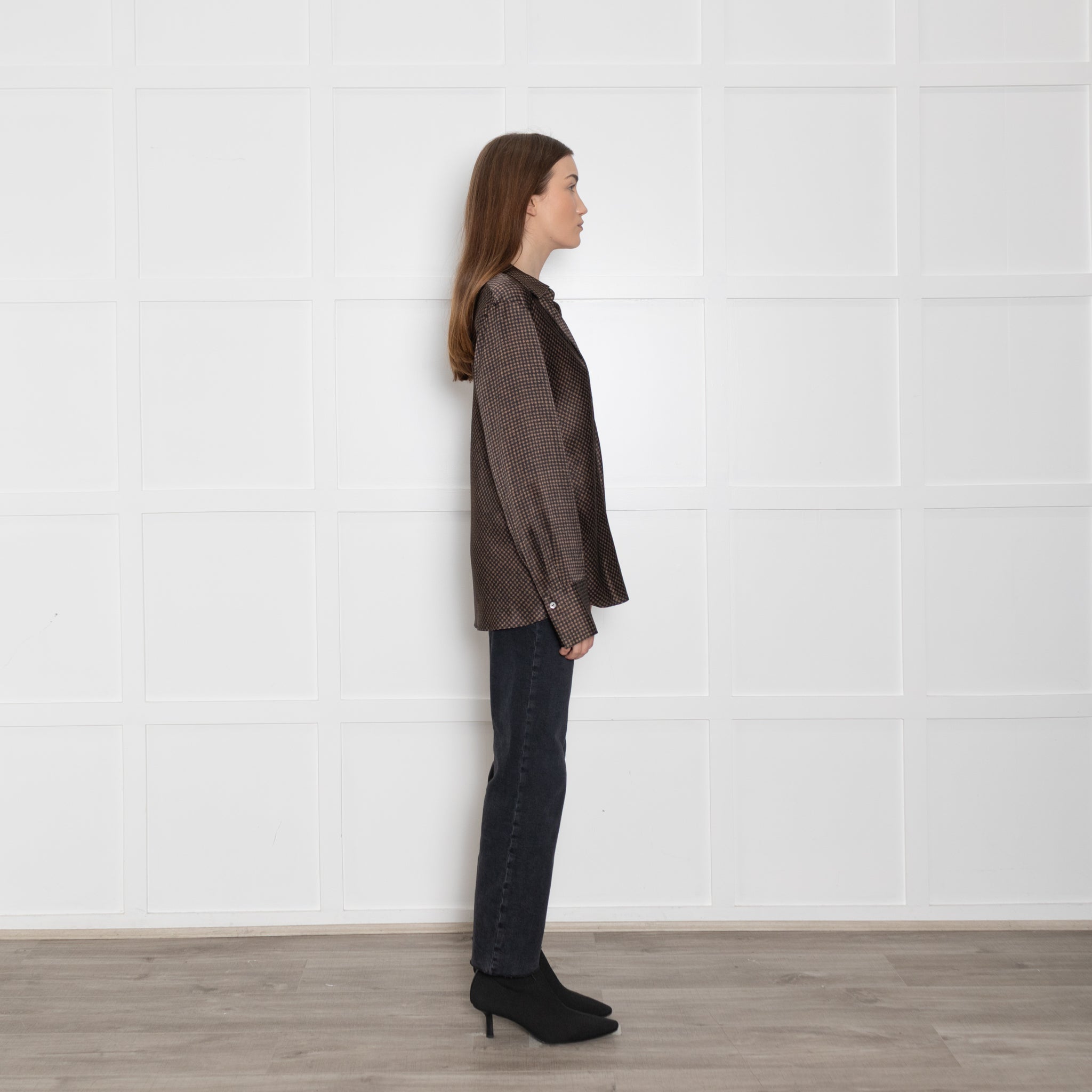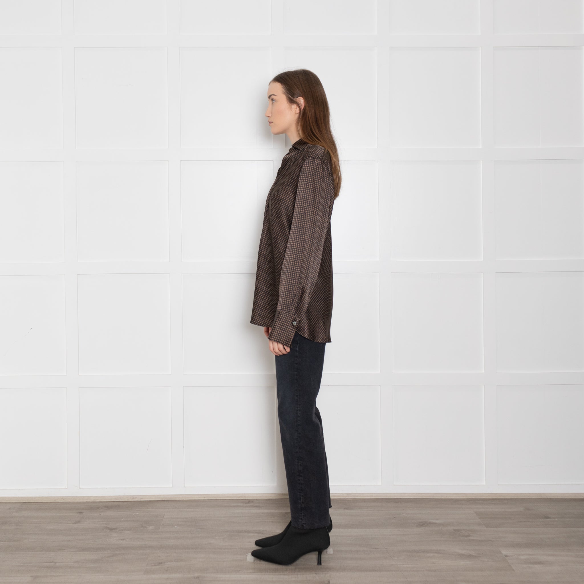 Vince black and brown printed silk blouse with a V-neckline, collar, and button-down front.