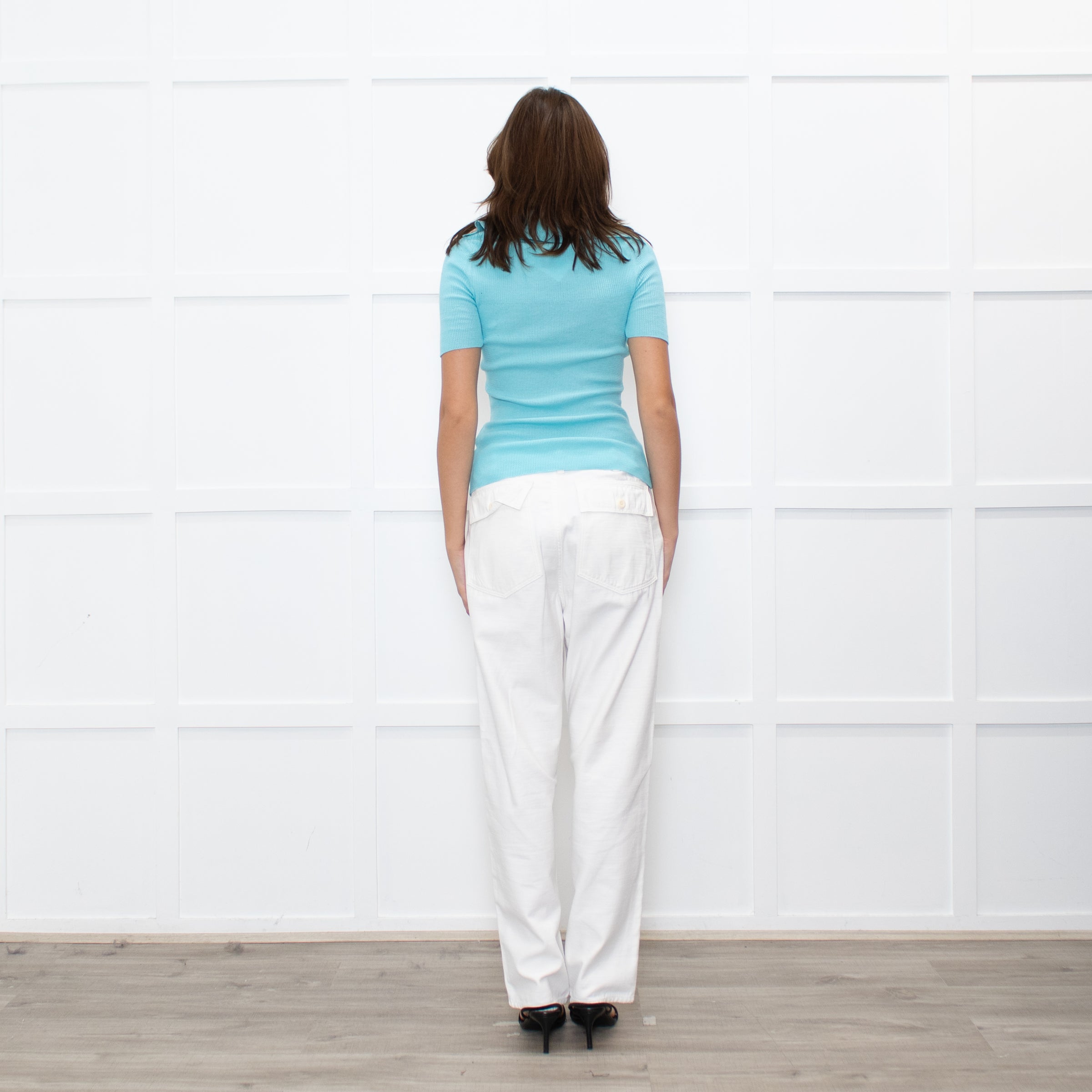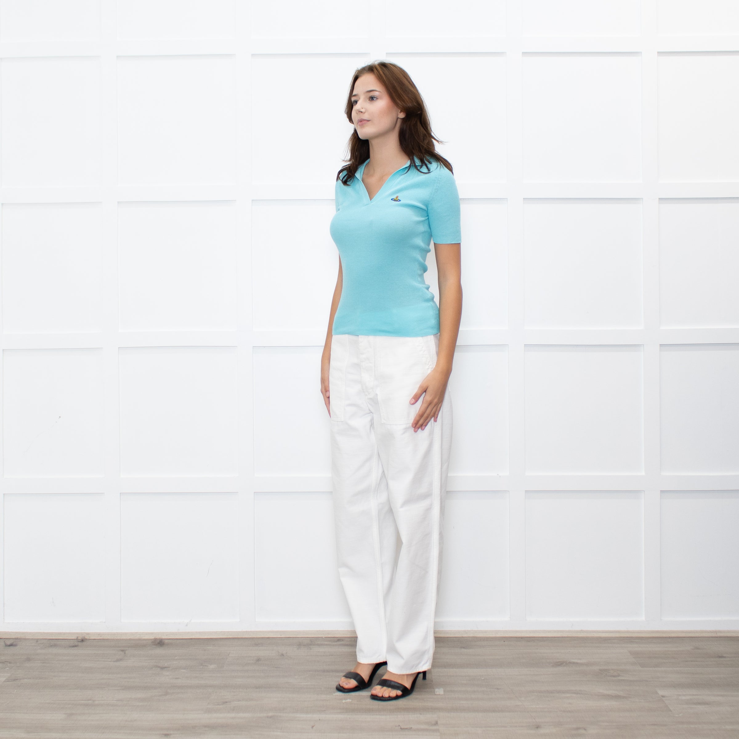 Vivienne Westwood turquoise knit with a collared neckline and short sleeves. A fitted cut for a flattering silhouette.