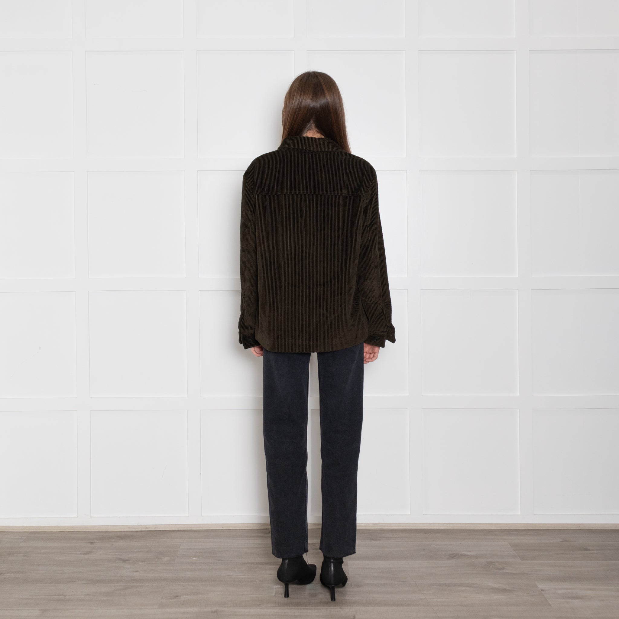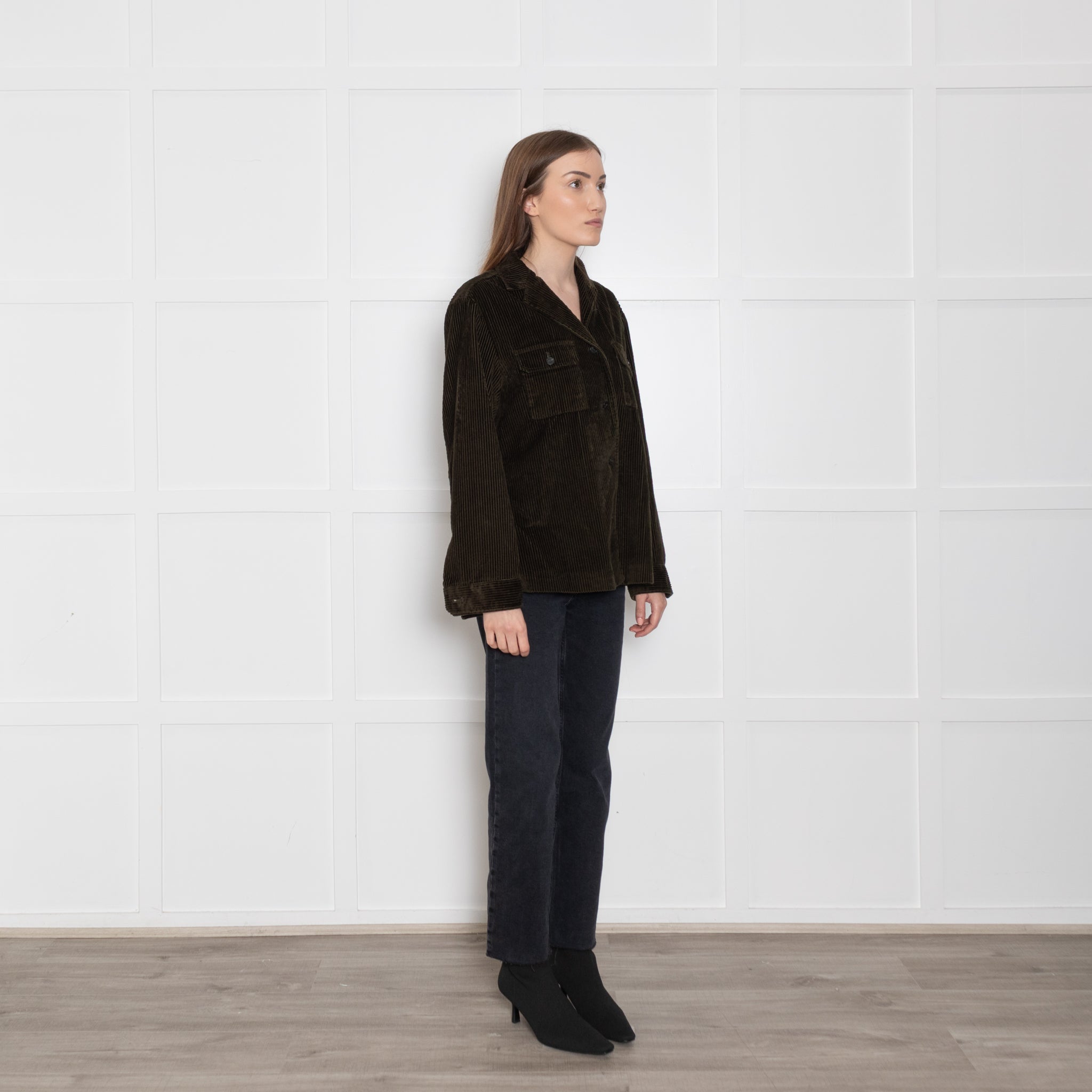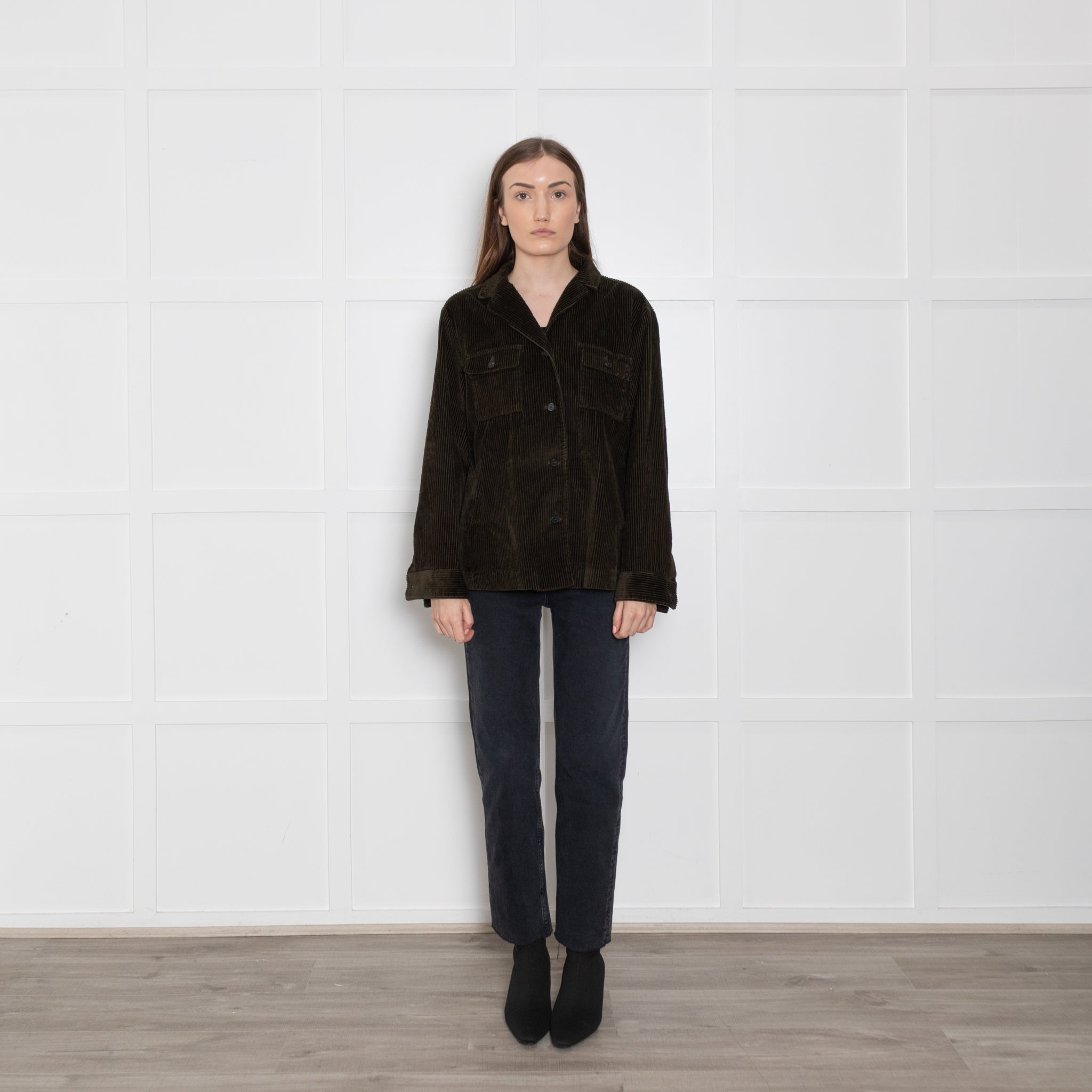 Weekend Max Mara dark green corduroy shacket, crafted with a soft cotton fabric, ribbed design, with a button-up front and two front chest pockets.
