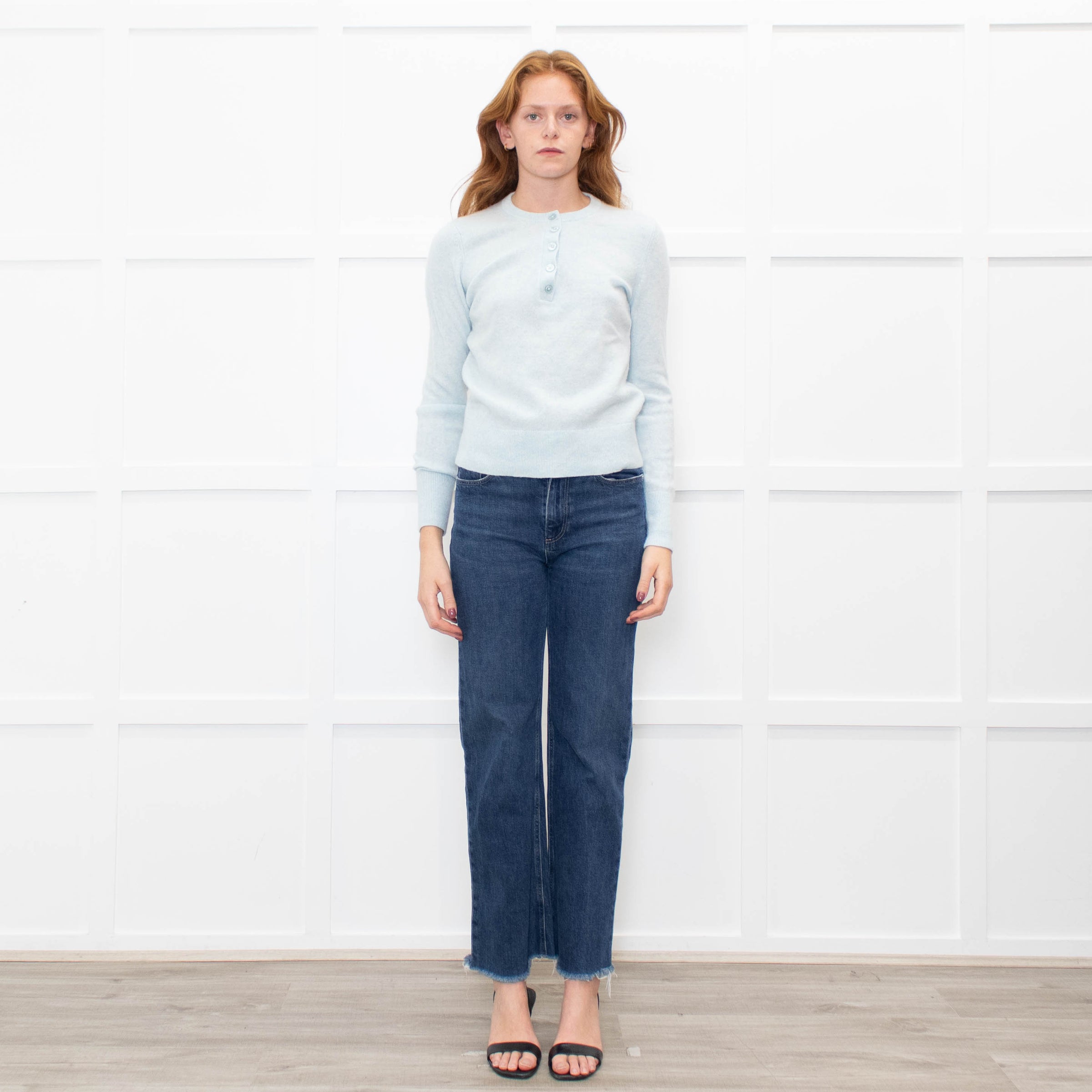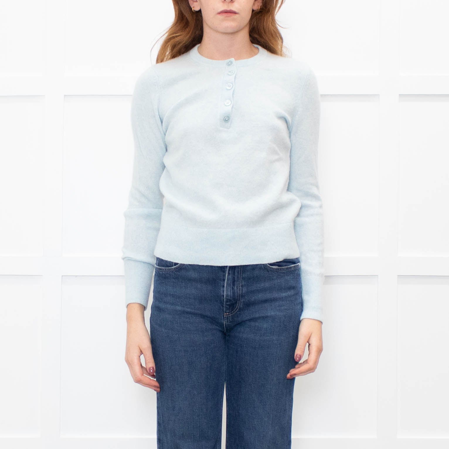 White + Warren pastel blue cashmere jumper with a quarter button up front, a rounded neckline, long sleeves, and ribbed knit trim.