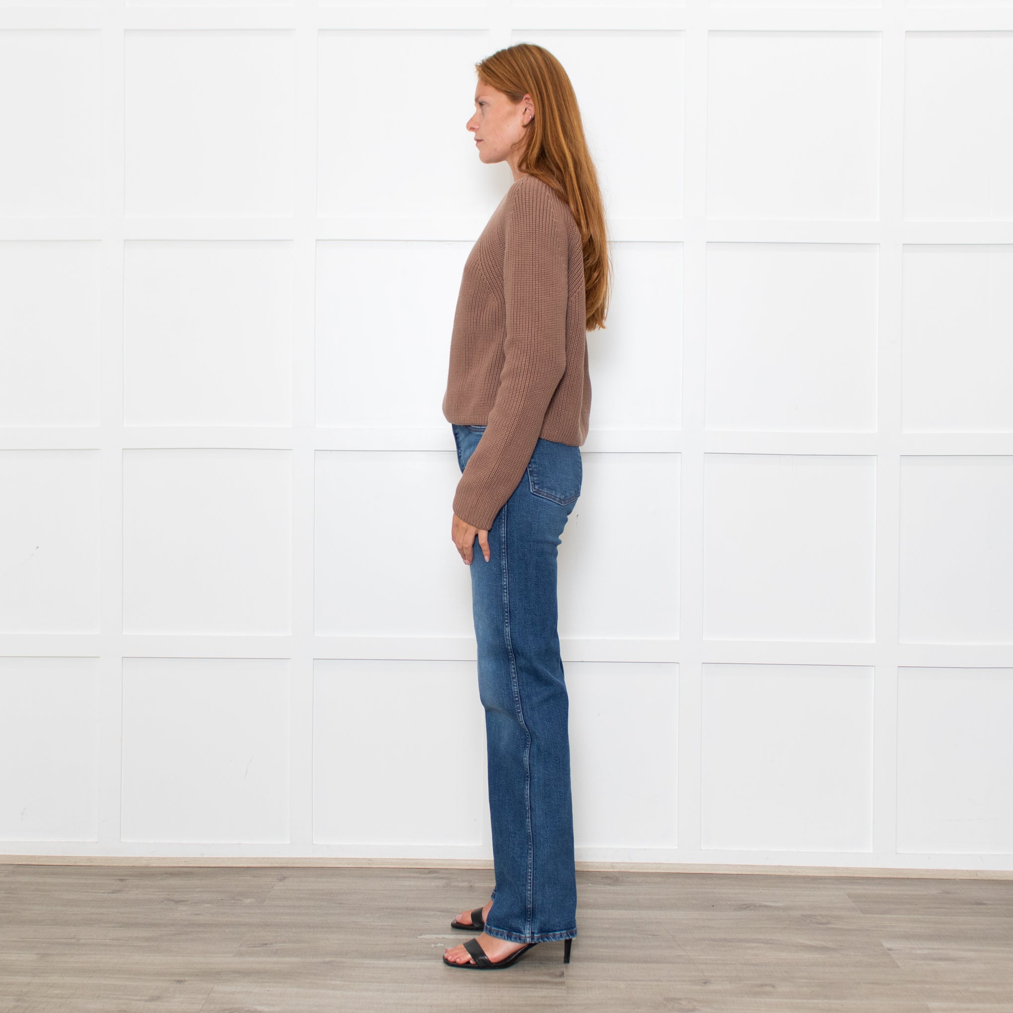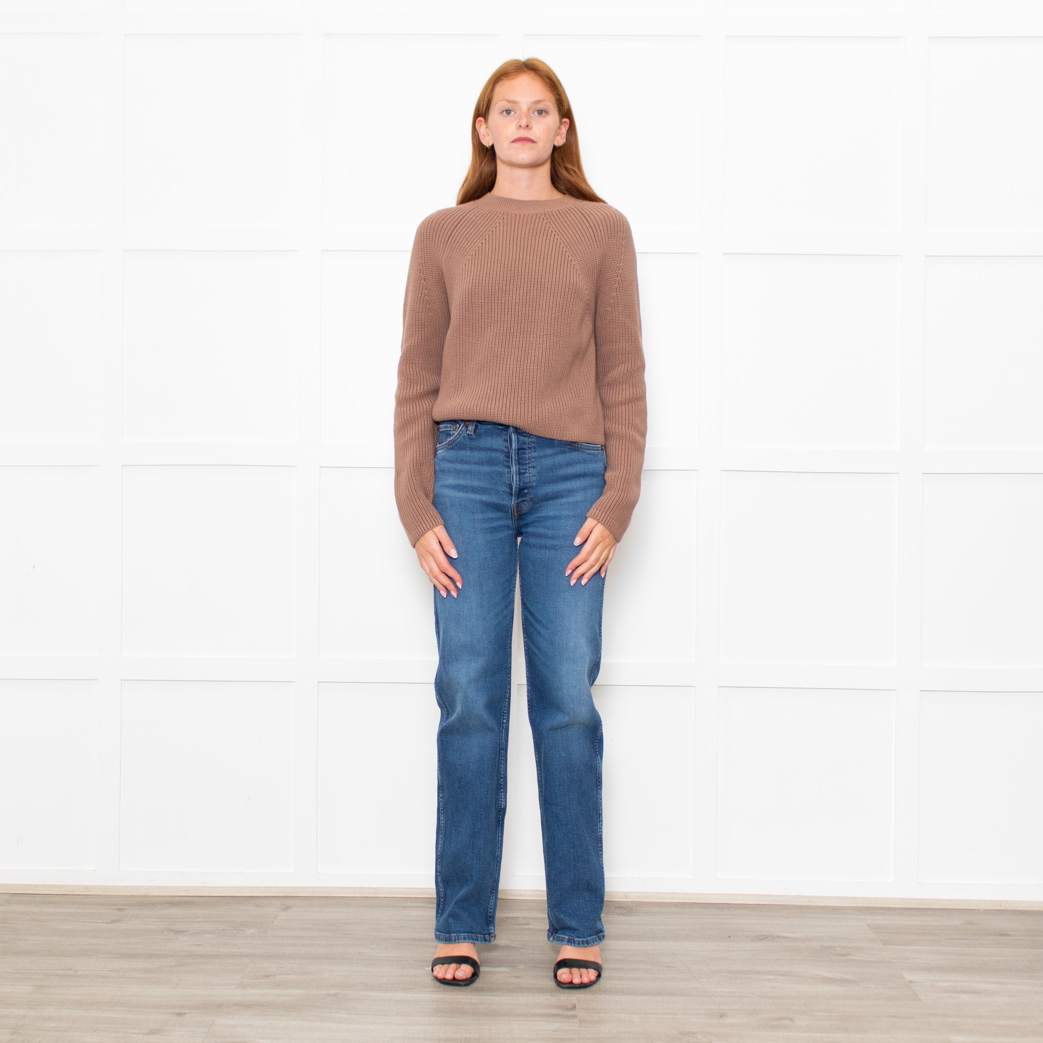 White + Warren suede warm brown tone cotton ribbed knit chunky jumper in a cotton yarn with long raglan sleeves, and a ribbed neckline. New with tags