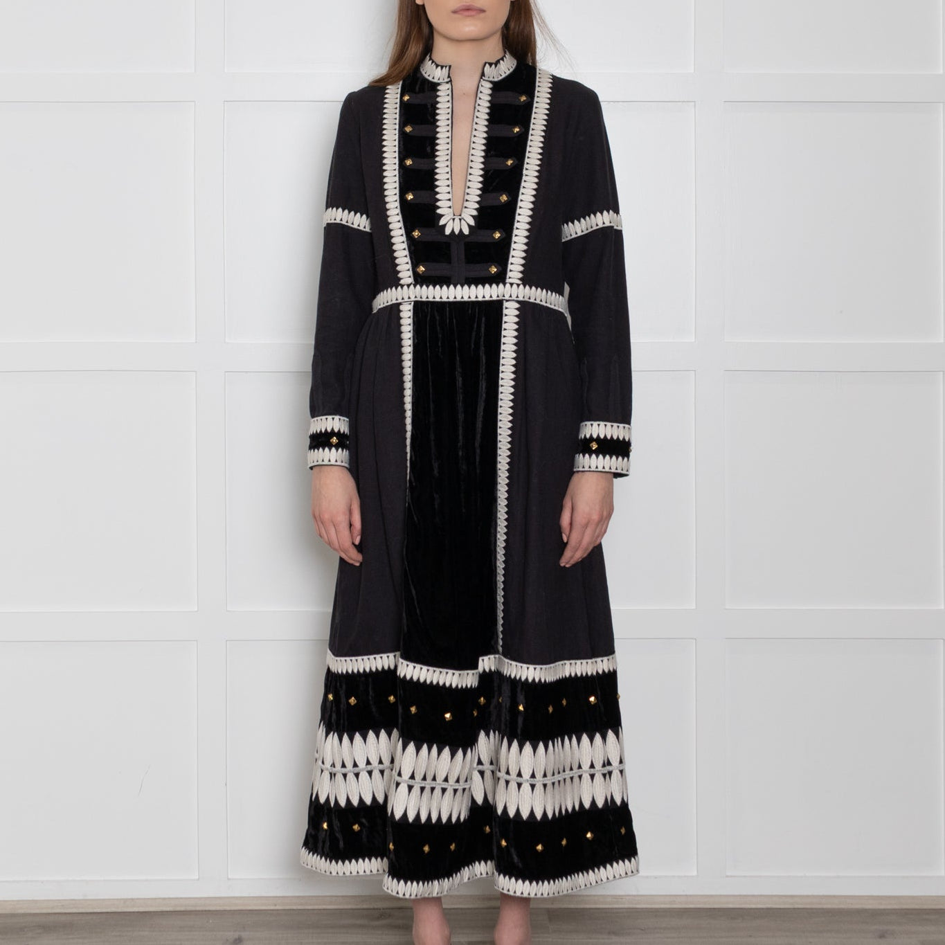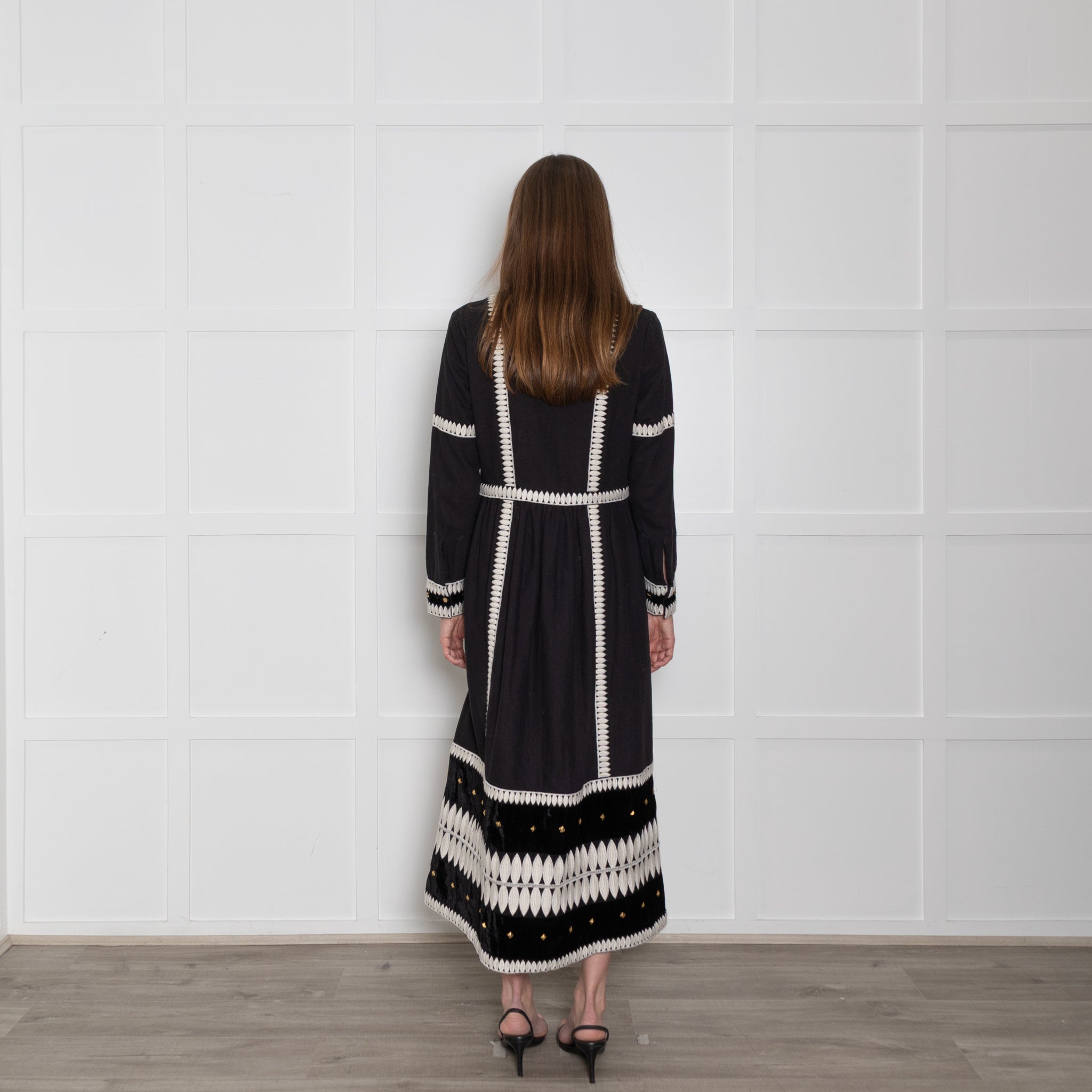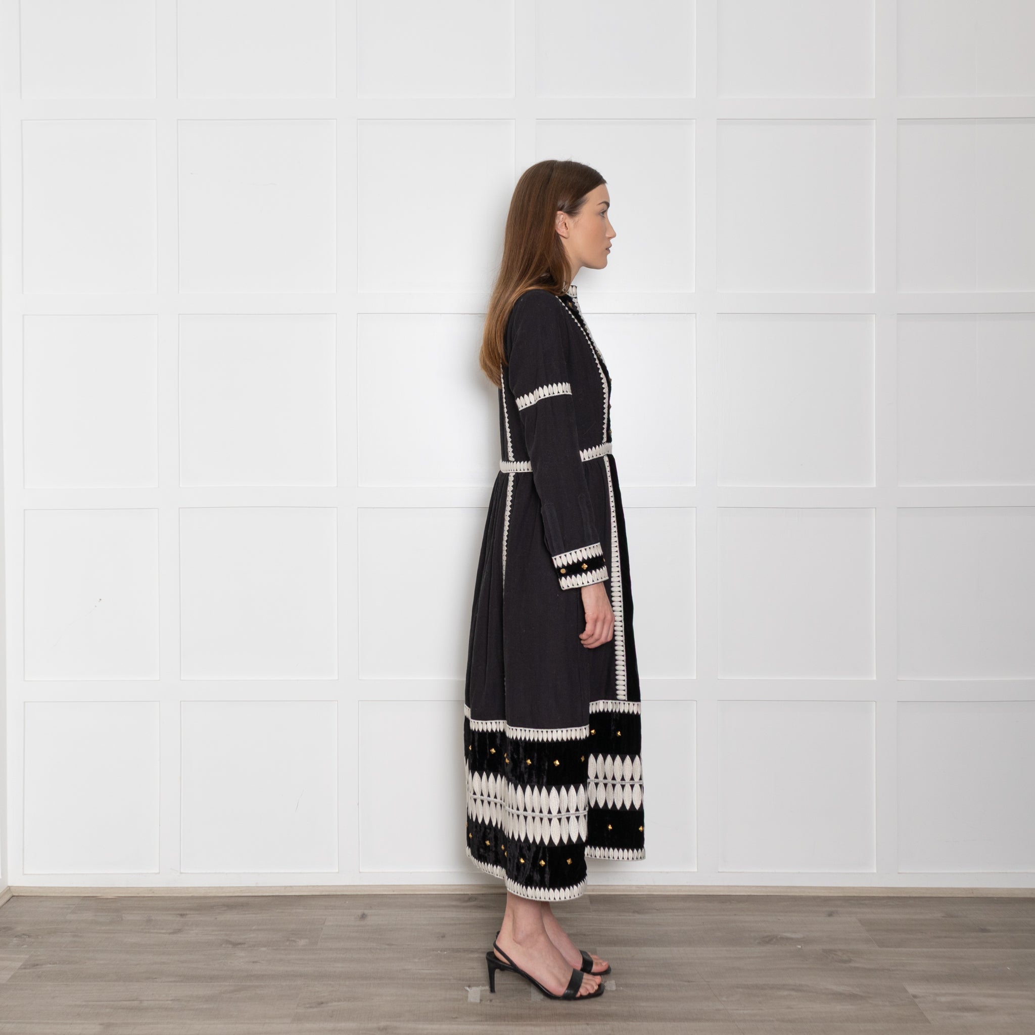 Wiggy Kit long-sleeve black and marais cotton dress, featuring a lovely white embroidered exterior design, with square gold accents on the neckline and sleeves for a stunning, elegant look. The dress has a V-neckline and a large velvet exterior fabric patch.