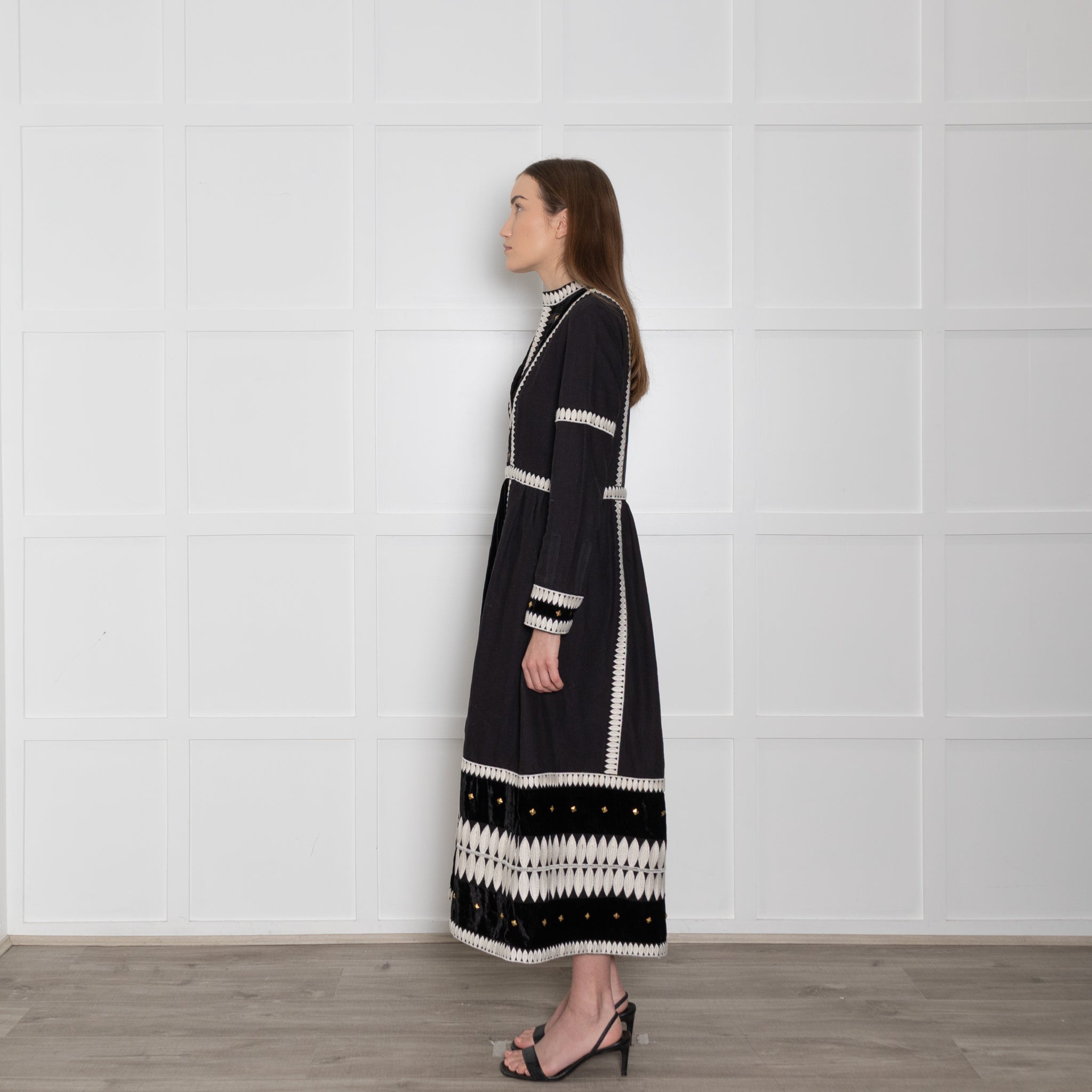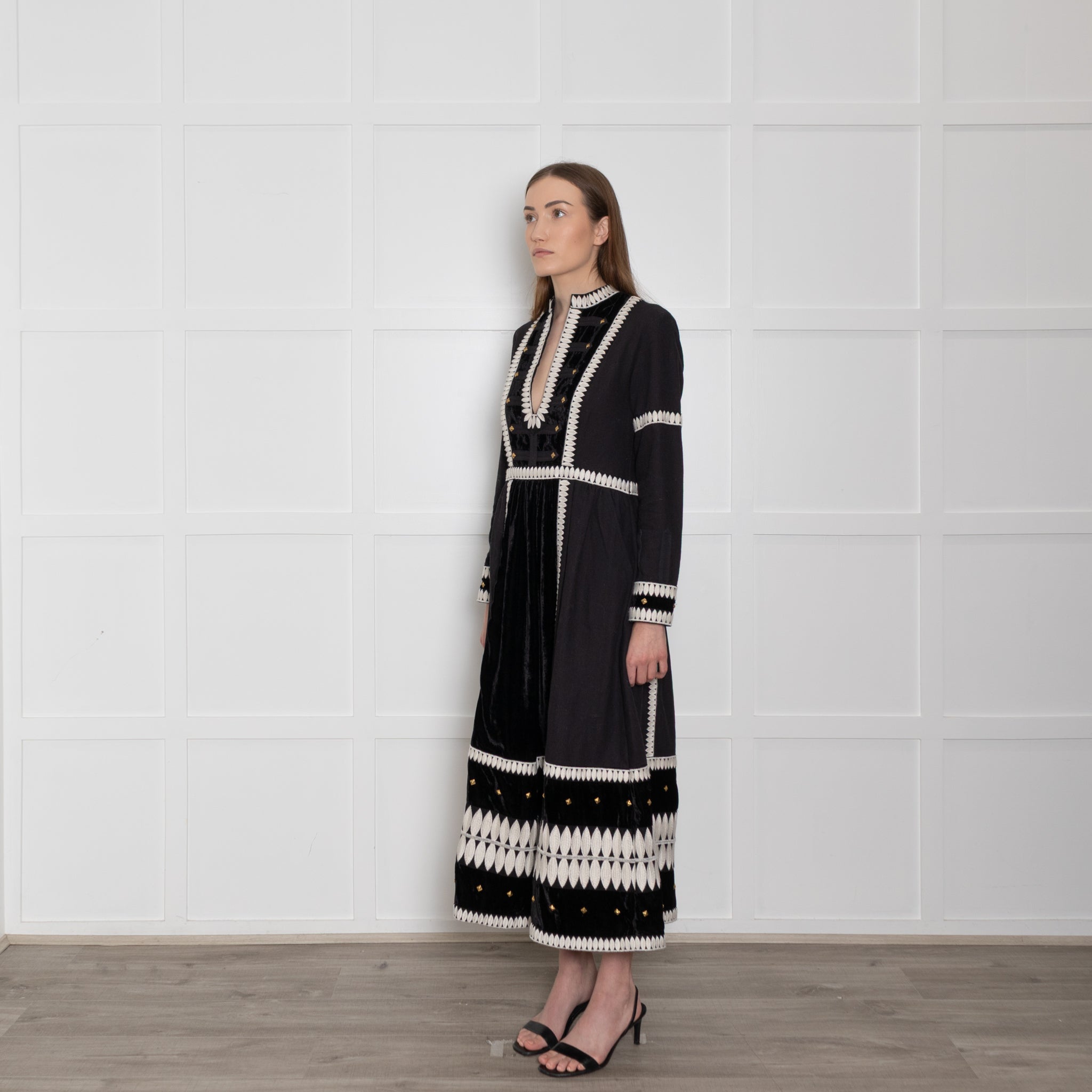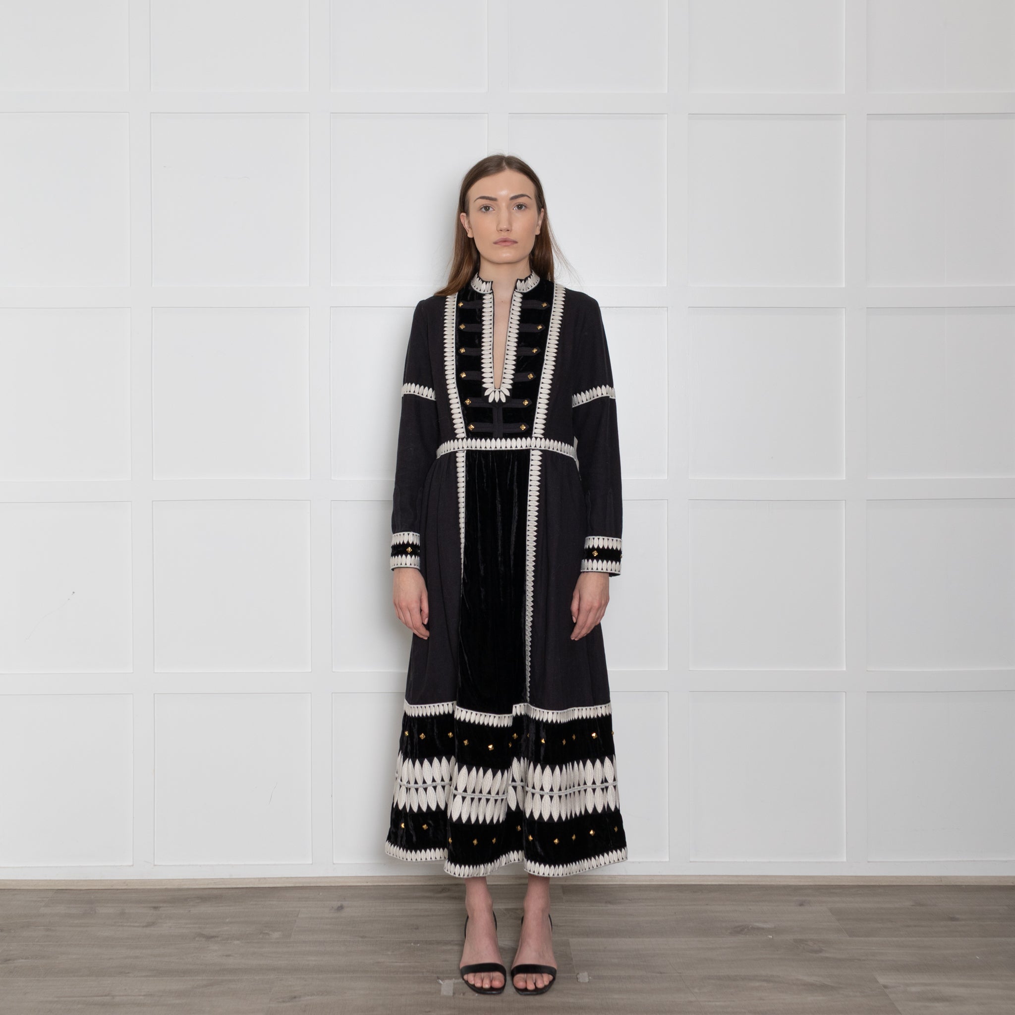 Wiggy Kit long-sleeve black and marais cotton dress, featuring a lovely white embroidered exterior design, with square gold accents on the neckline and sleeves for a stunning, elegant look. The dress has a V-neckline and a large velvet exterior fabric patch.