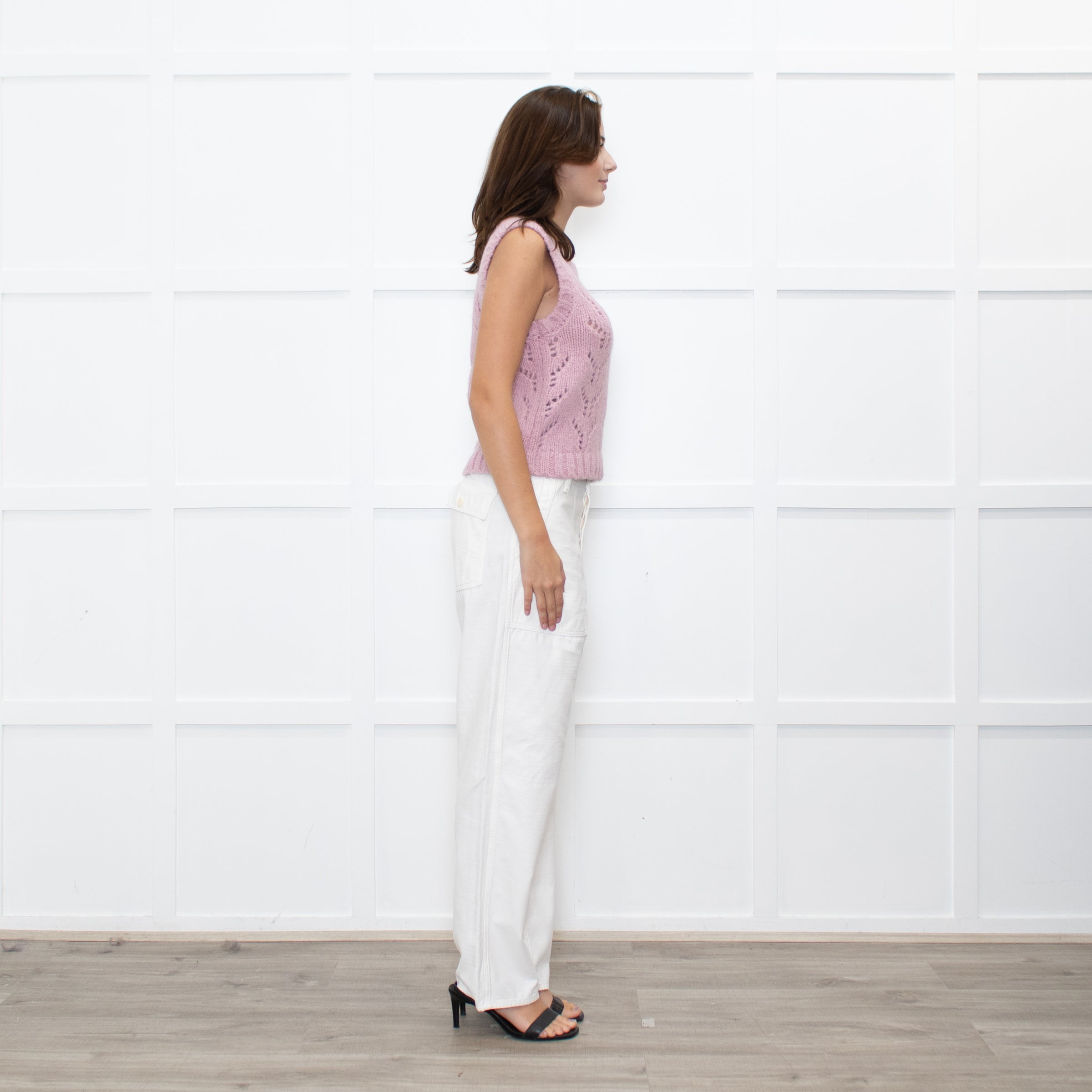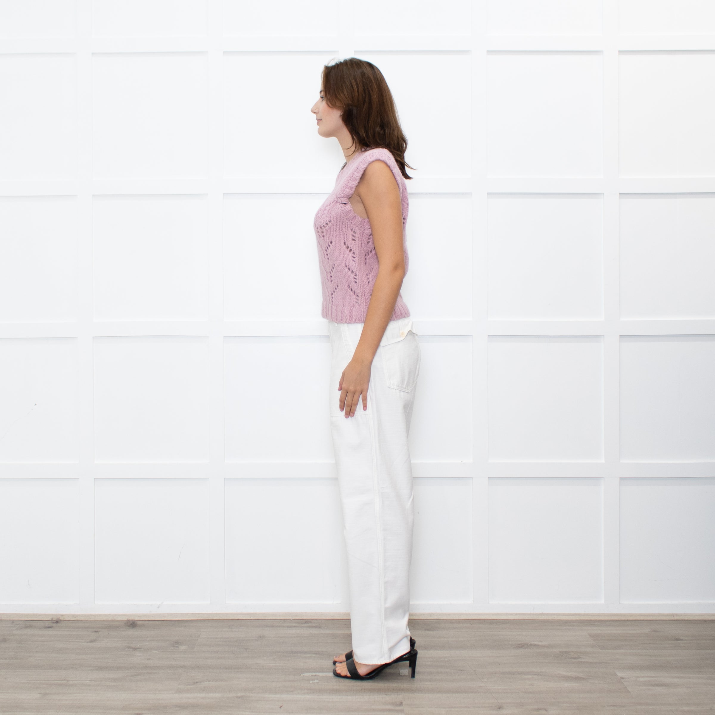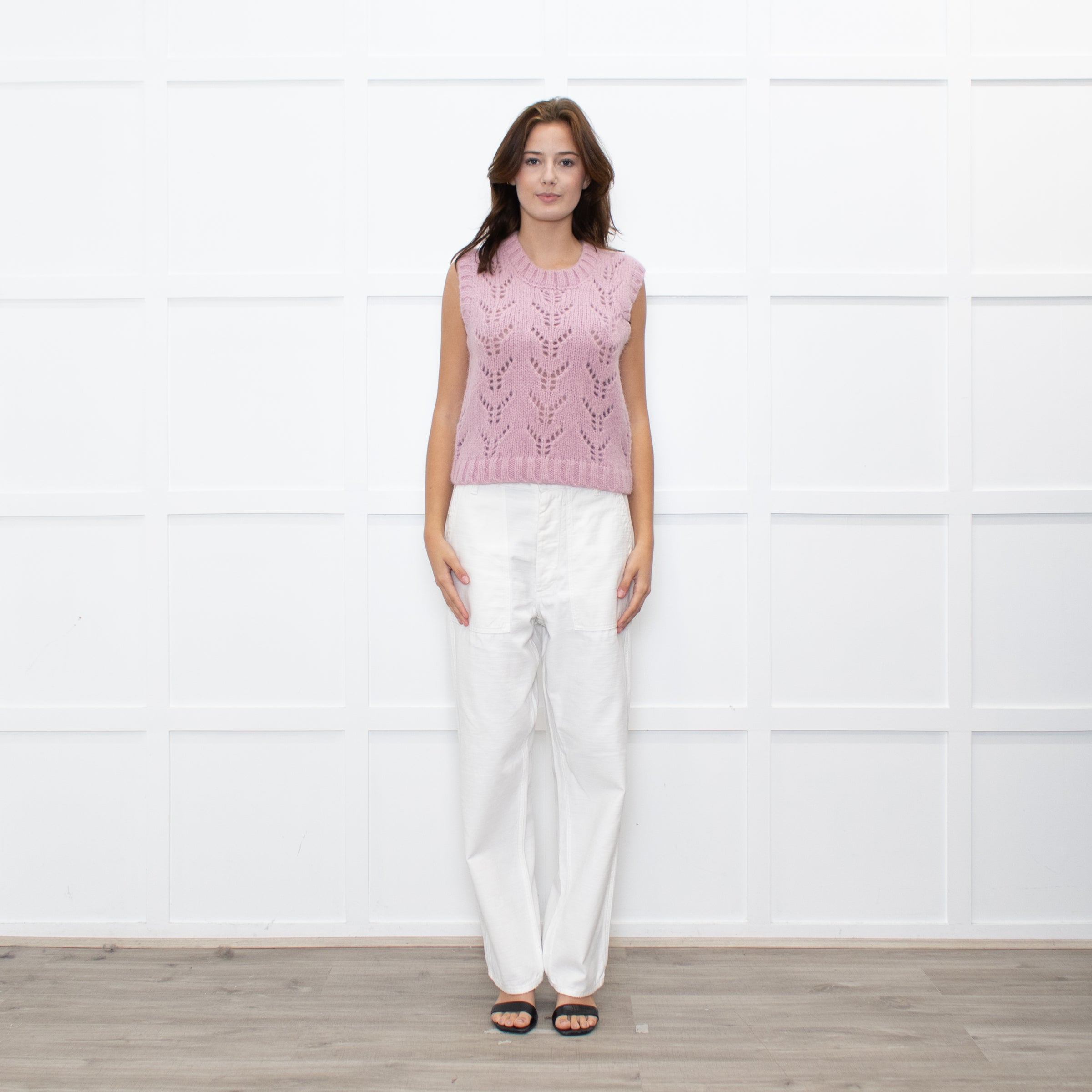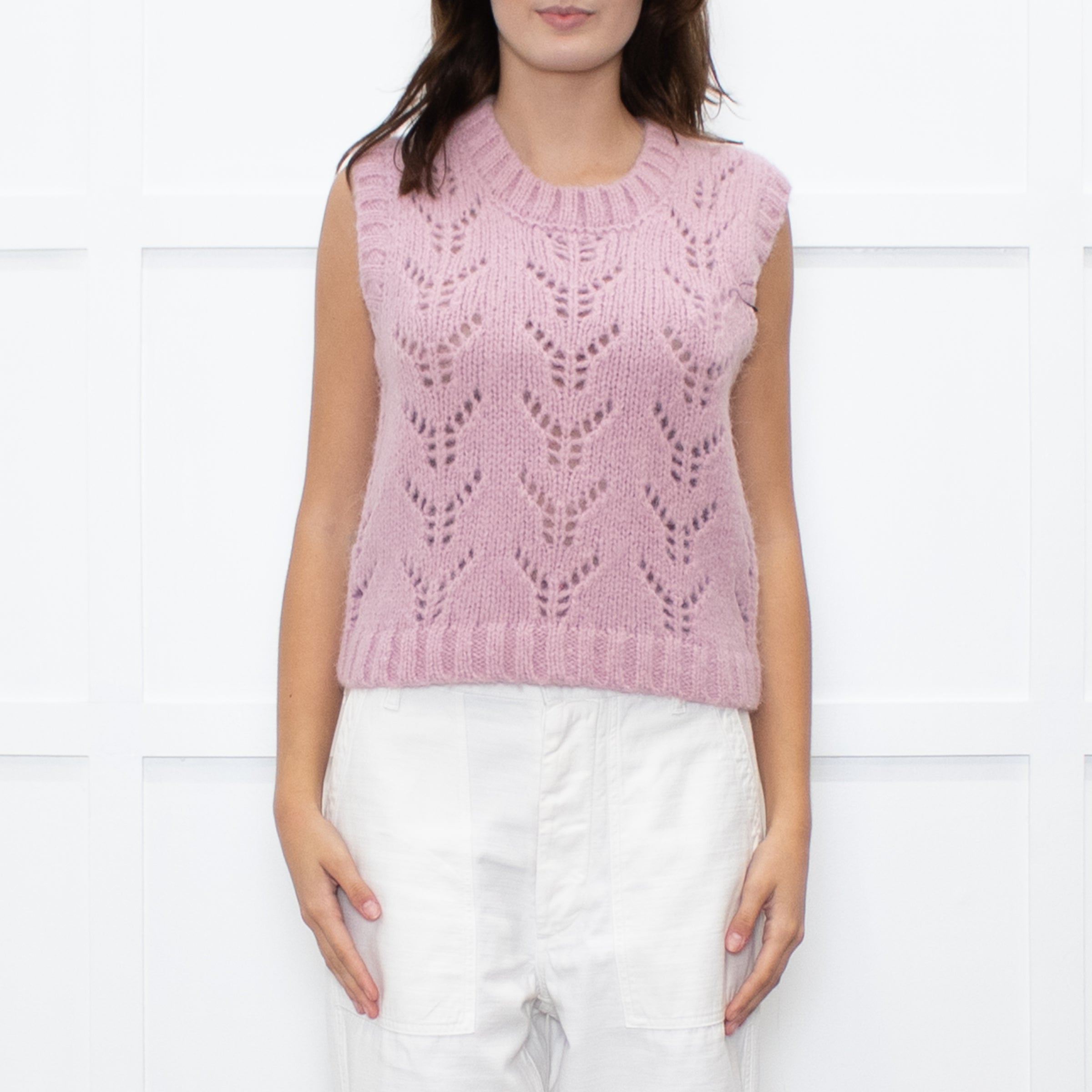 Wyse dusty pink alpaca-knit tank top with cut-out pattern. Designed with a sleeveless silhouette and ribbed detailing. Brand new with tags.