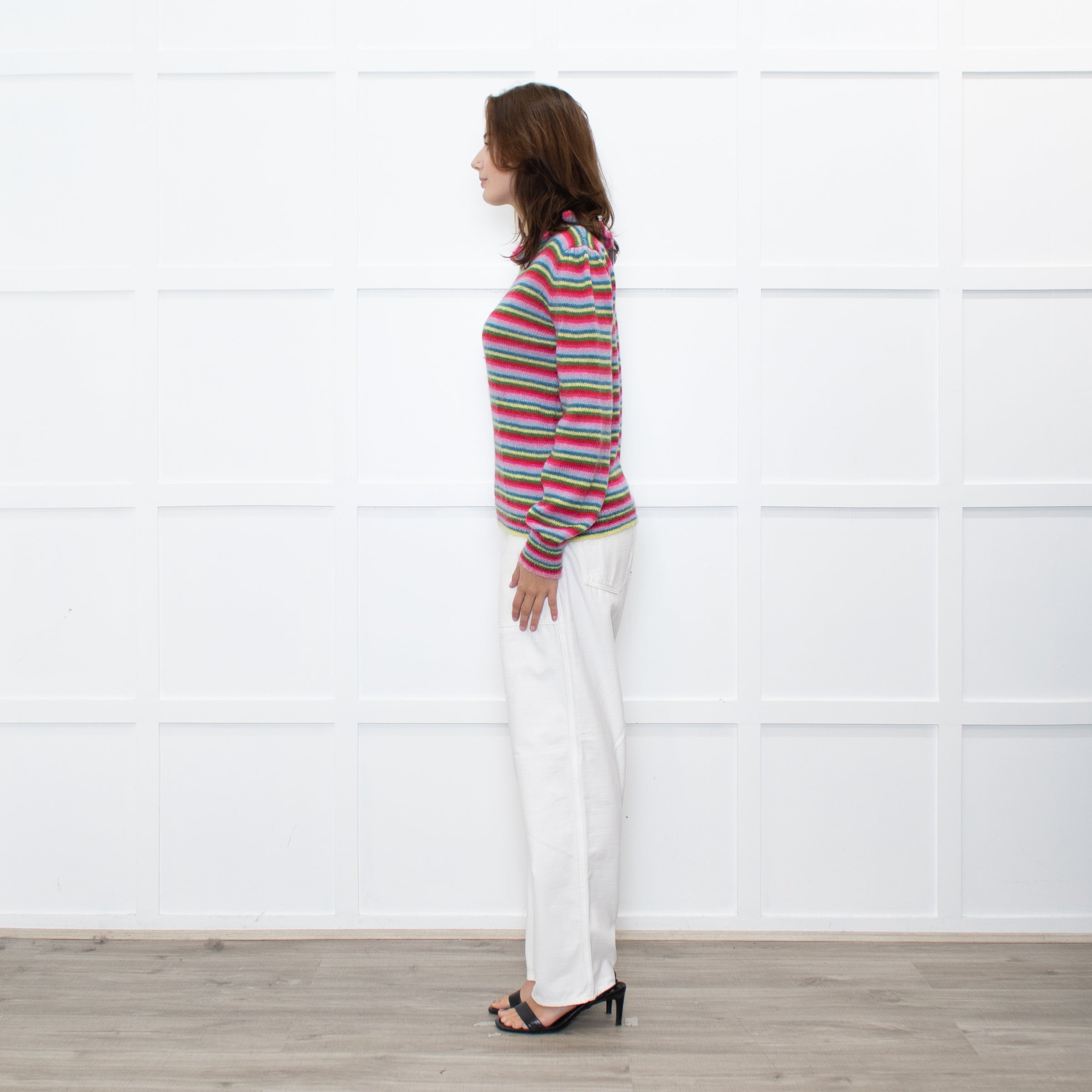 Wyse pink, red, and blue striped mohair sweater with a round, ruffled neckline. Designed with a relaxed fit and ribbed cuffs.