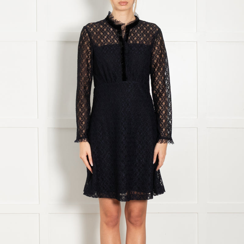 Sandro Navy Blue Lace Velvet Trim Long Sleeve Dress