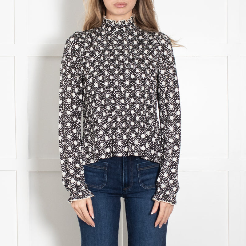 Sandro Black With White Spots Smocked Long Sleeve Top